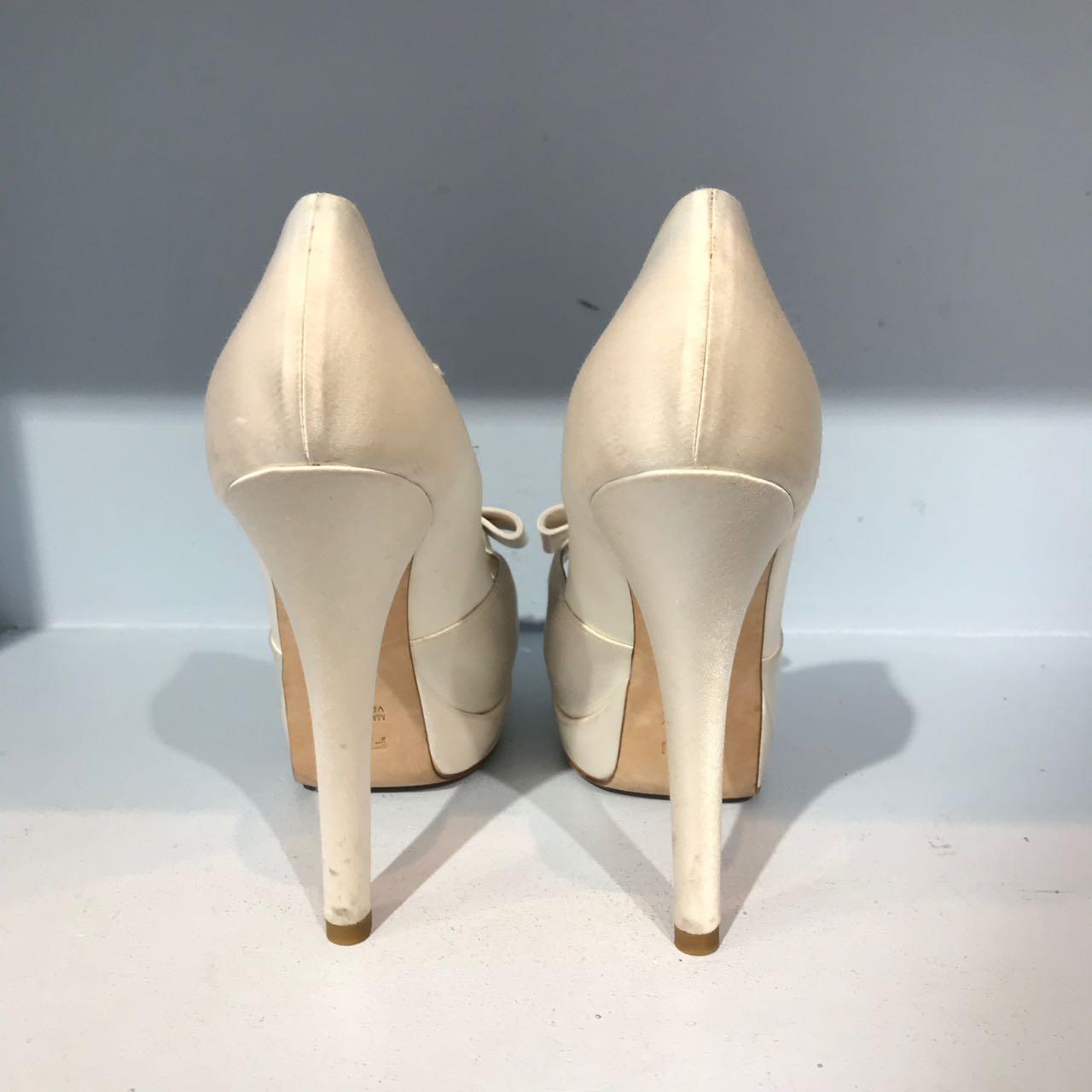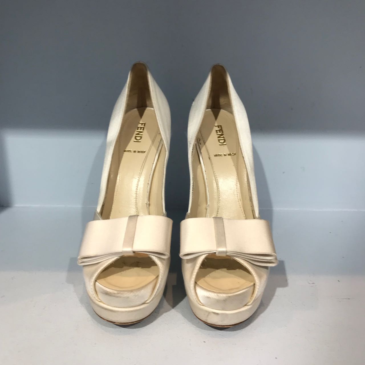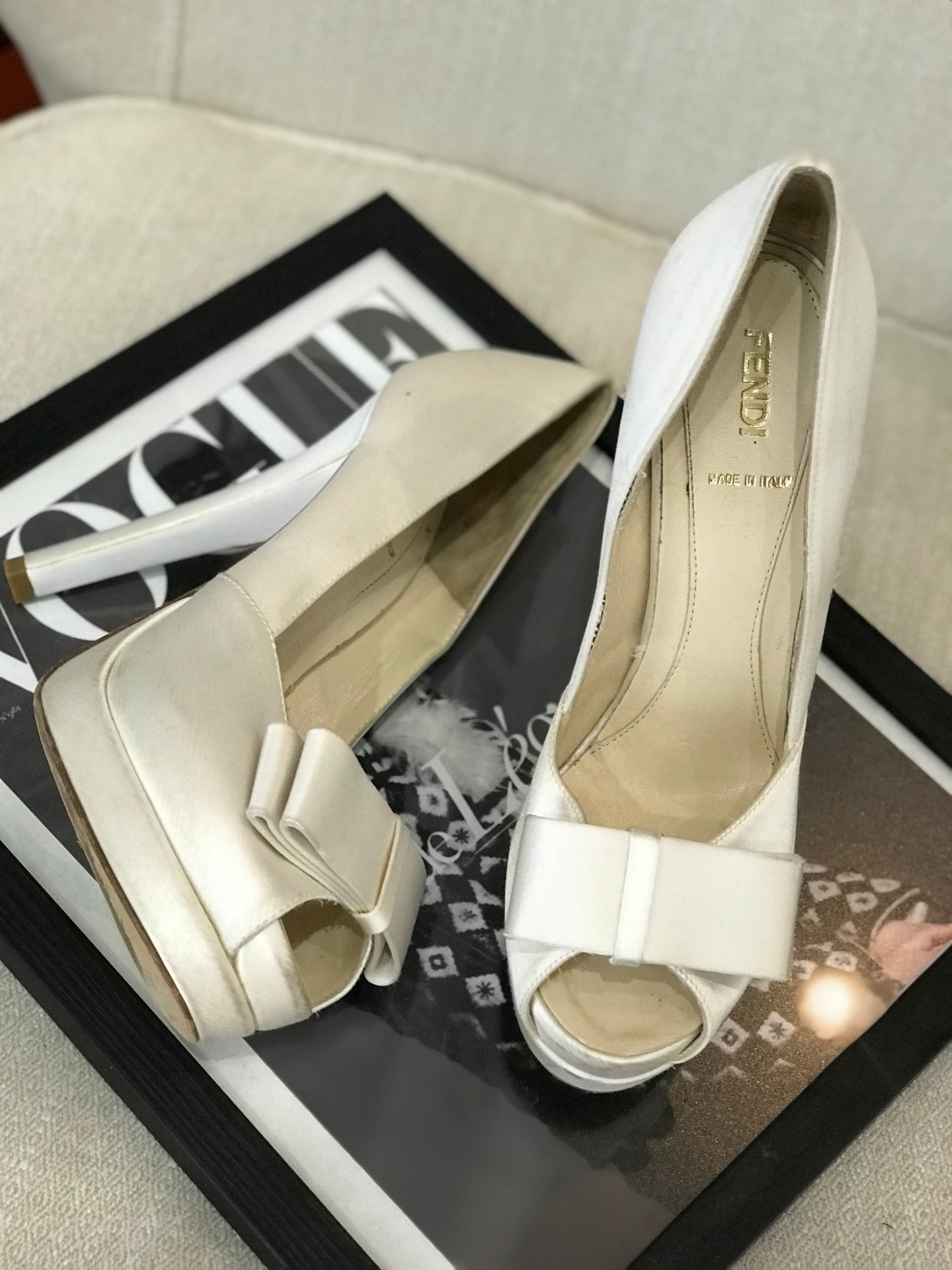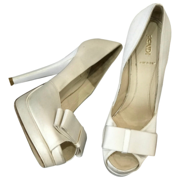Escarpins en satin blanc avec un noeud plat, bouts ouverts.
