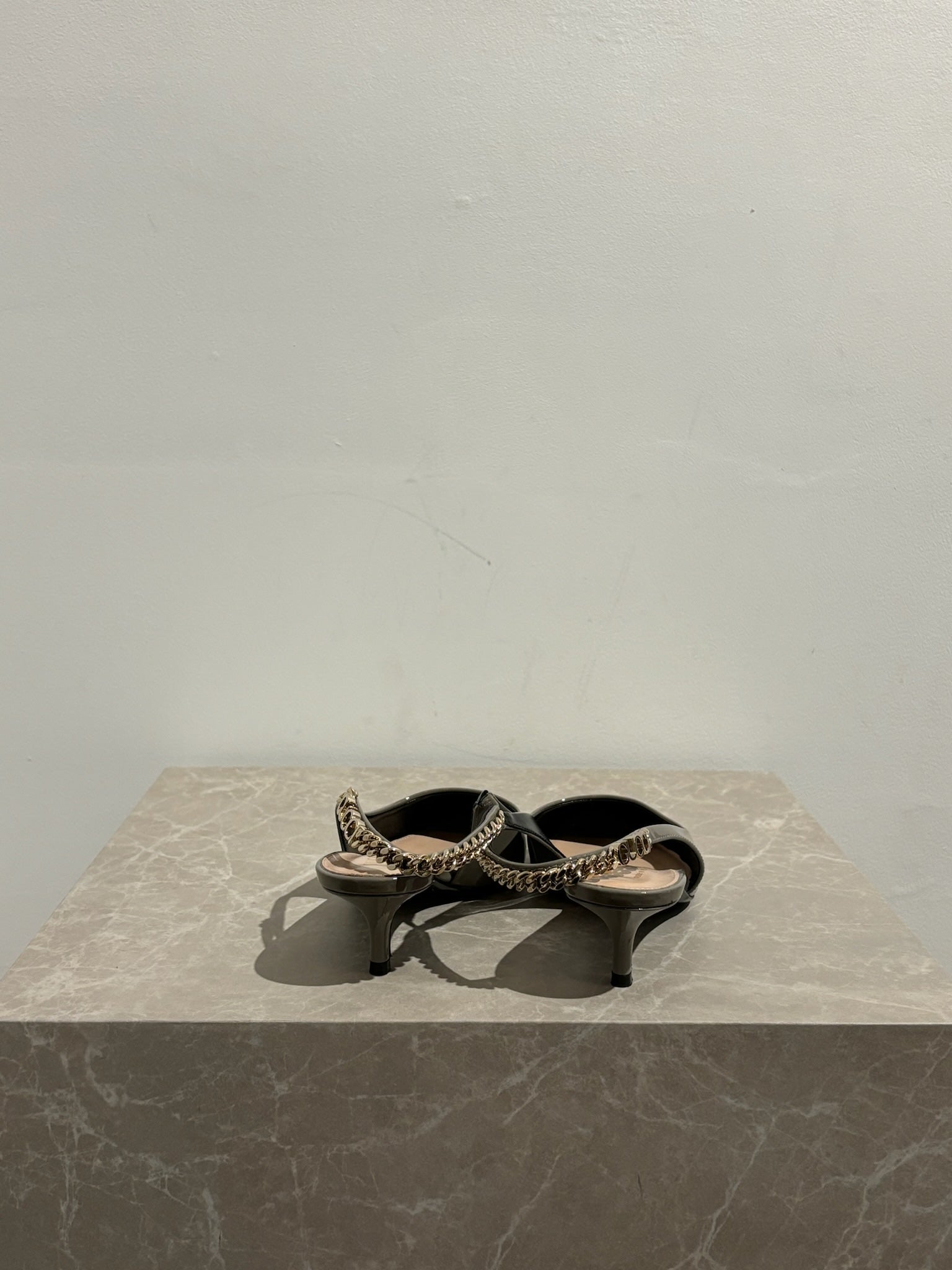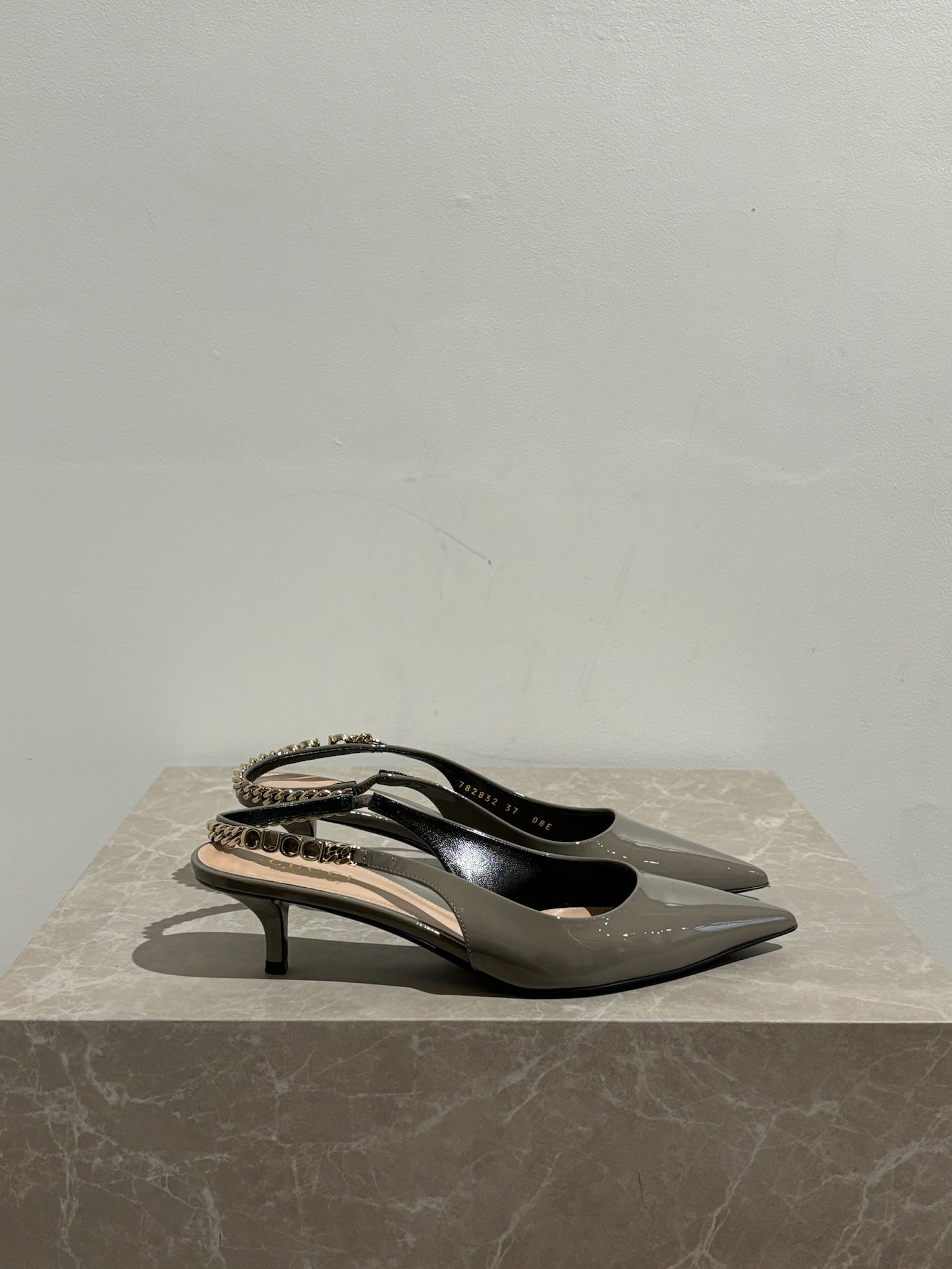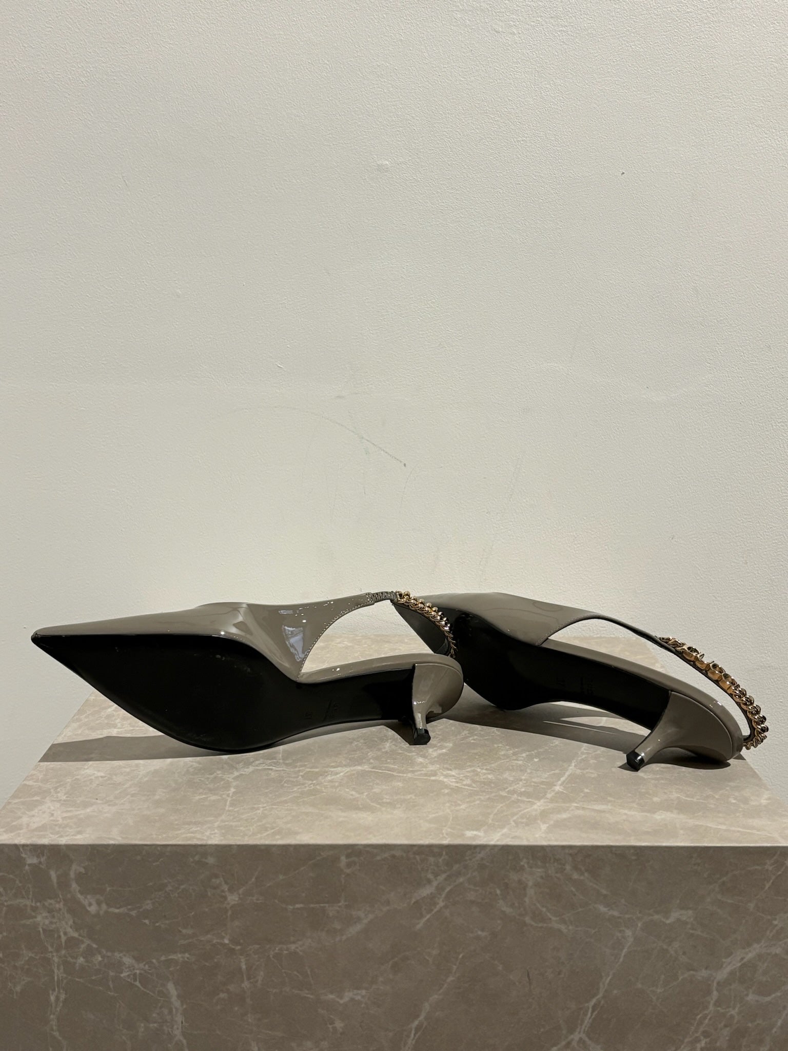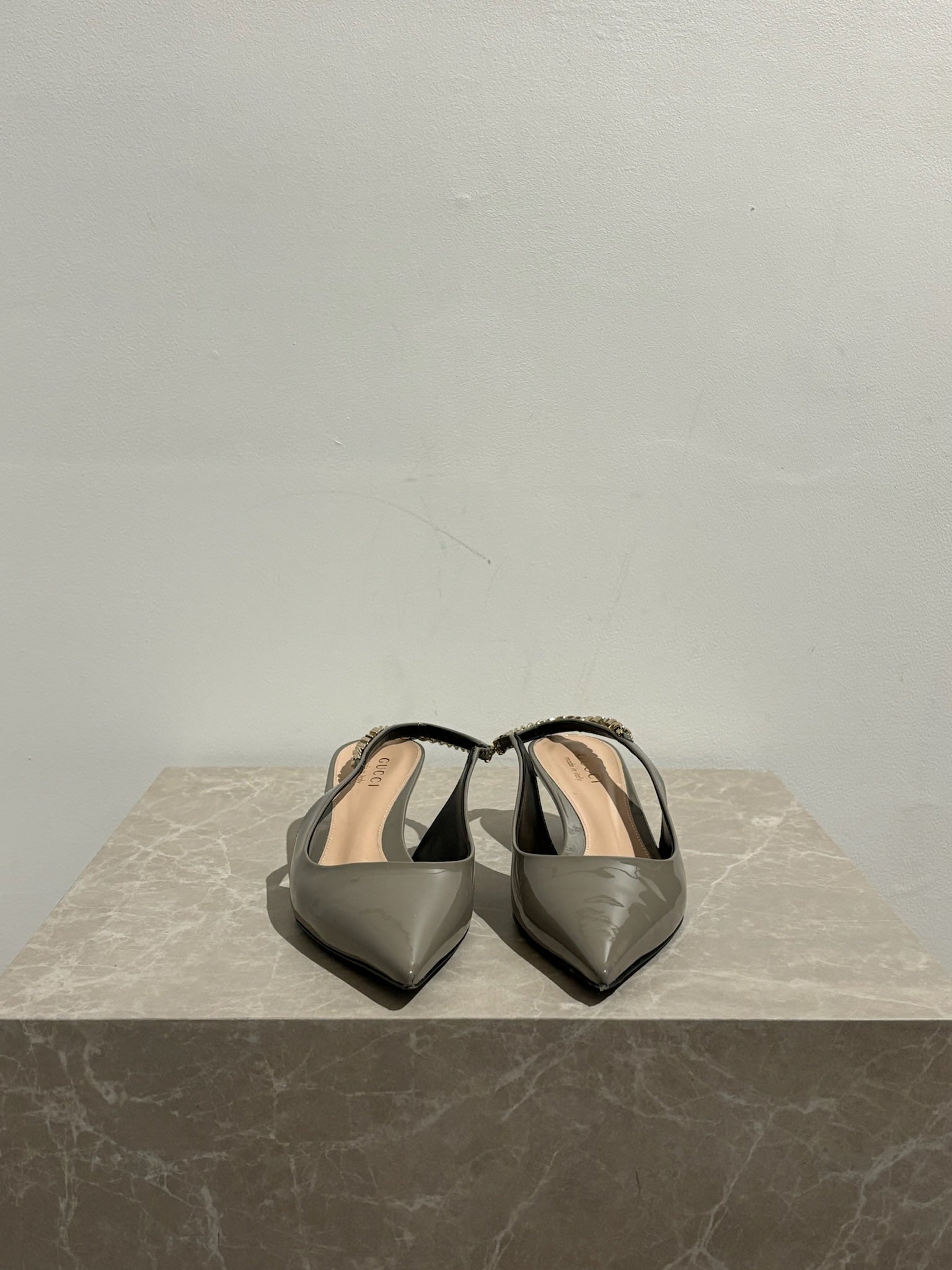 Escarpins en cuir vernis gris avec bouts pointus et bride arrière élastique ornée d'une chaine signée Gucci.