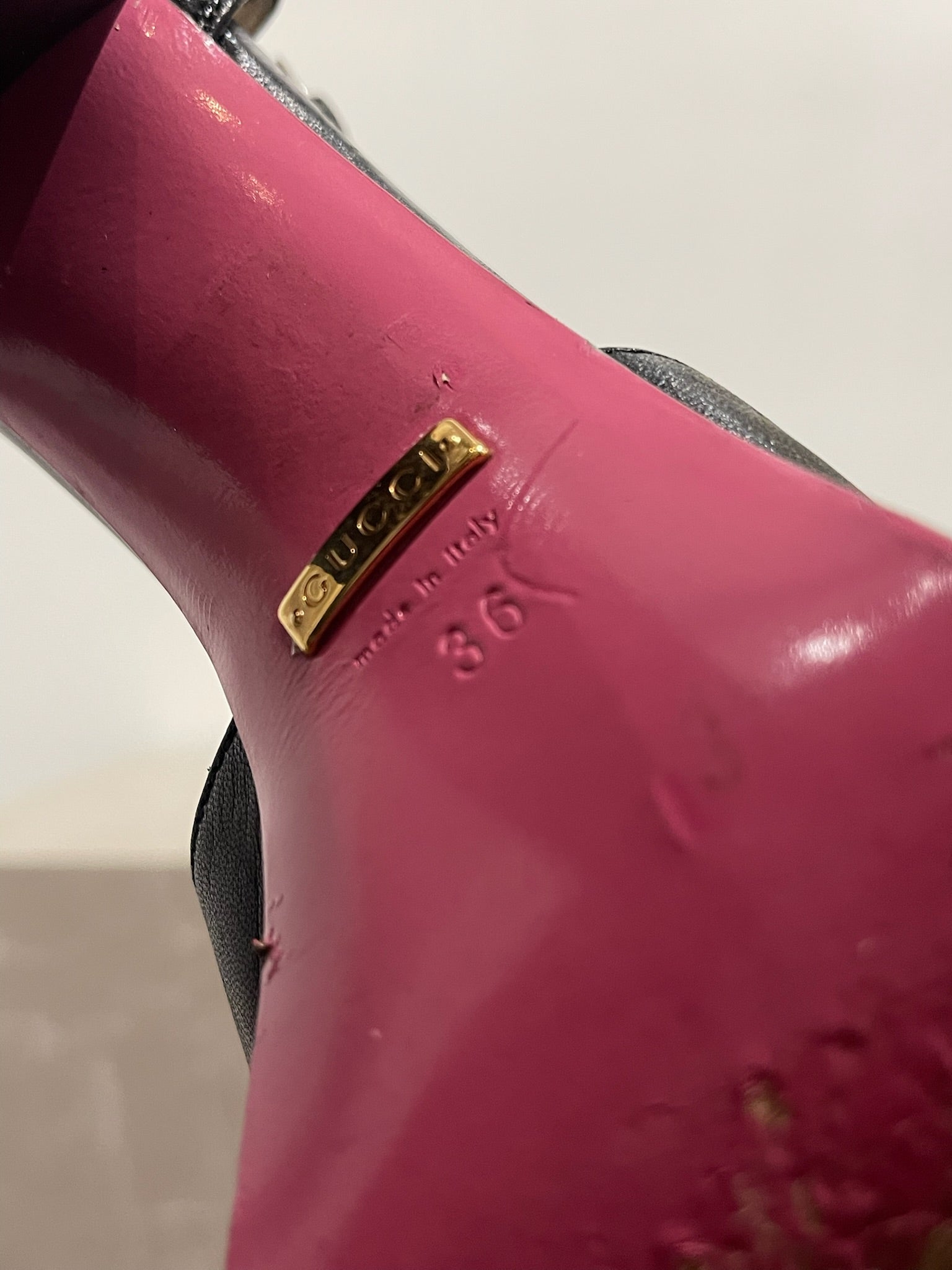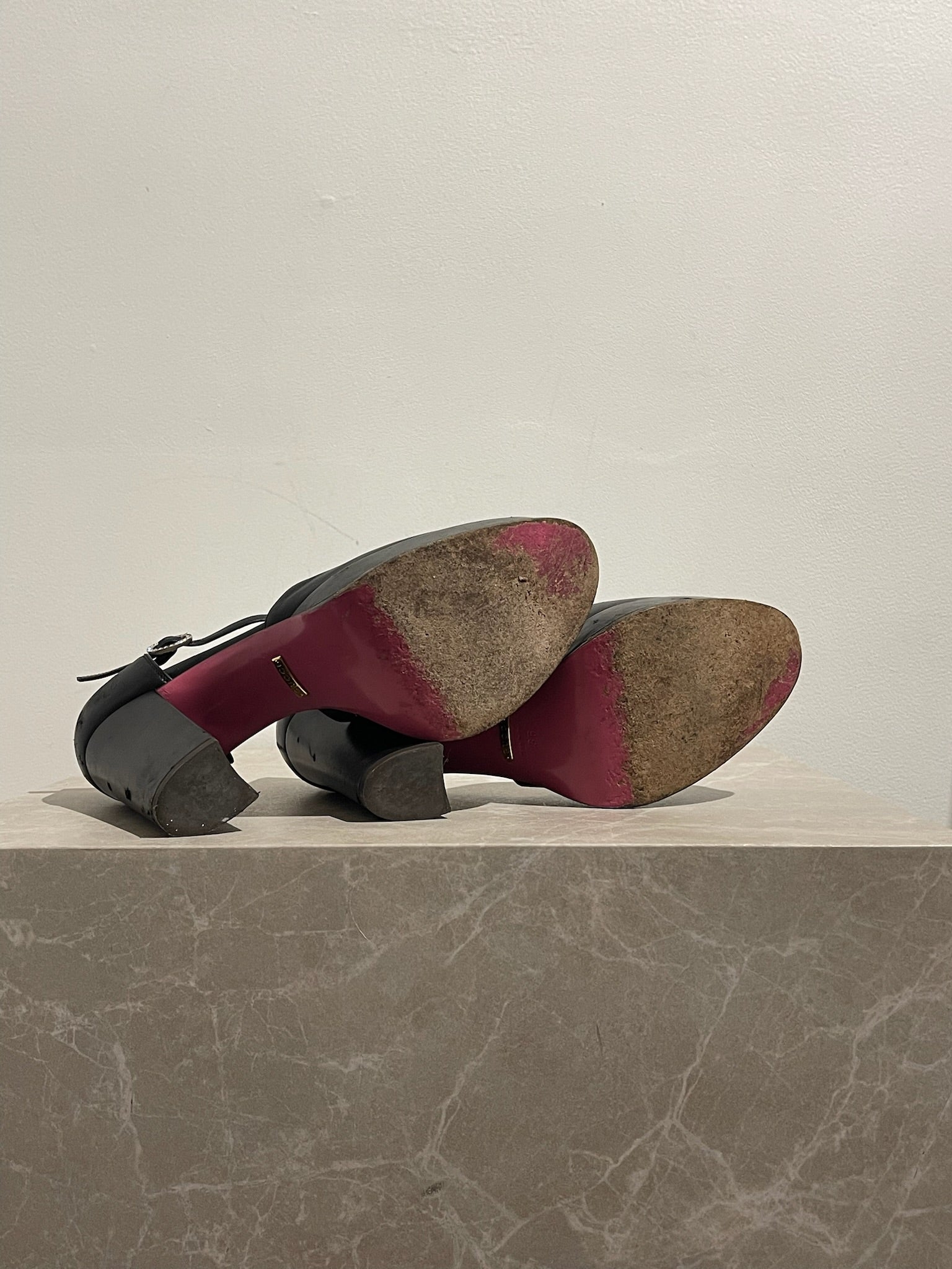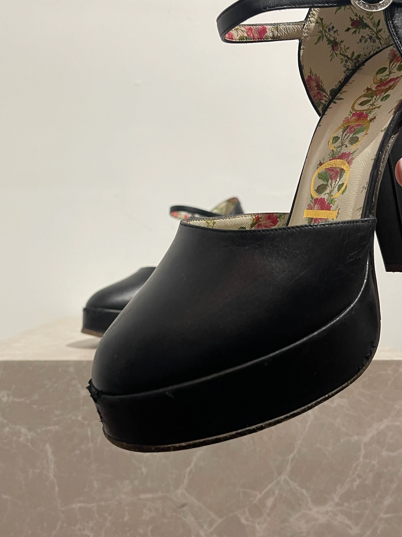 Escarpins en cuir noir. Boucle strass ajustable à la cheville. Semelle intérieure imprimée fleurie.