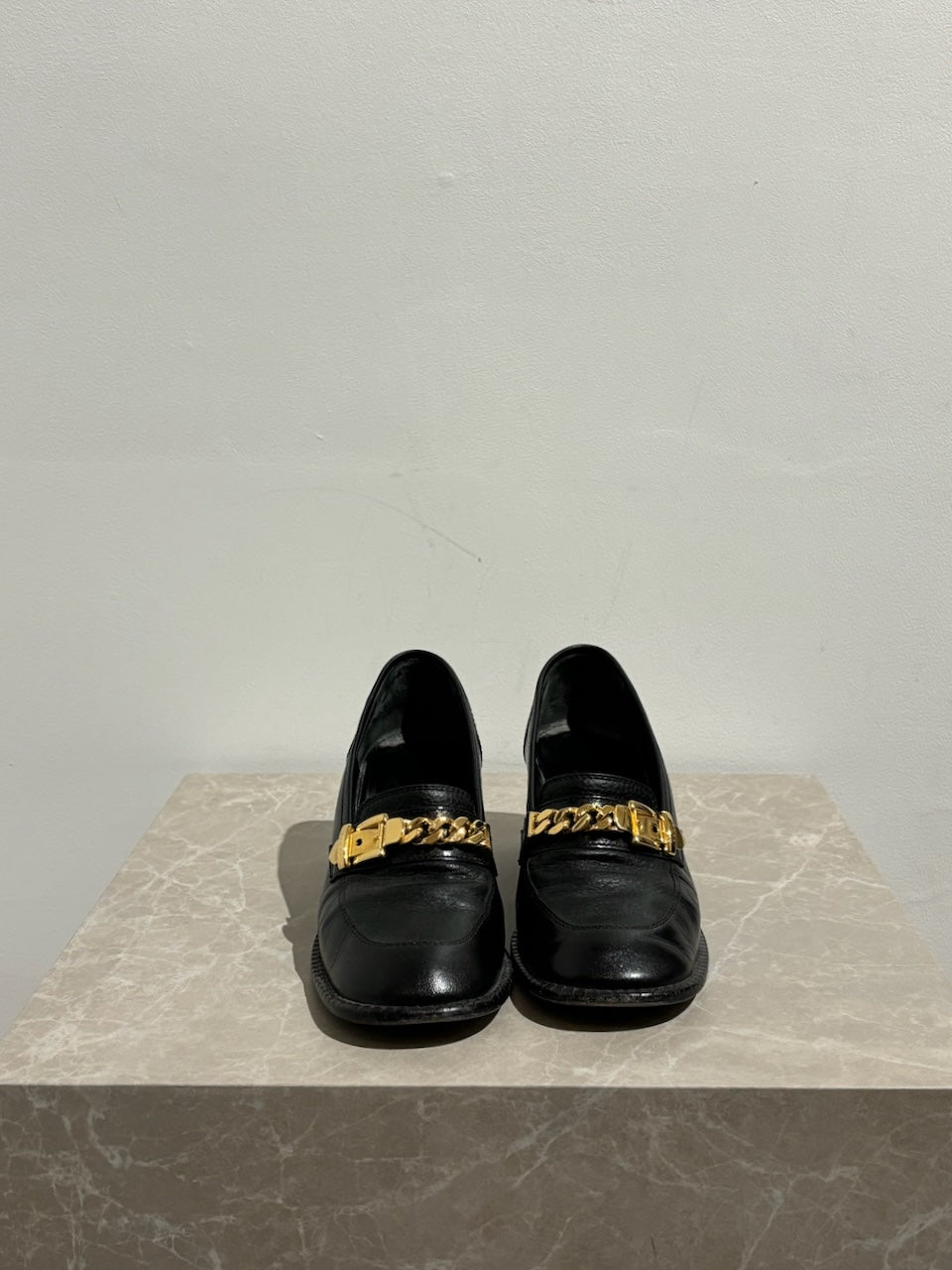 Escarpins en cuir noir orné d'une jolie chaine en métal doré et d'une boucle signée Gucci.