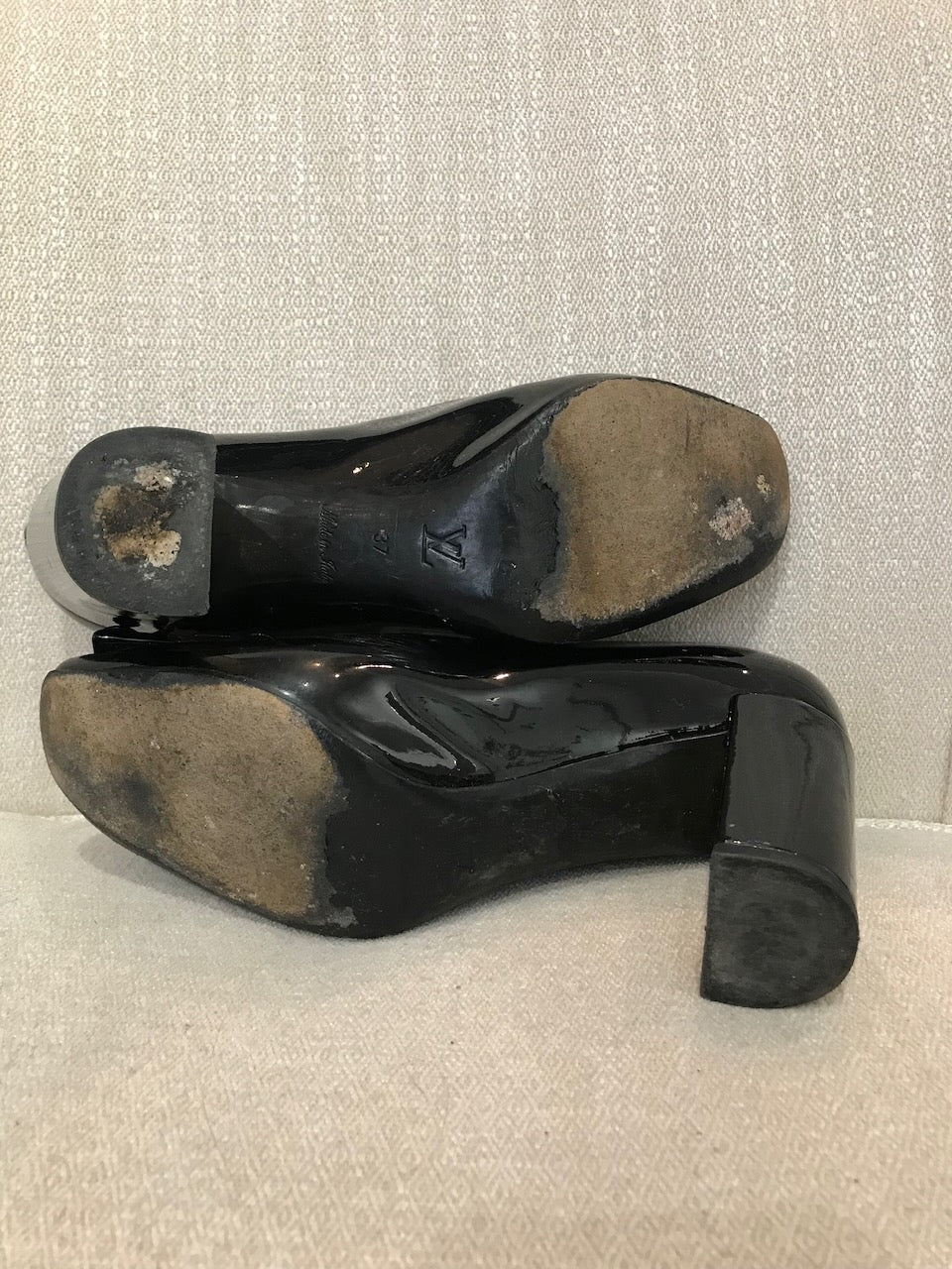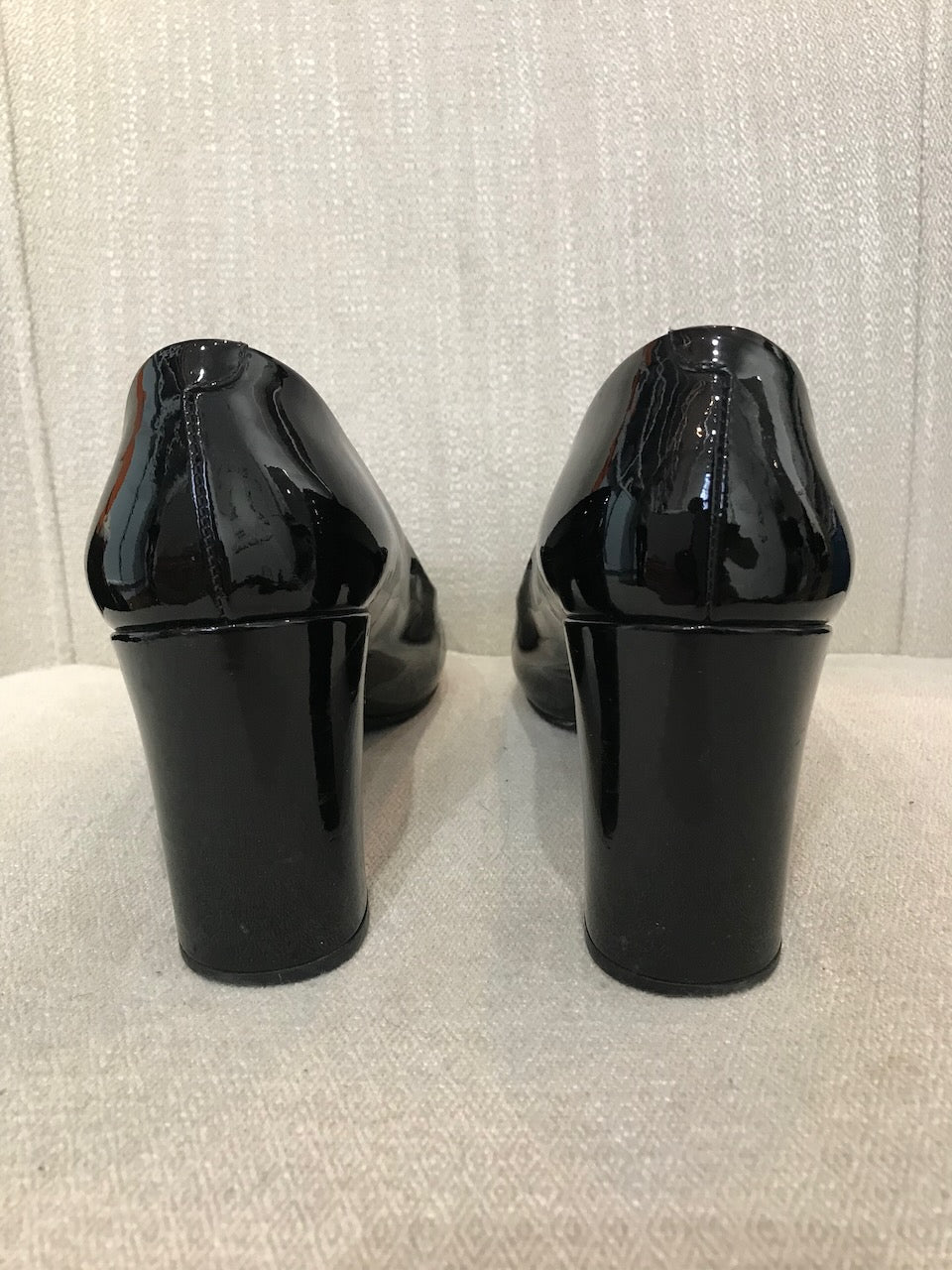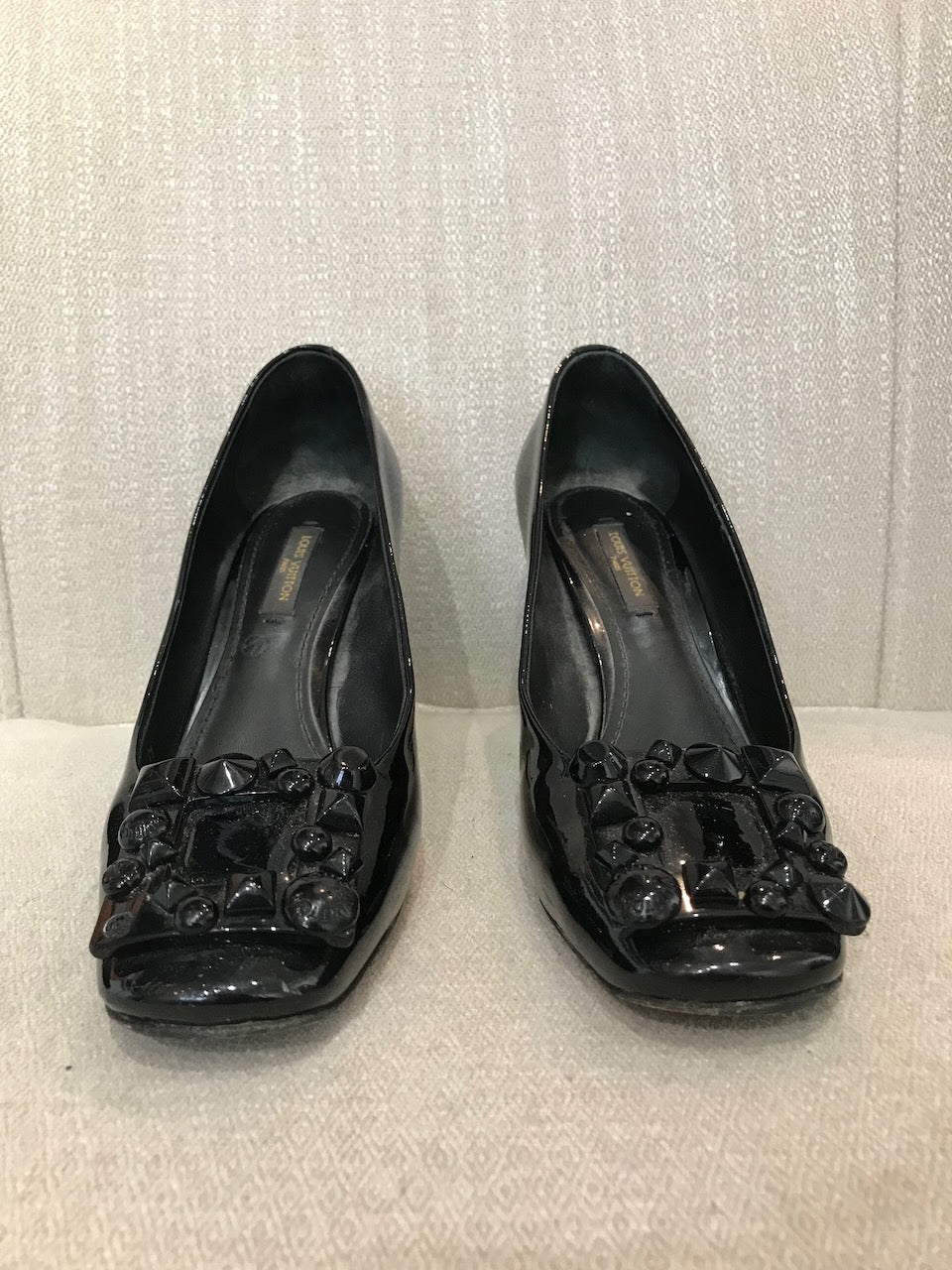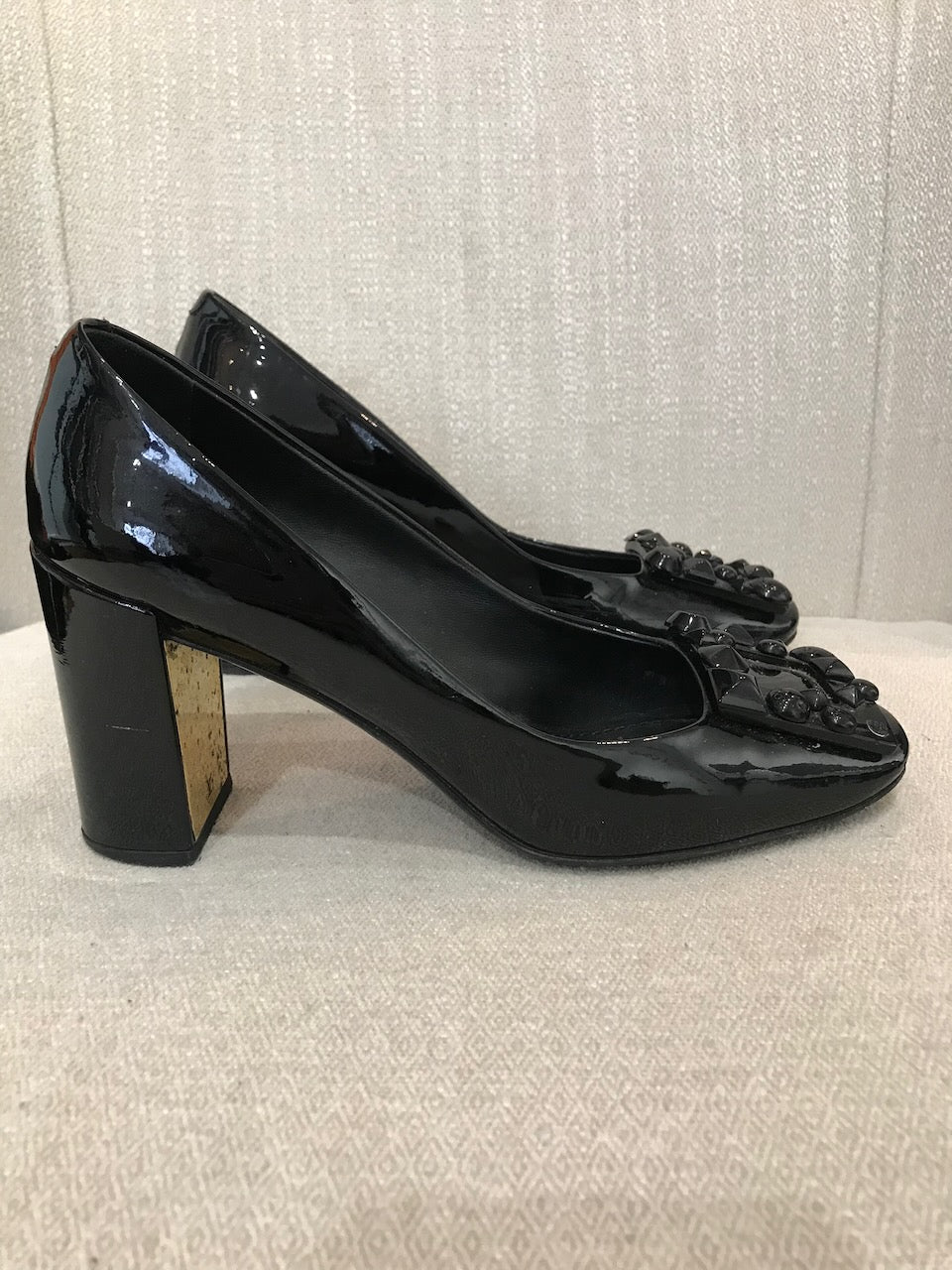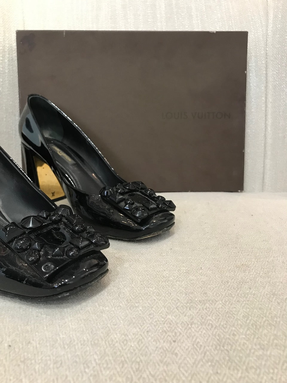 Escarpins en cuir vernis noir, bout carré avec boucle carré décoré de clous noirs.