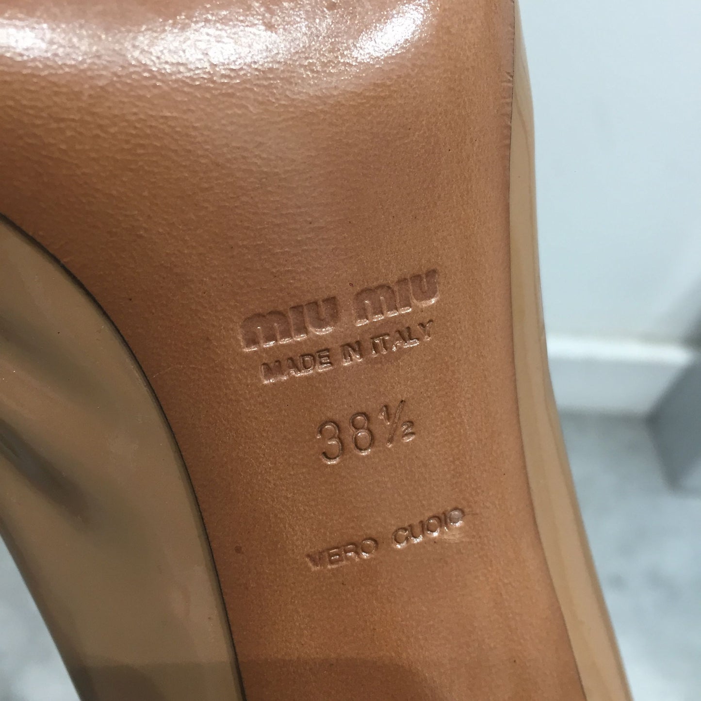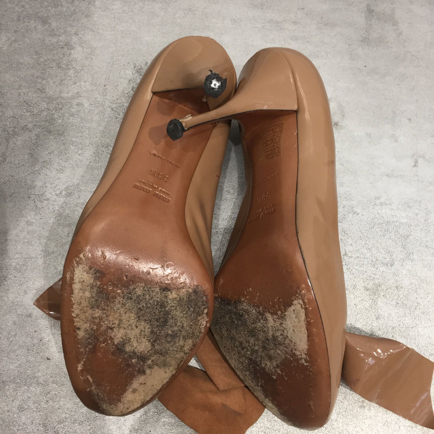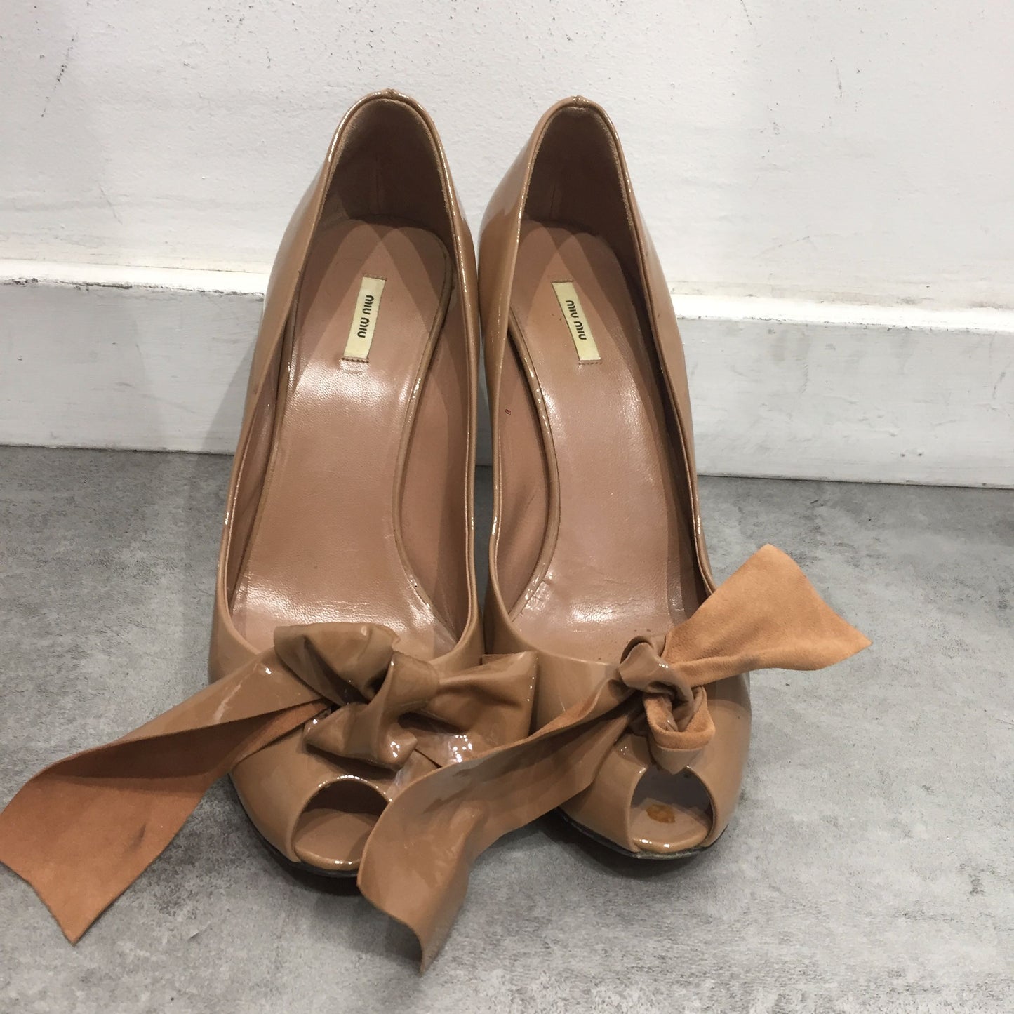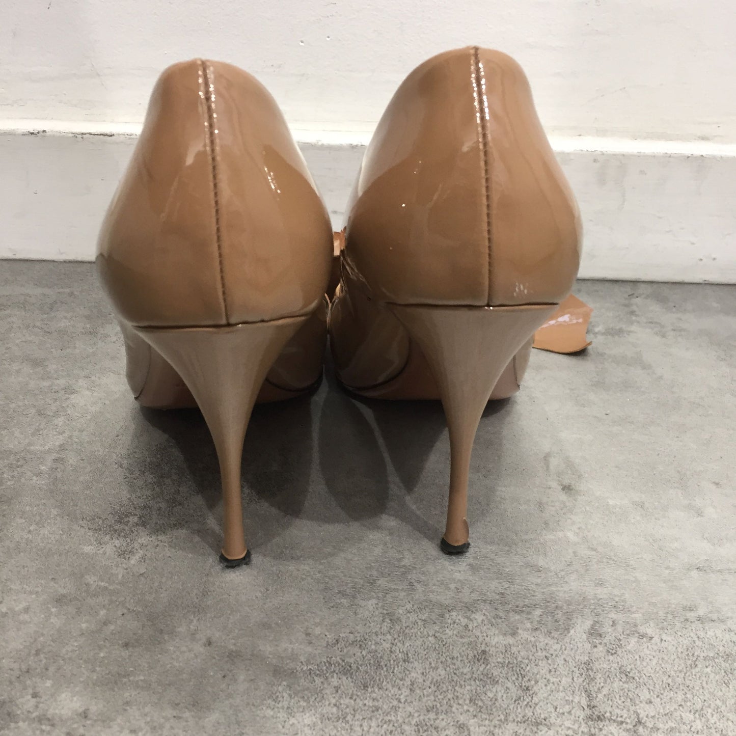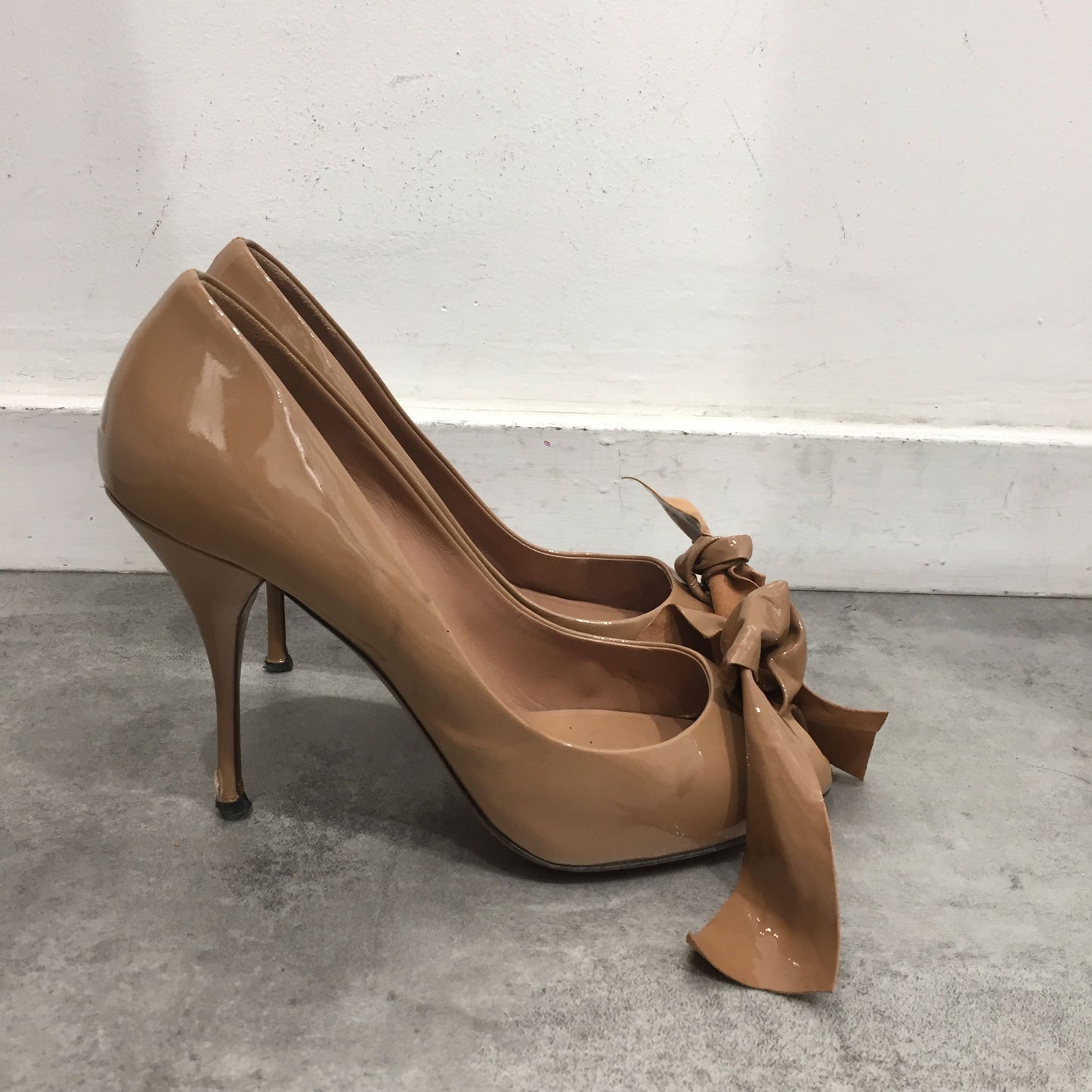 Escarpins en cuir vernis beige-camel à bouts ouverts et noeuds.