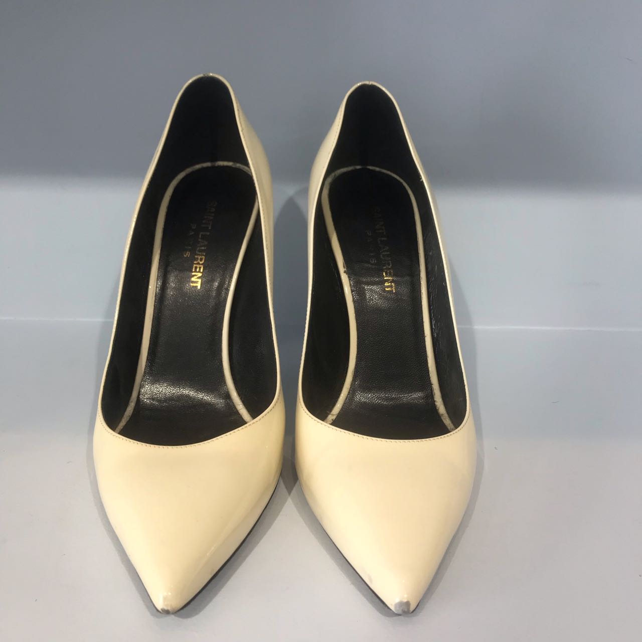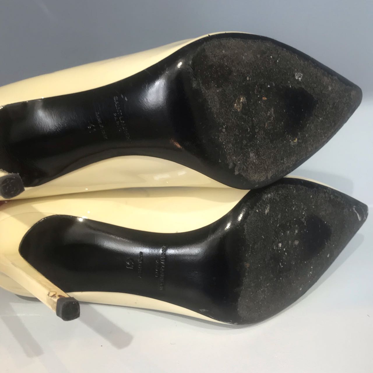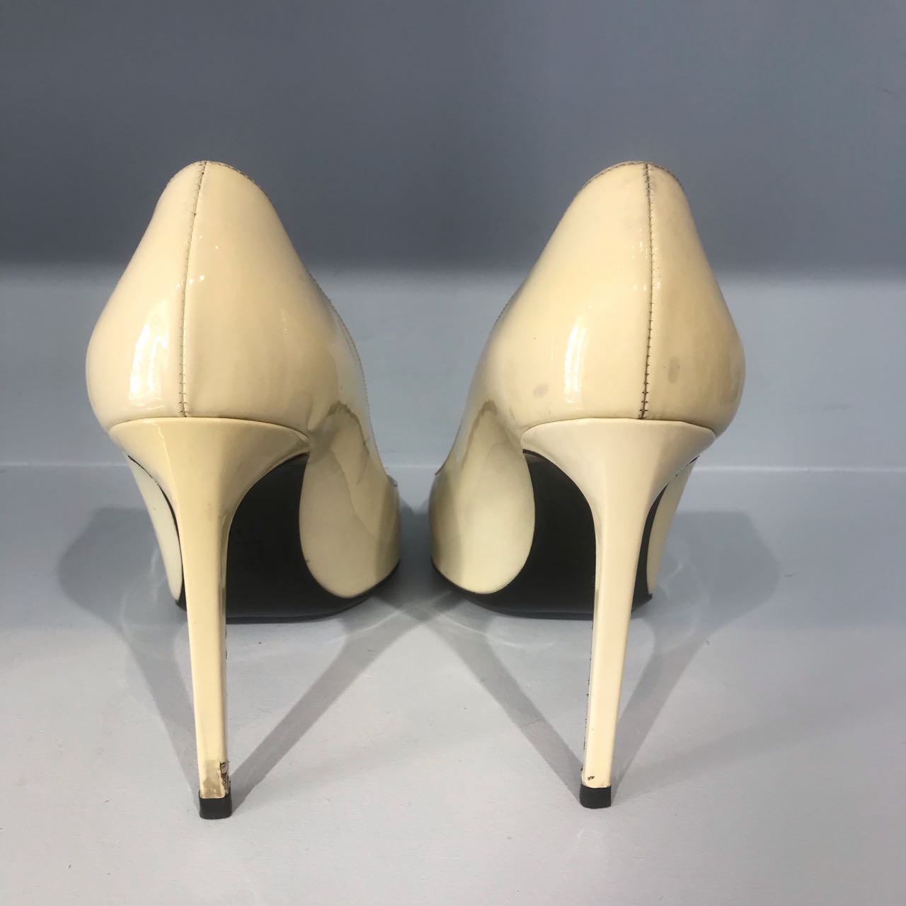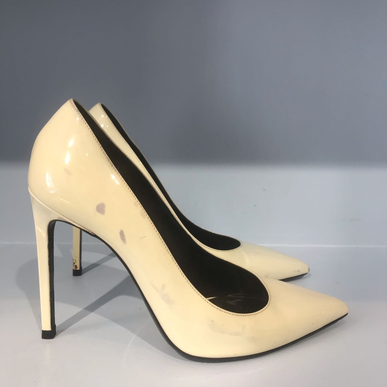 Escarpins en cuir brillant blanc cassé, bouts pointus.