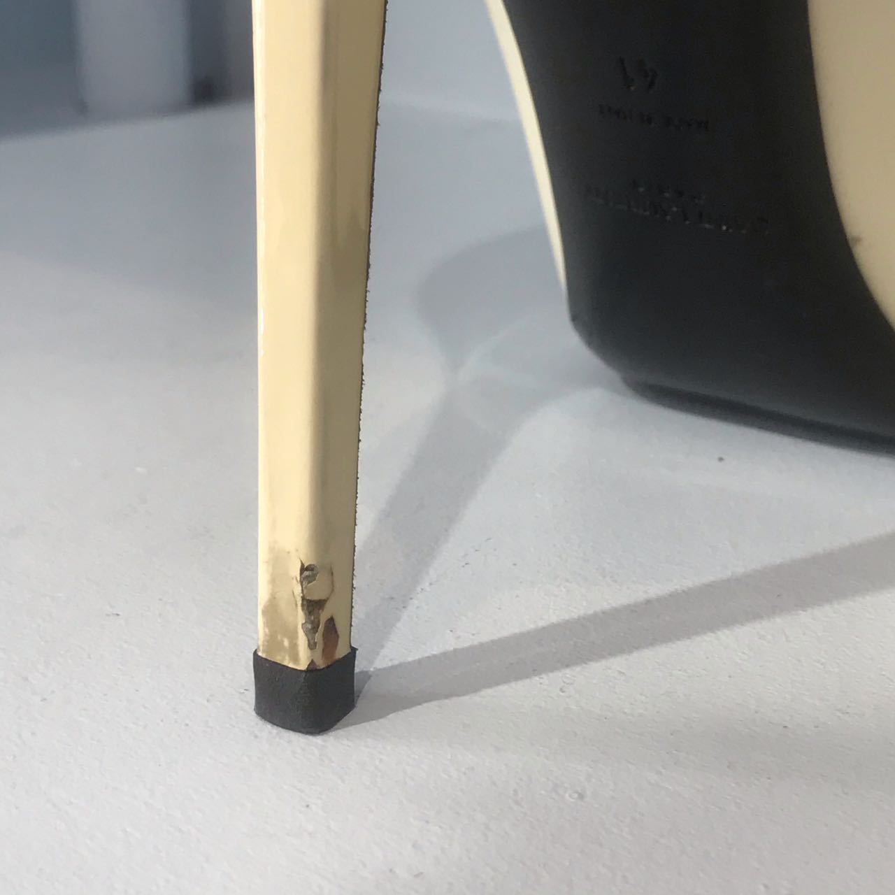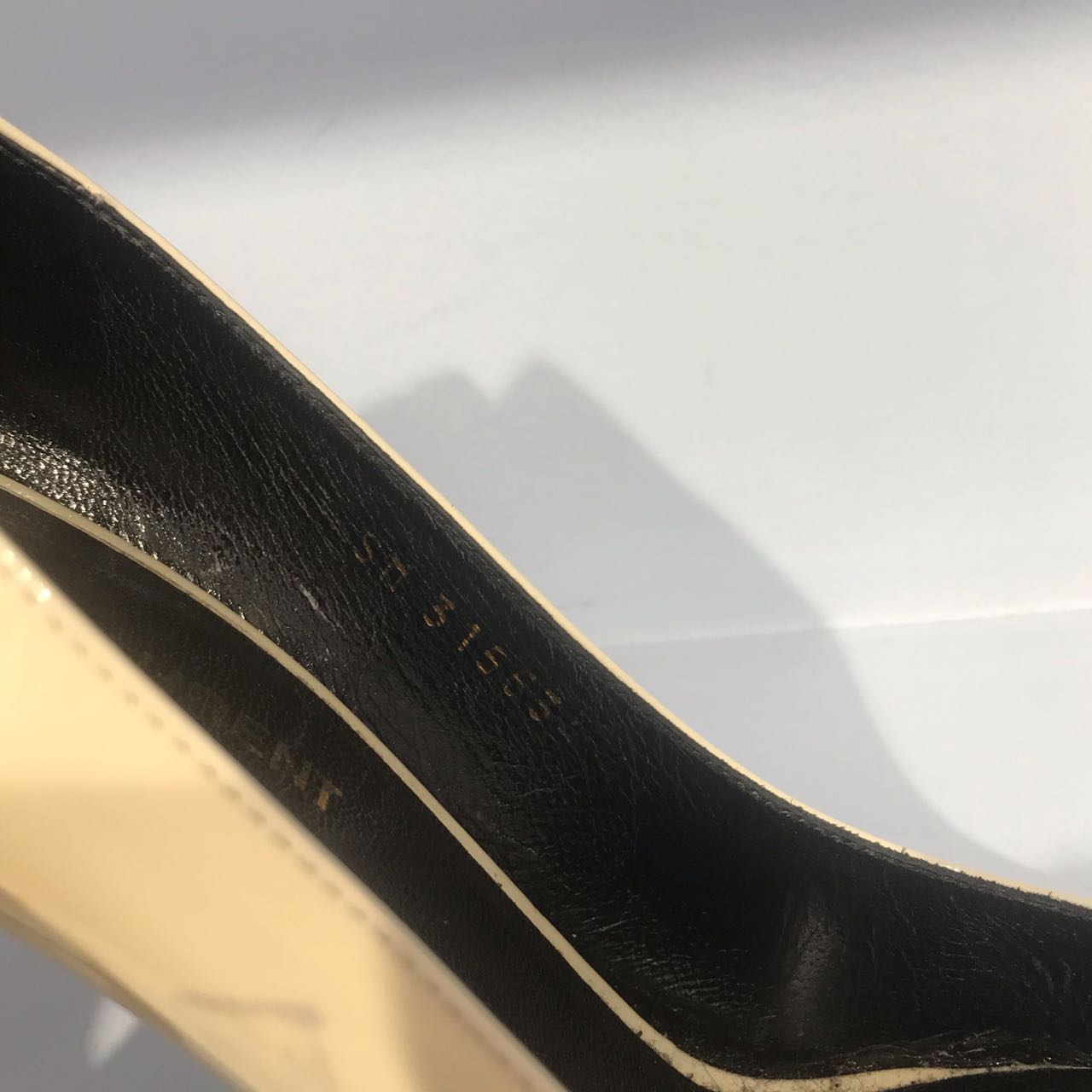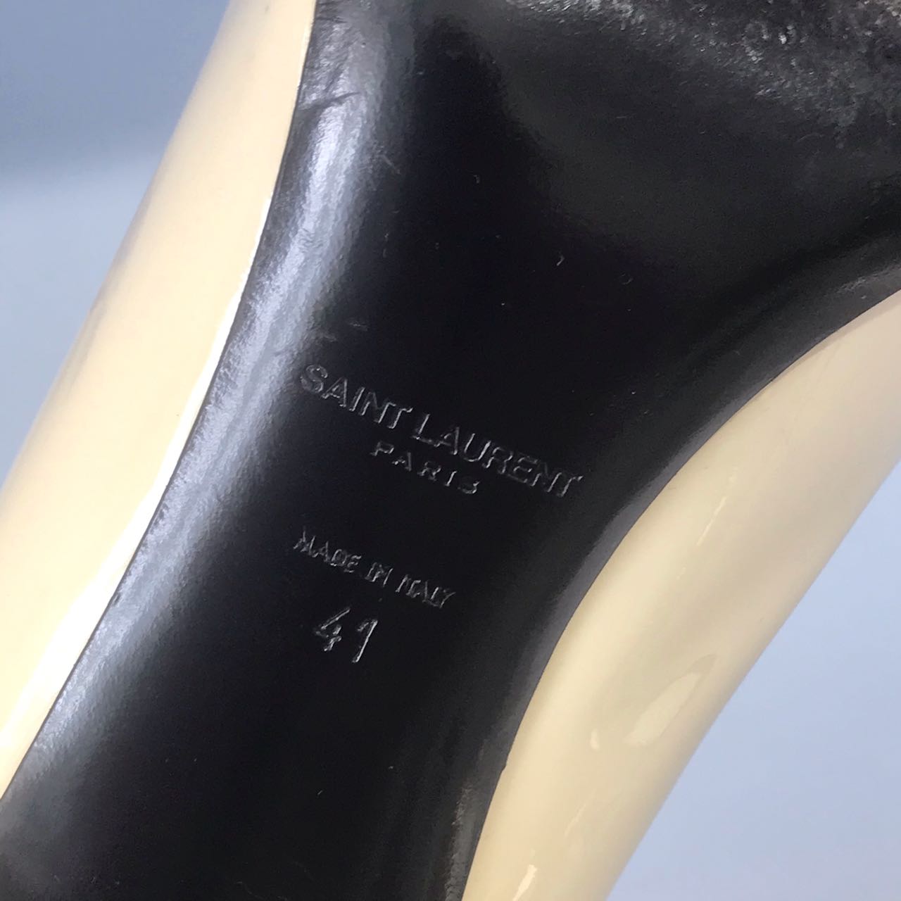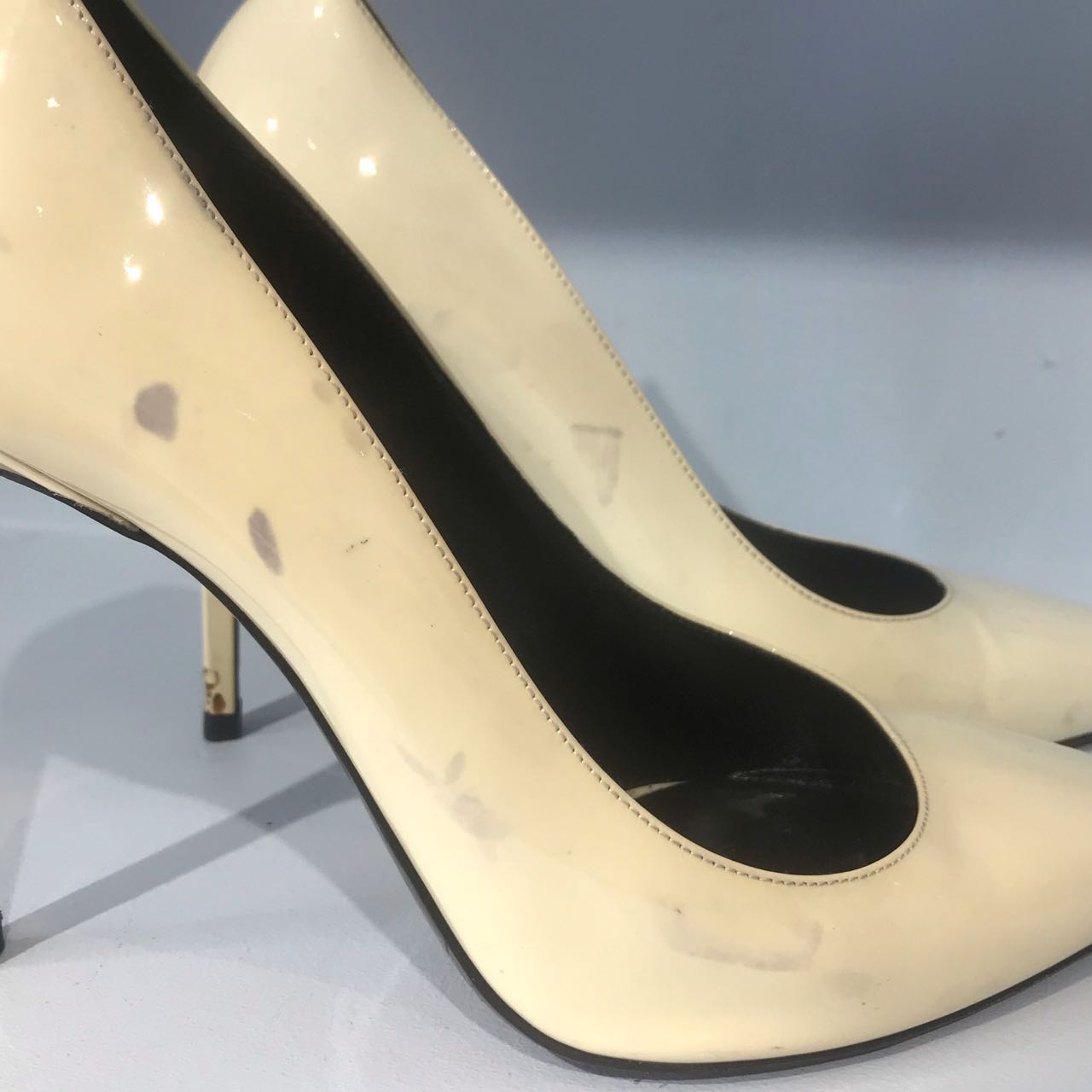Escarpins en cuir brillant blanc cassé, bouts pointus.