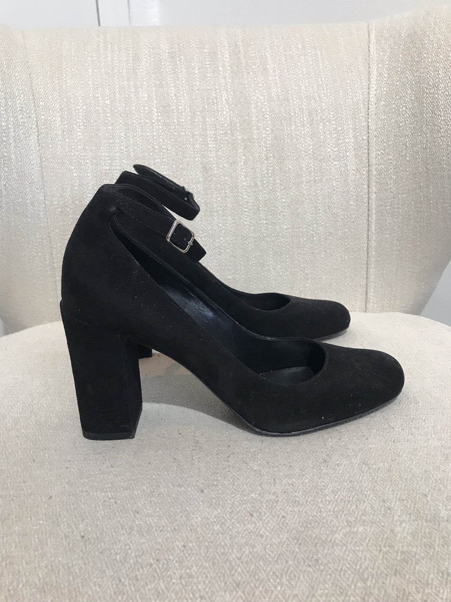 Escarpins babies en daim noir à bouts rond. Fermeture à bride ajustable.