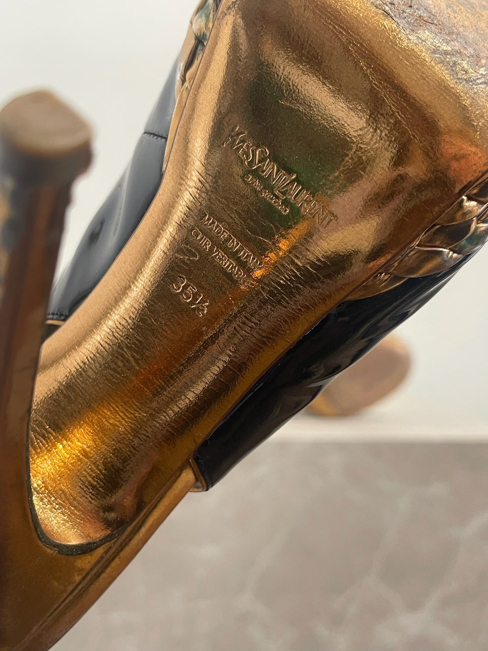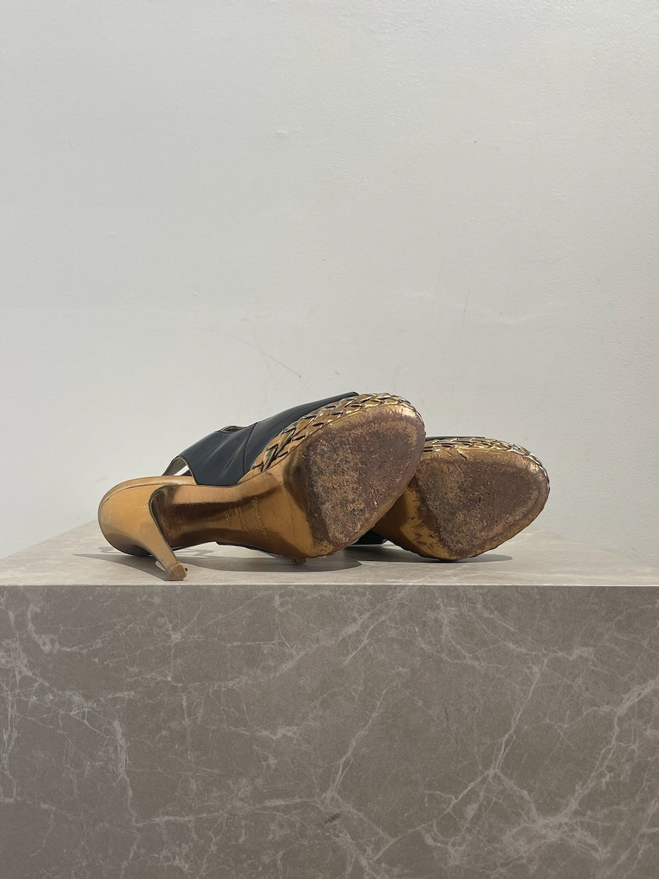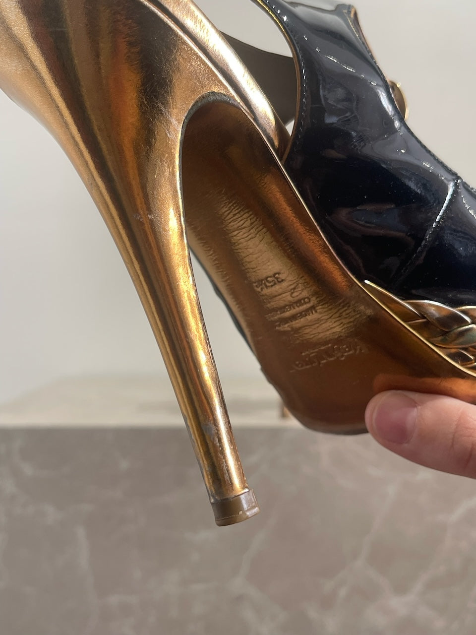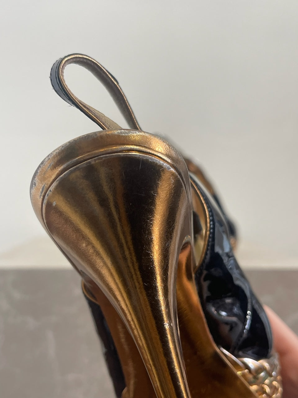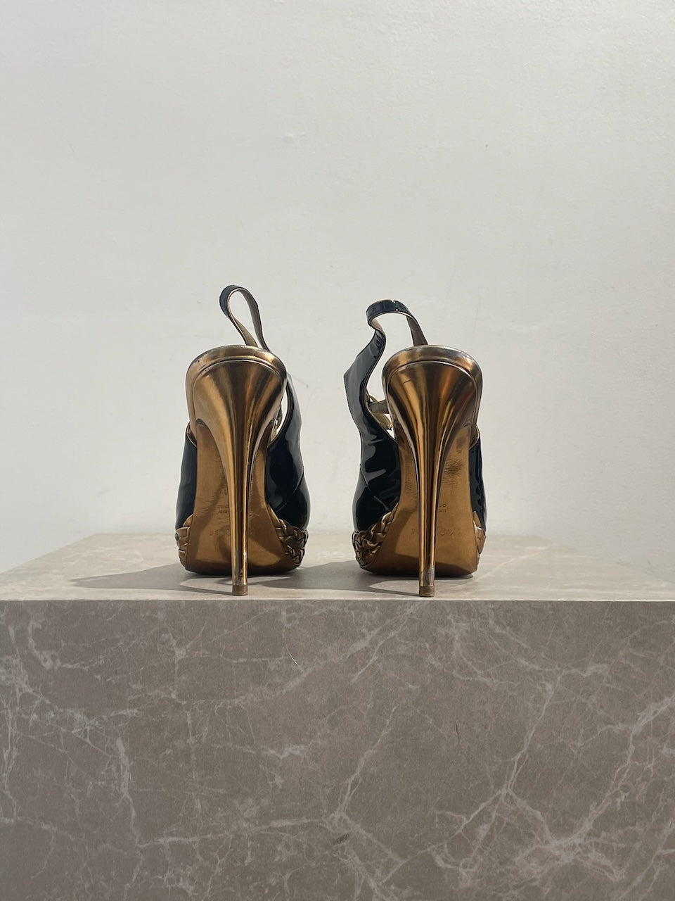 Escarpins en cuir verni noir avec bouts ouverts et boucle ajustable à l'avant. Jolies talons doré avec plateforme effet tressé.