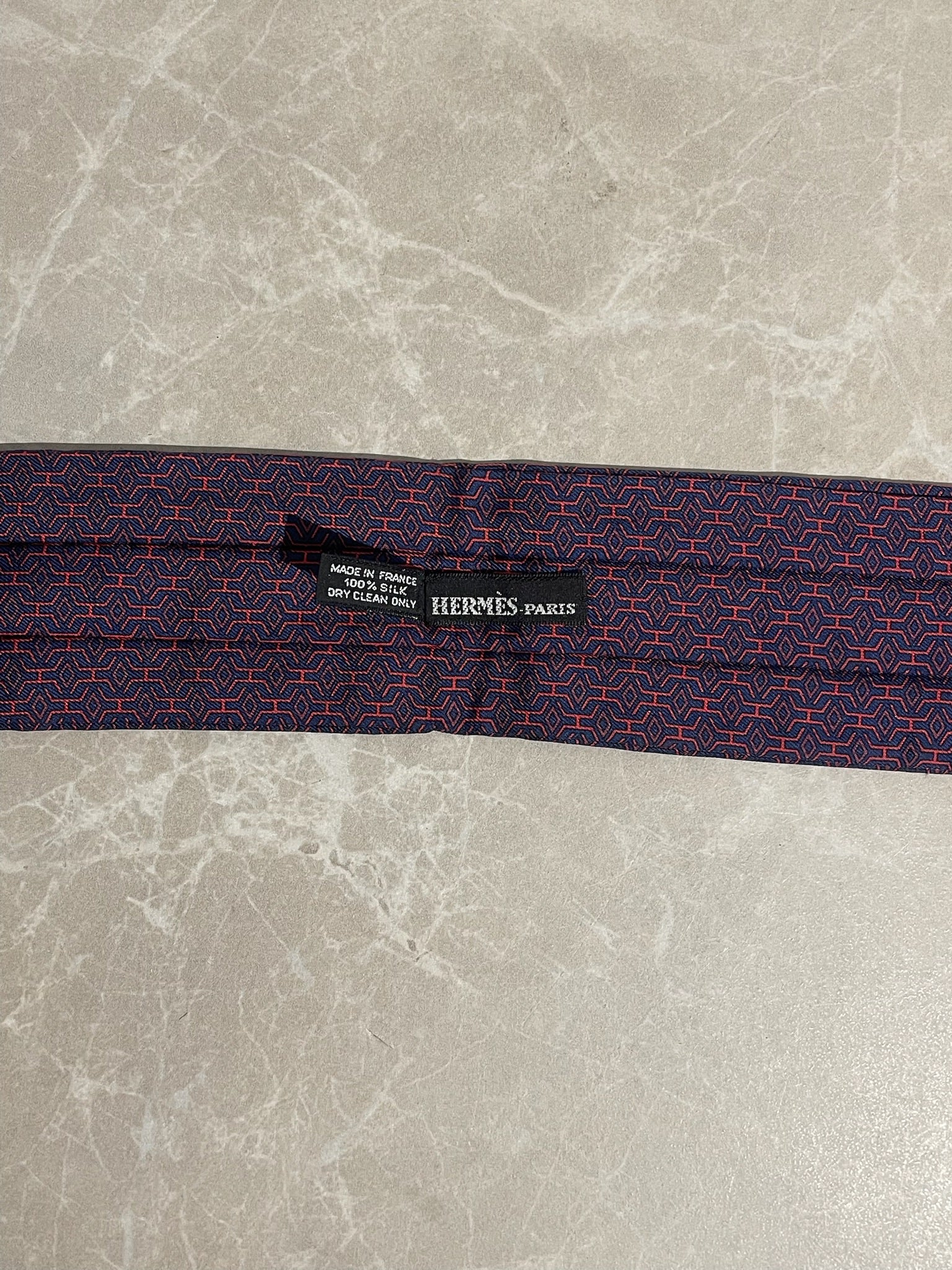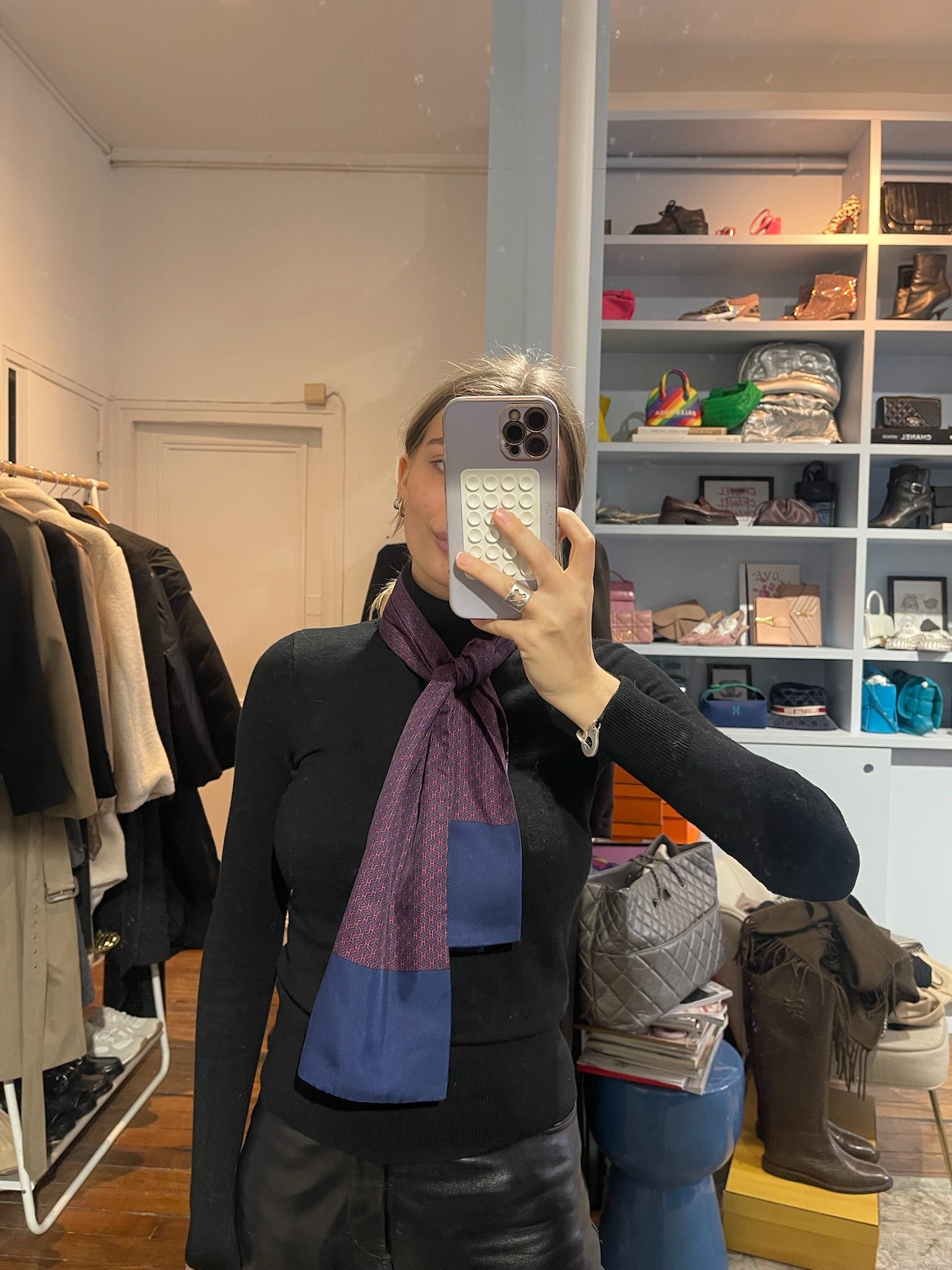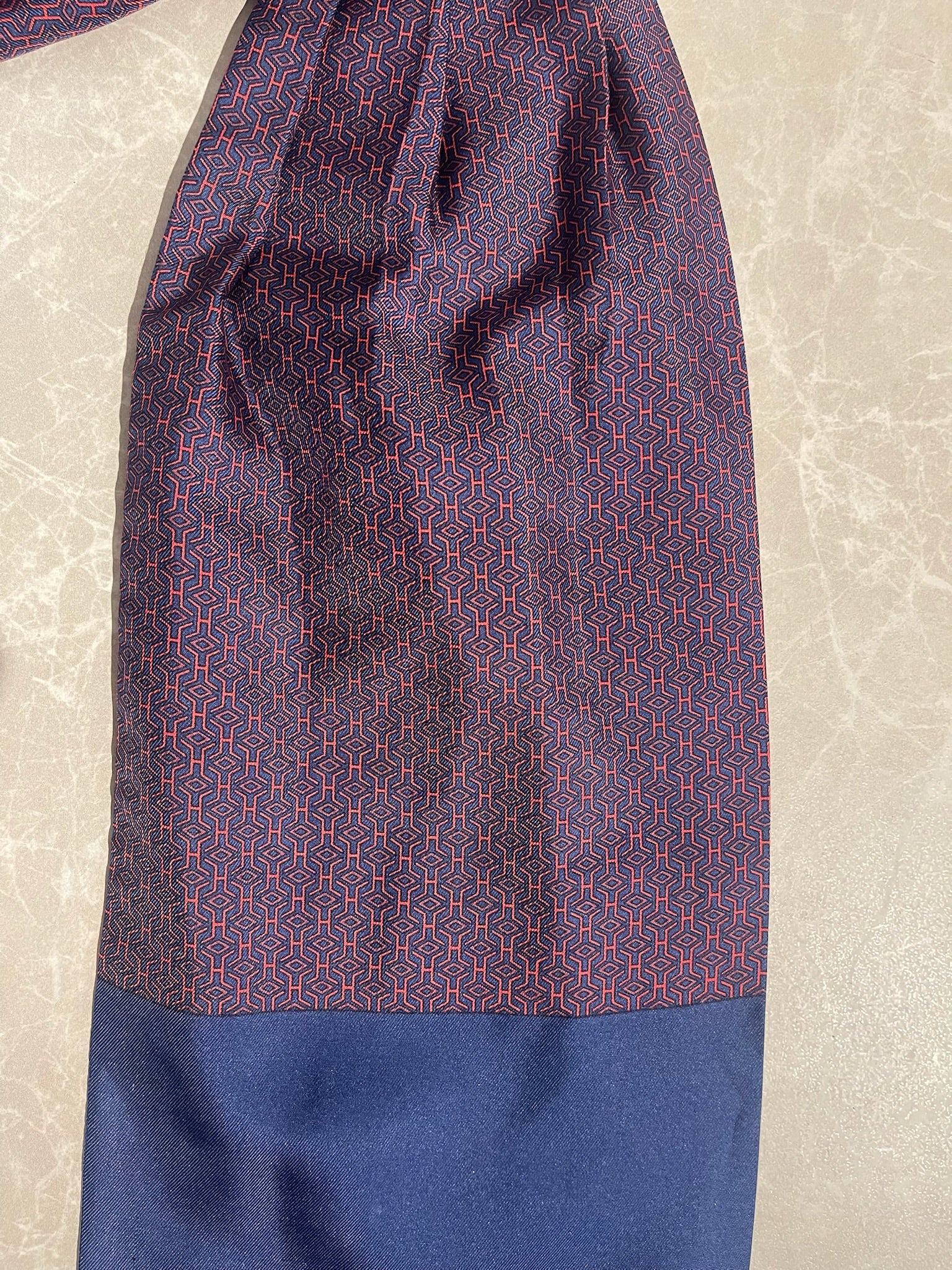 Ascot en soie bleu marine et rouge à imprimé géométrique. Peut être porté en foulard/ cravate ou bien noué dans les cheveux.