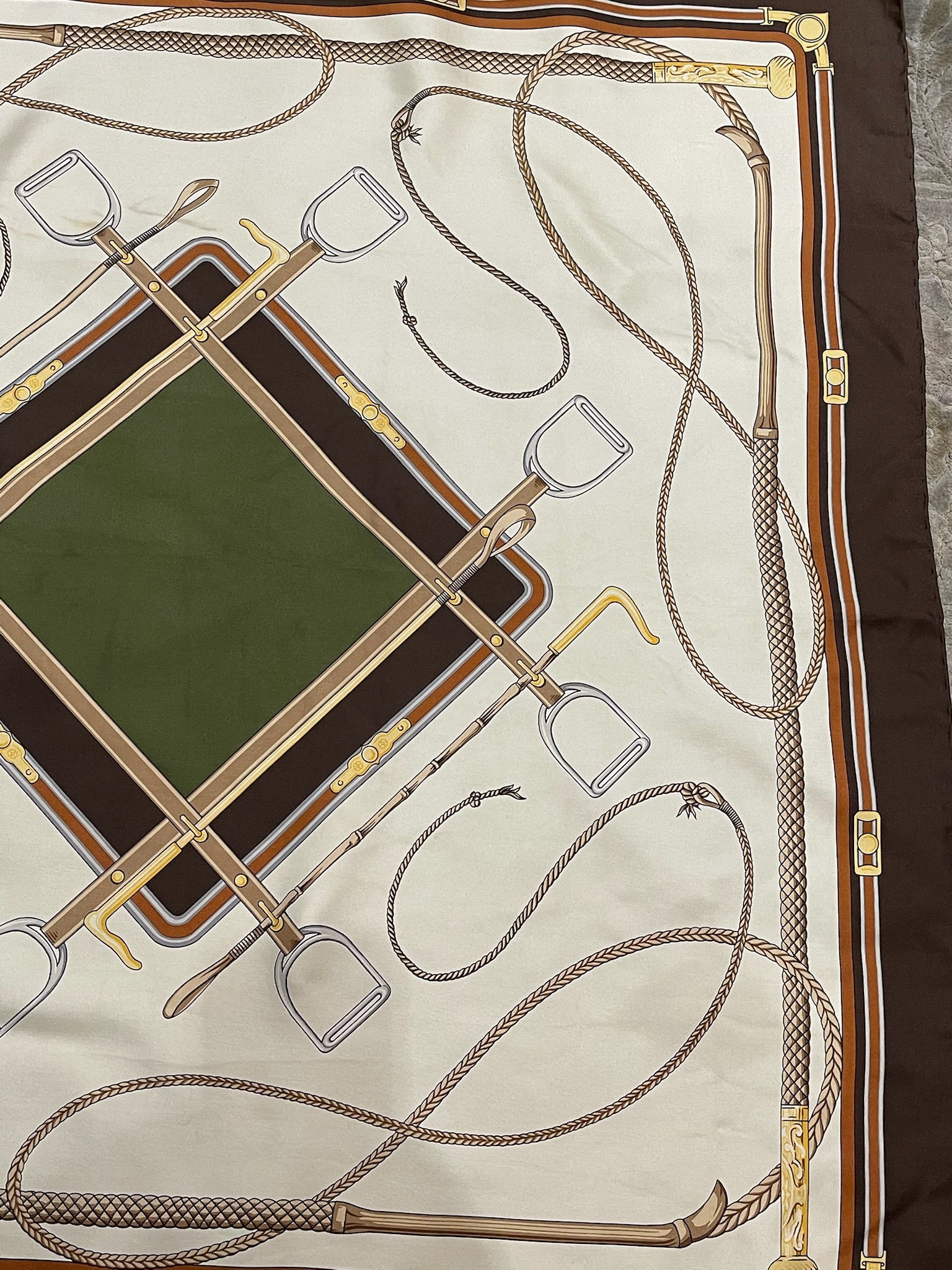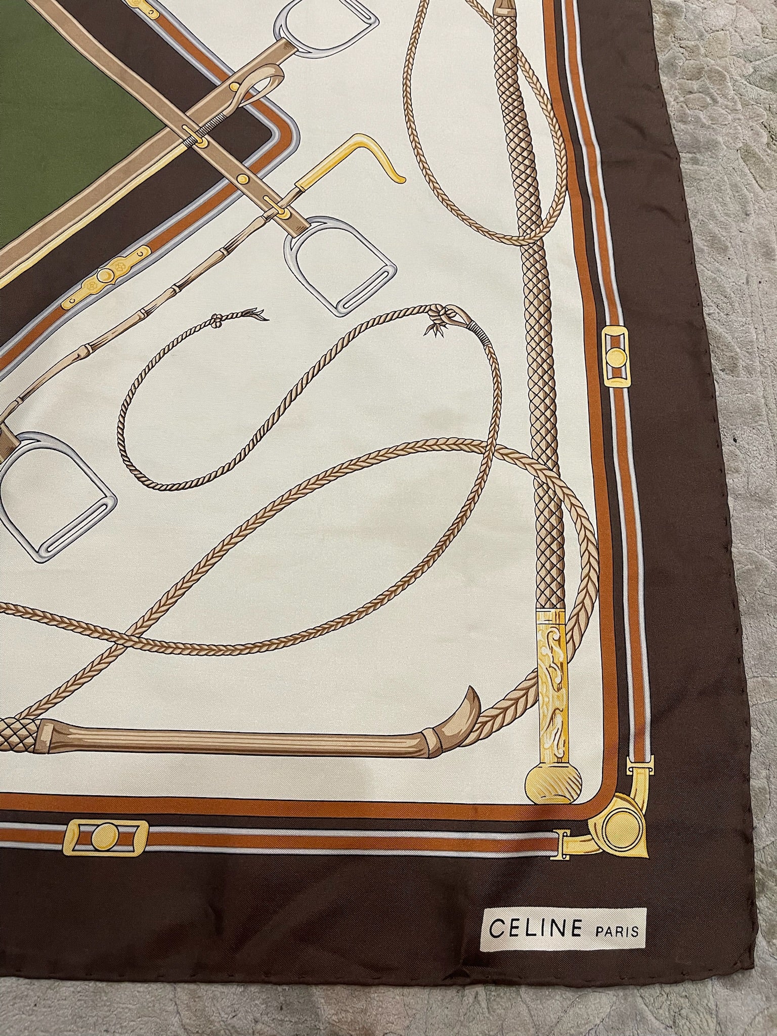 Carré 100 % soie écru, contour marron et imprimé équestre. Signature Celine.