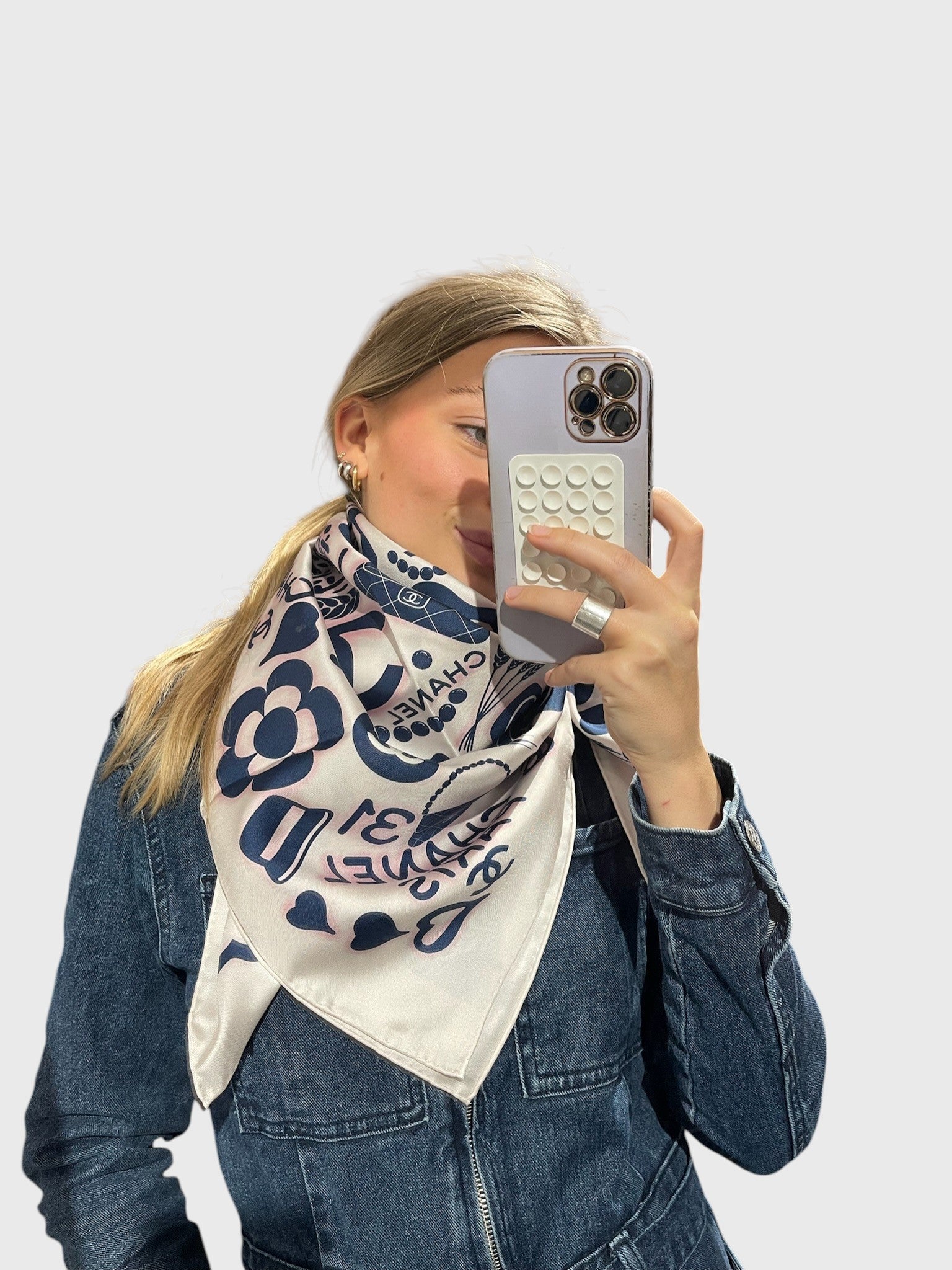 Carré 100 % soie blanc avec motifs emblématiques de la maison Chanel, logo CC et inscription Chanel en bleu. Détails de reflets roses.