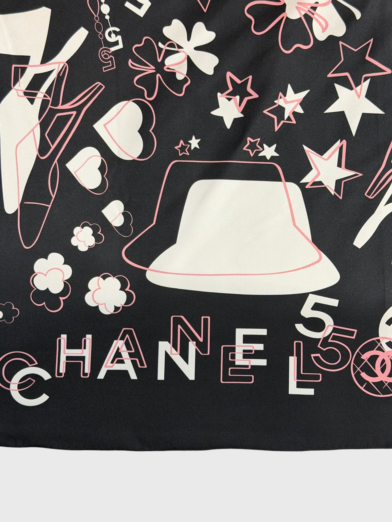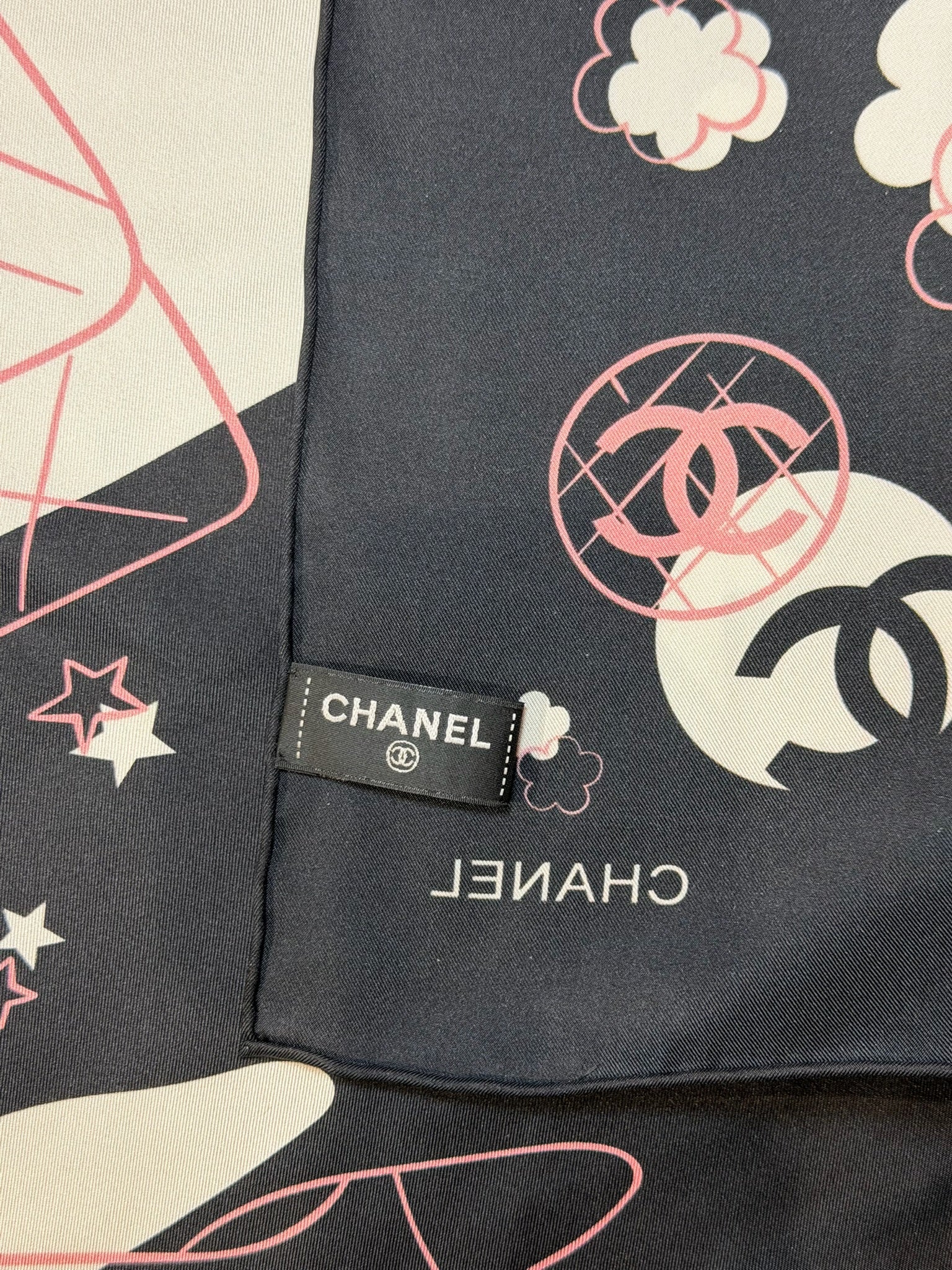 Carré 100% soie noir, imprimé objets iconique Chanel blanc et rose et logo Chanel.