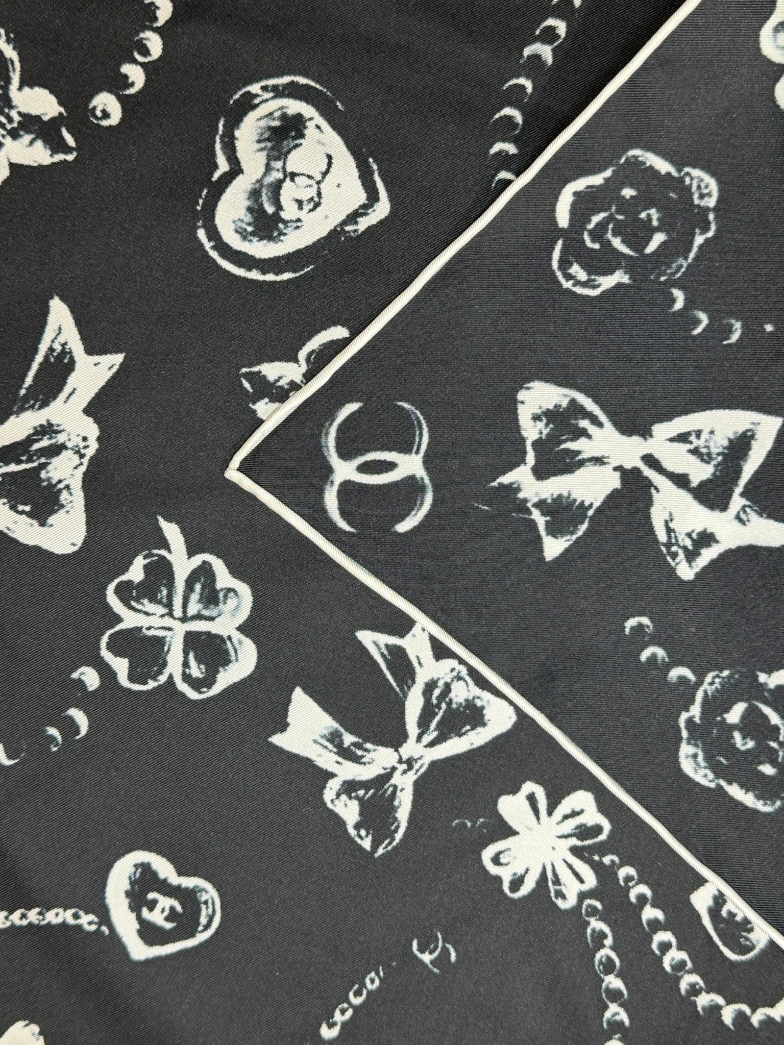Carré 100% soie noir et blanc, imprimé floral, coeurs et logo CC. Contour blanc.
