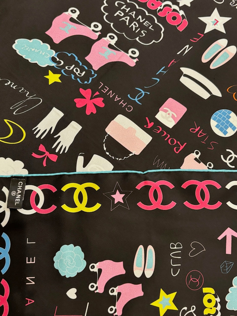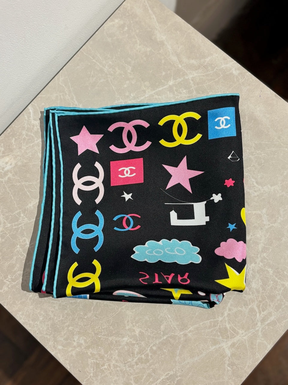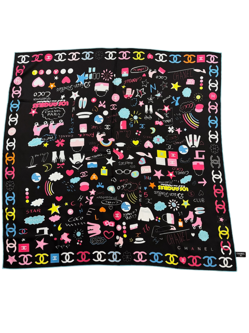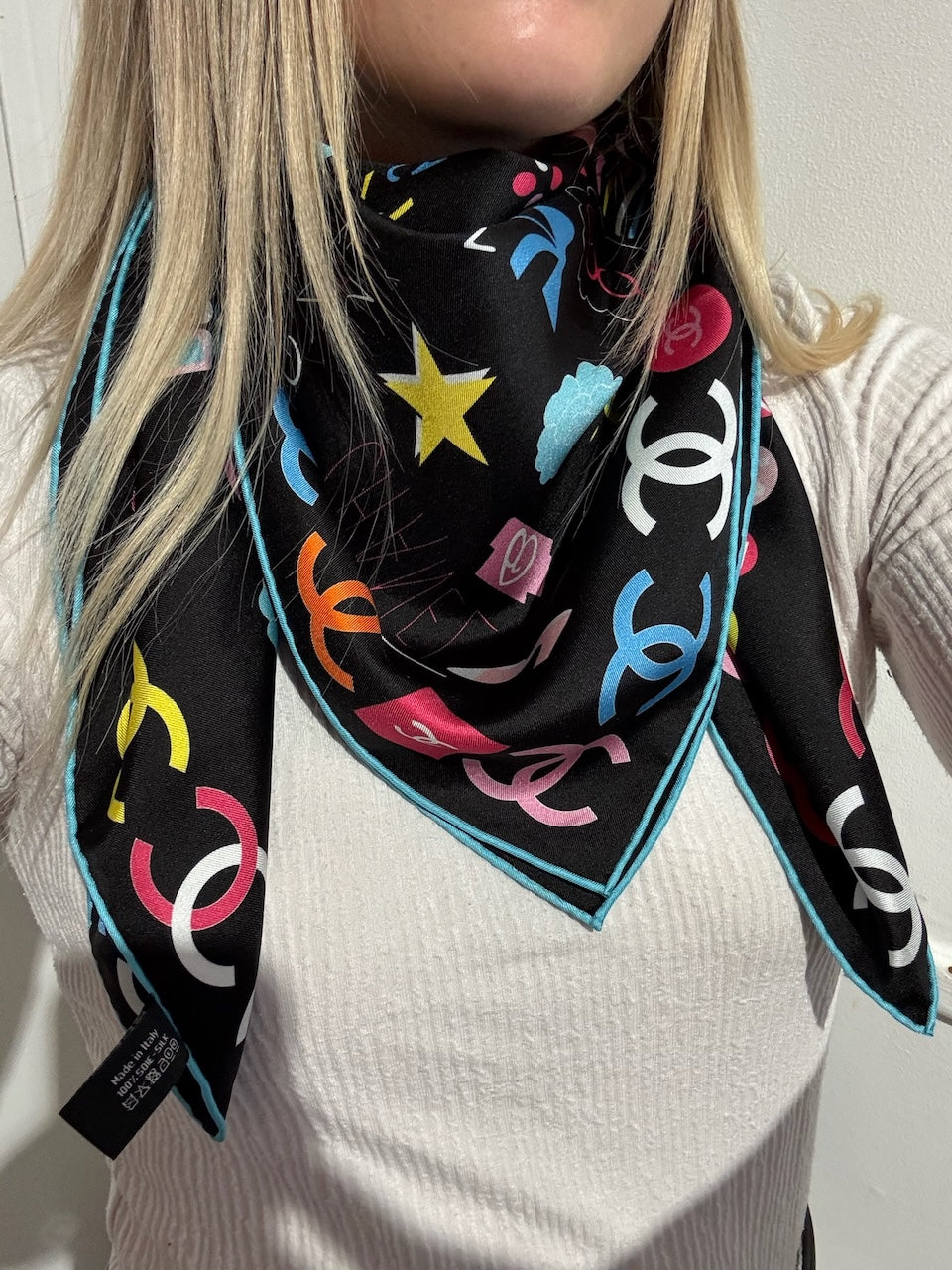 Carré 100 % soie noir avec un imprimés multicolores, logo CC et inscription Chanel.