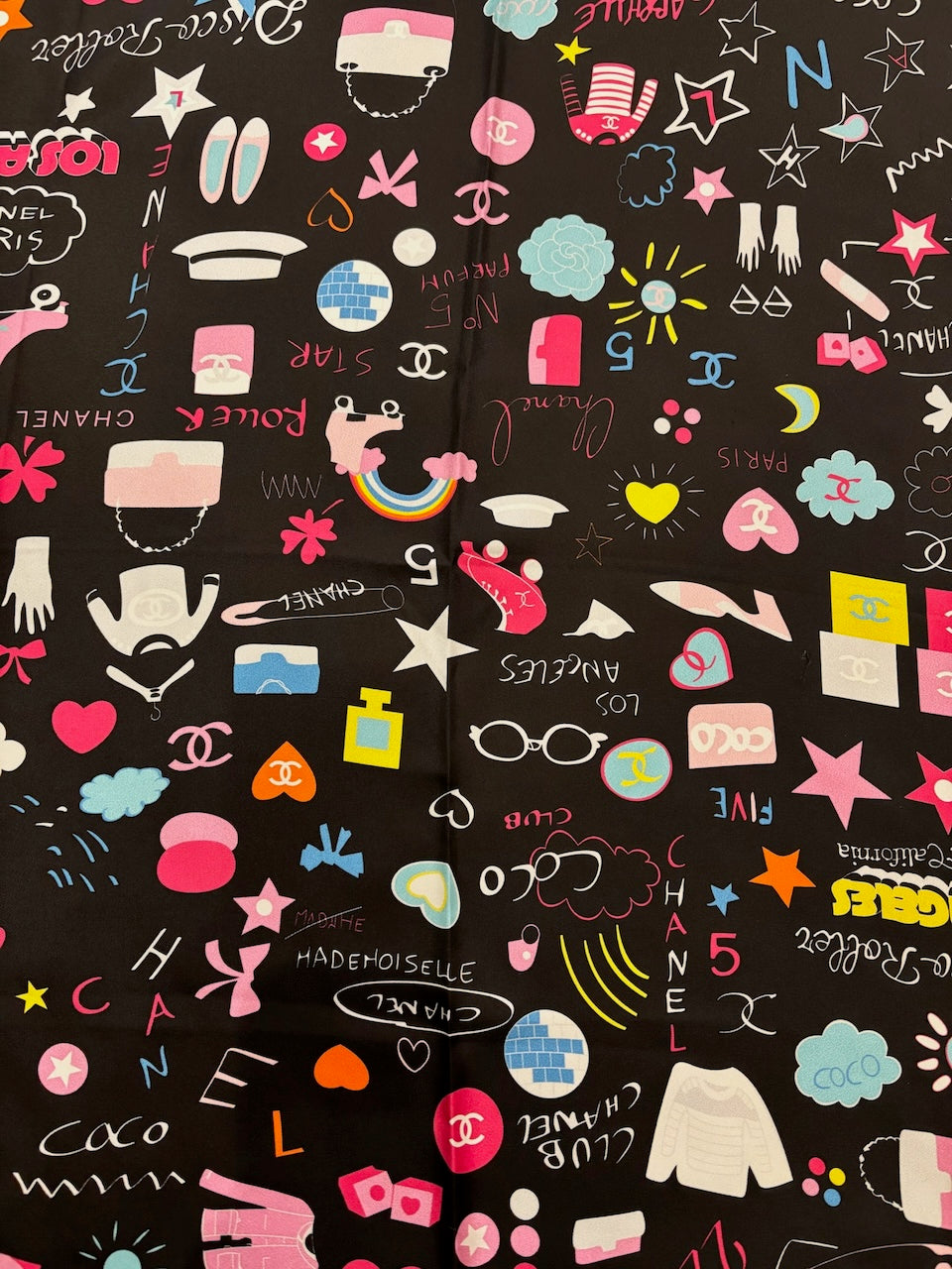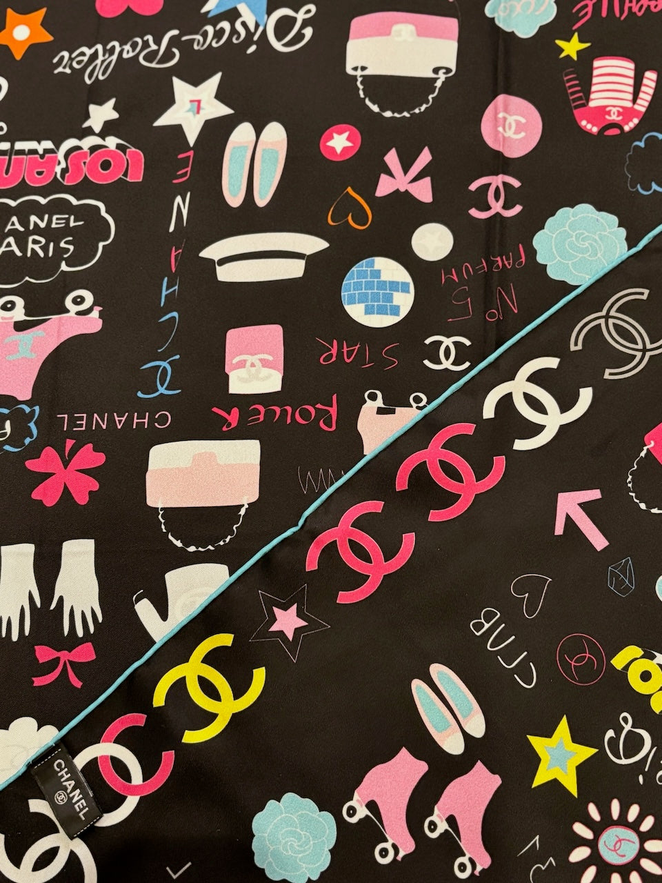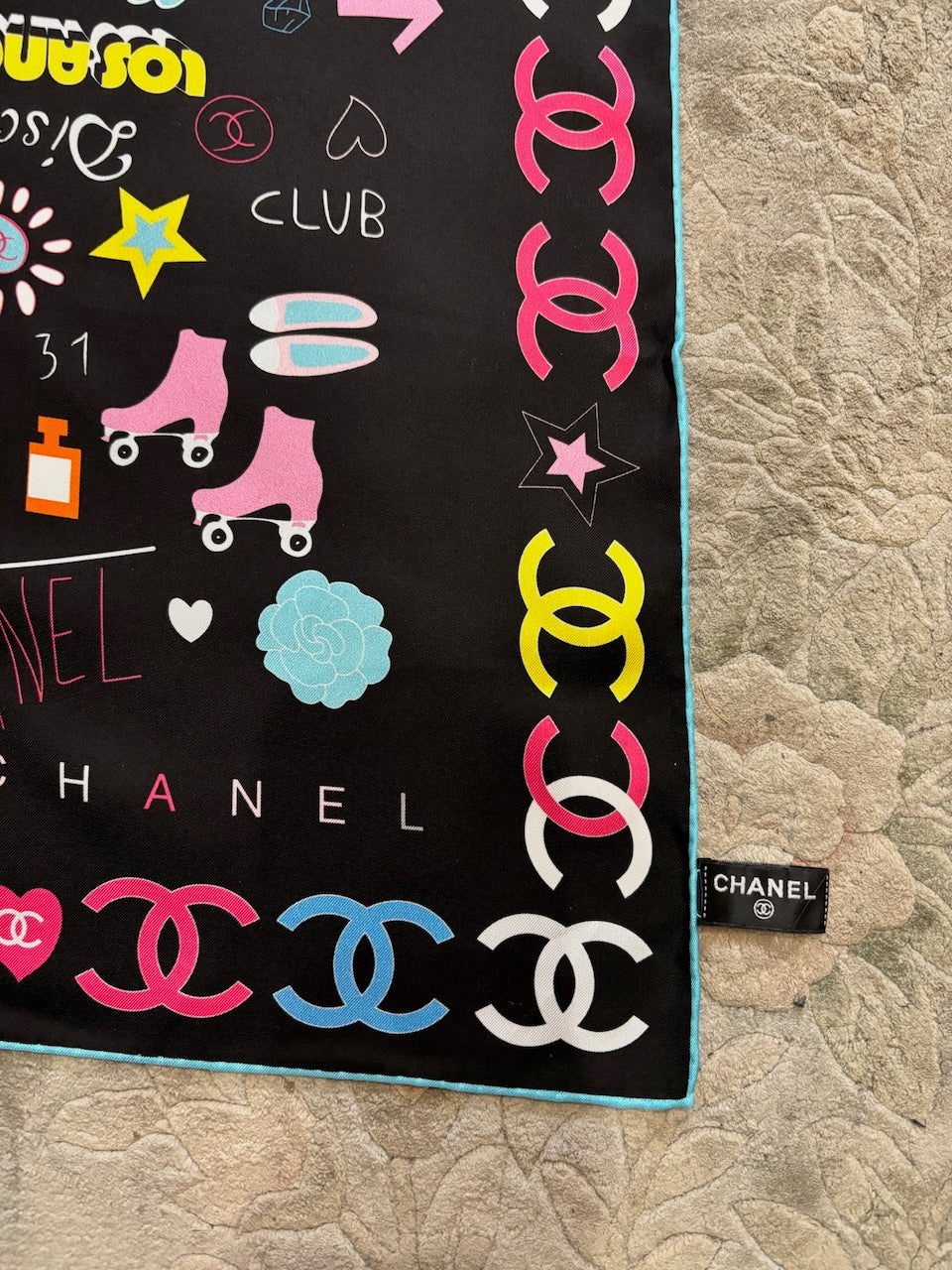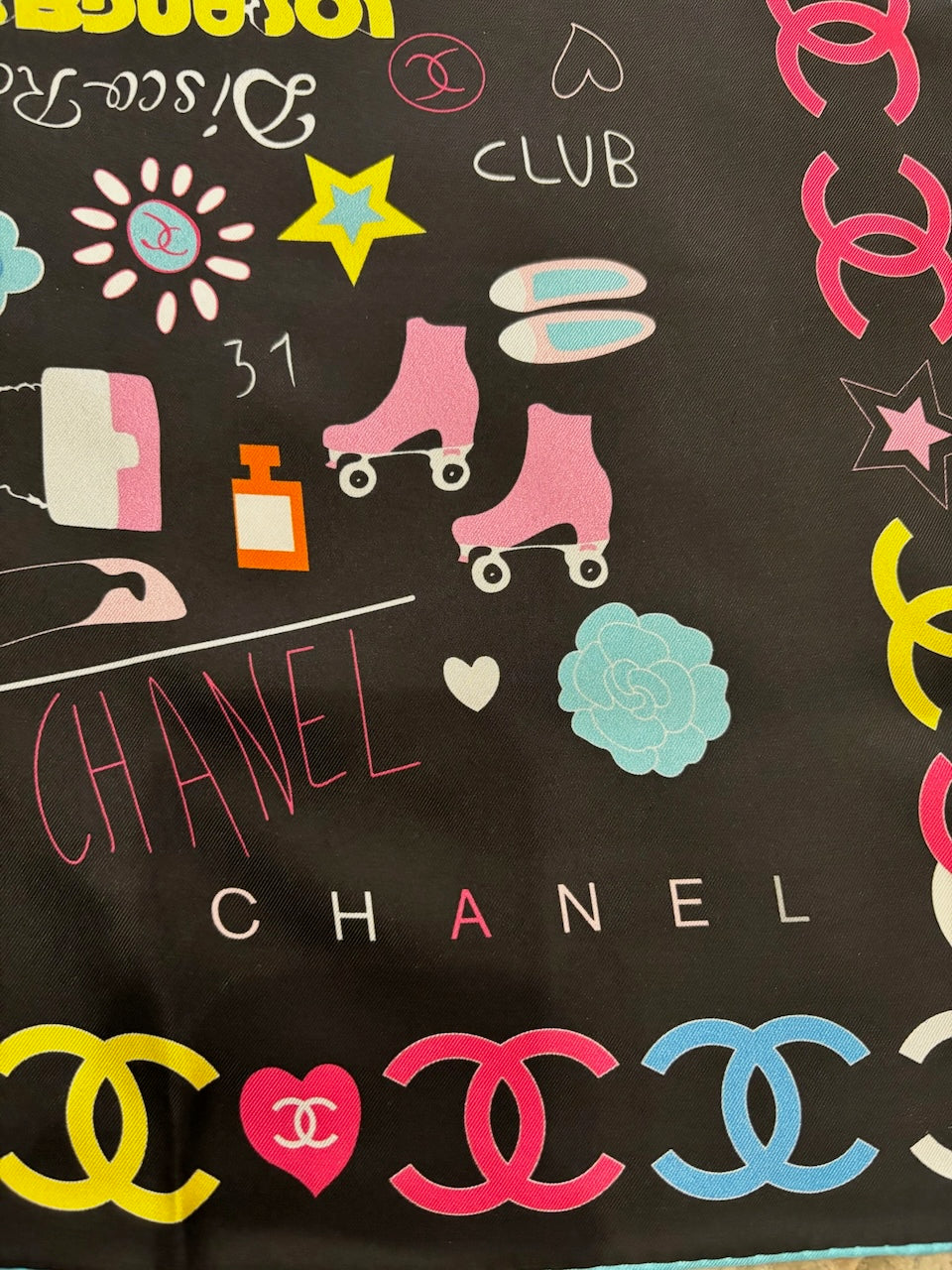 Carré 100 % soie noir avec un imprimés multicolores, logo CC et inscription Chanel.
