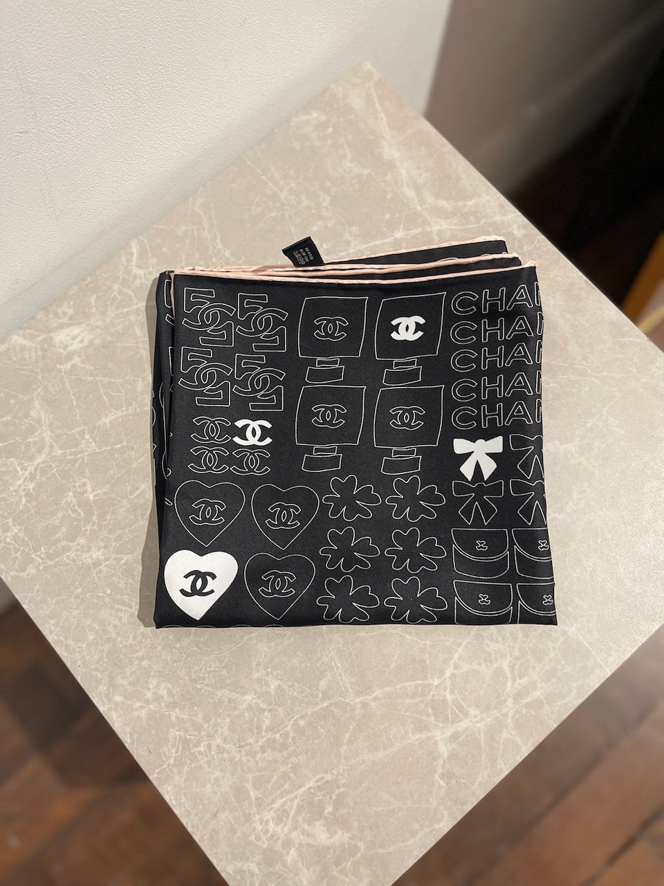 Carré en soie noir et blanc orné d'imprimés représentant des objets emblématiques de la Maison Chanel : CC, numéro 5, trèfle... Contour rose. 100% soie.