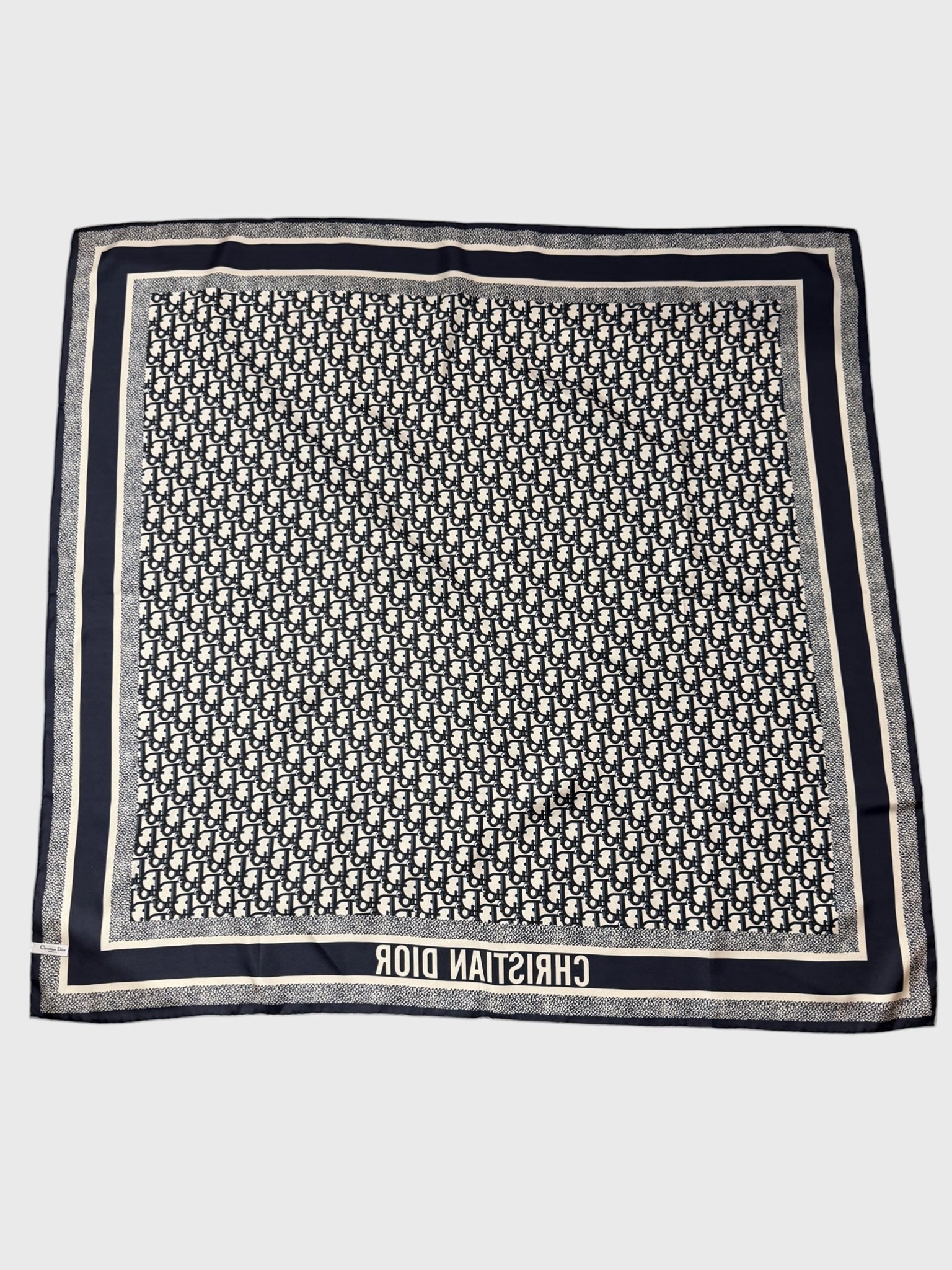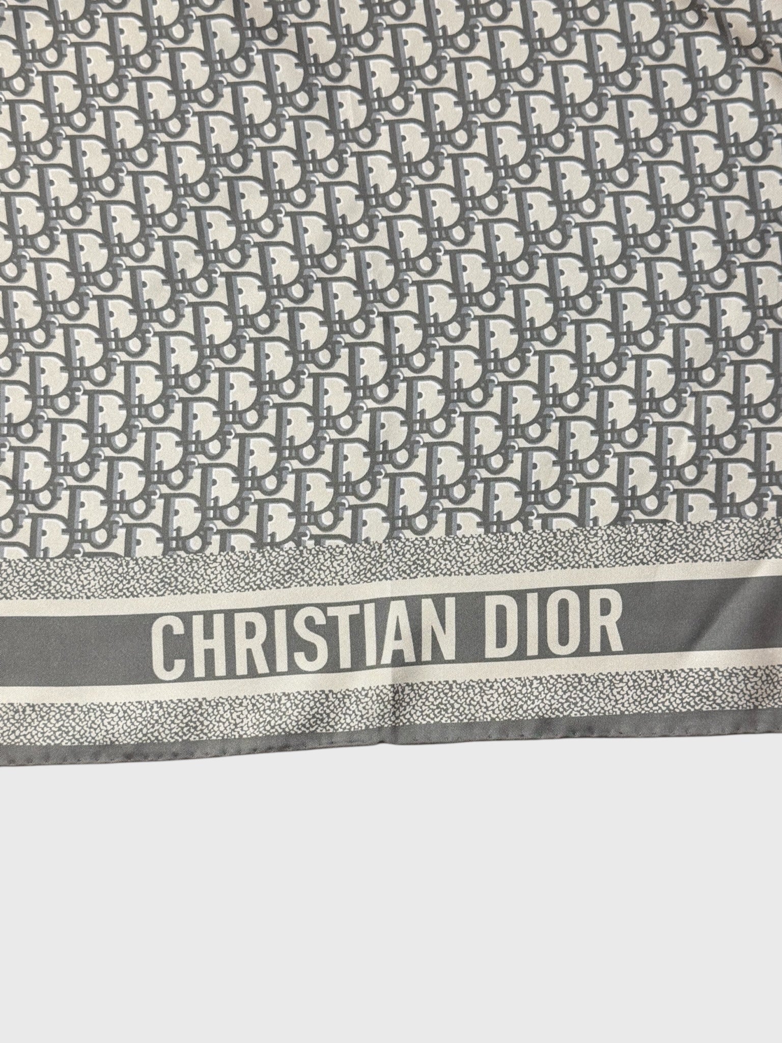Foulard 100% soie réversible à motif Dior oblique gris et bleu marine. Bordure avec signature « CHRISTIAN DIOR ».