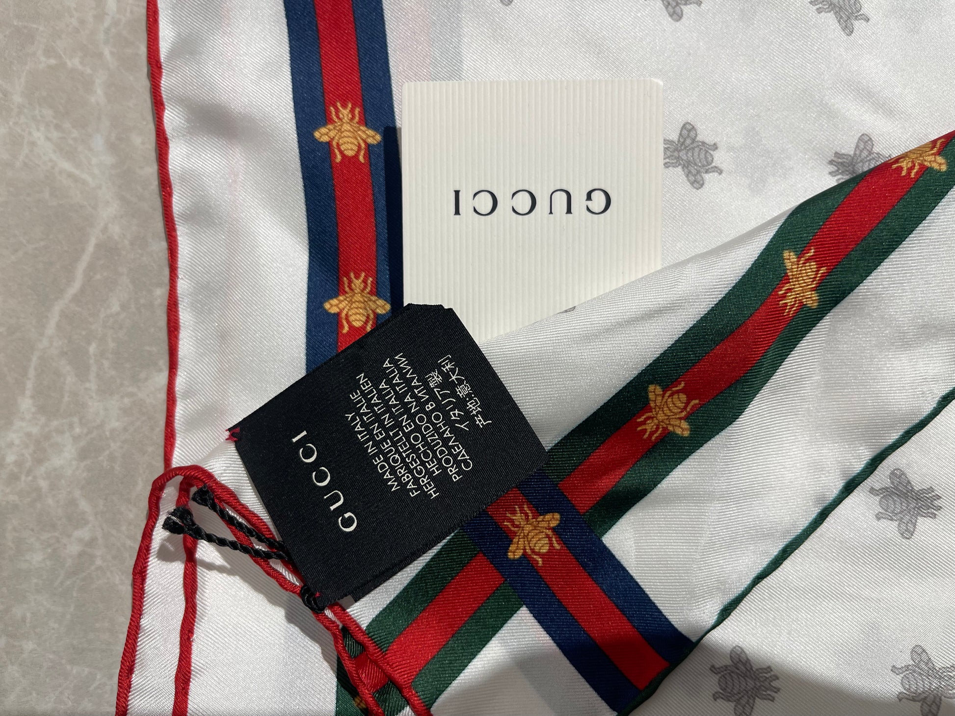 Carré en soie blanc avec motif abeille gris, bande Web Gucci bleu et verte en contour avec abeille doré. 100% soie.Neuf jamais porté, sans étiquette.