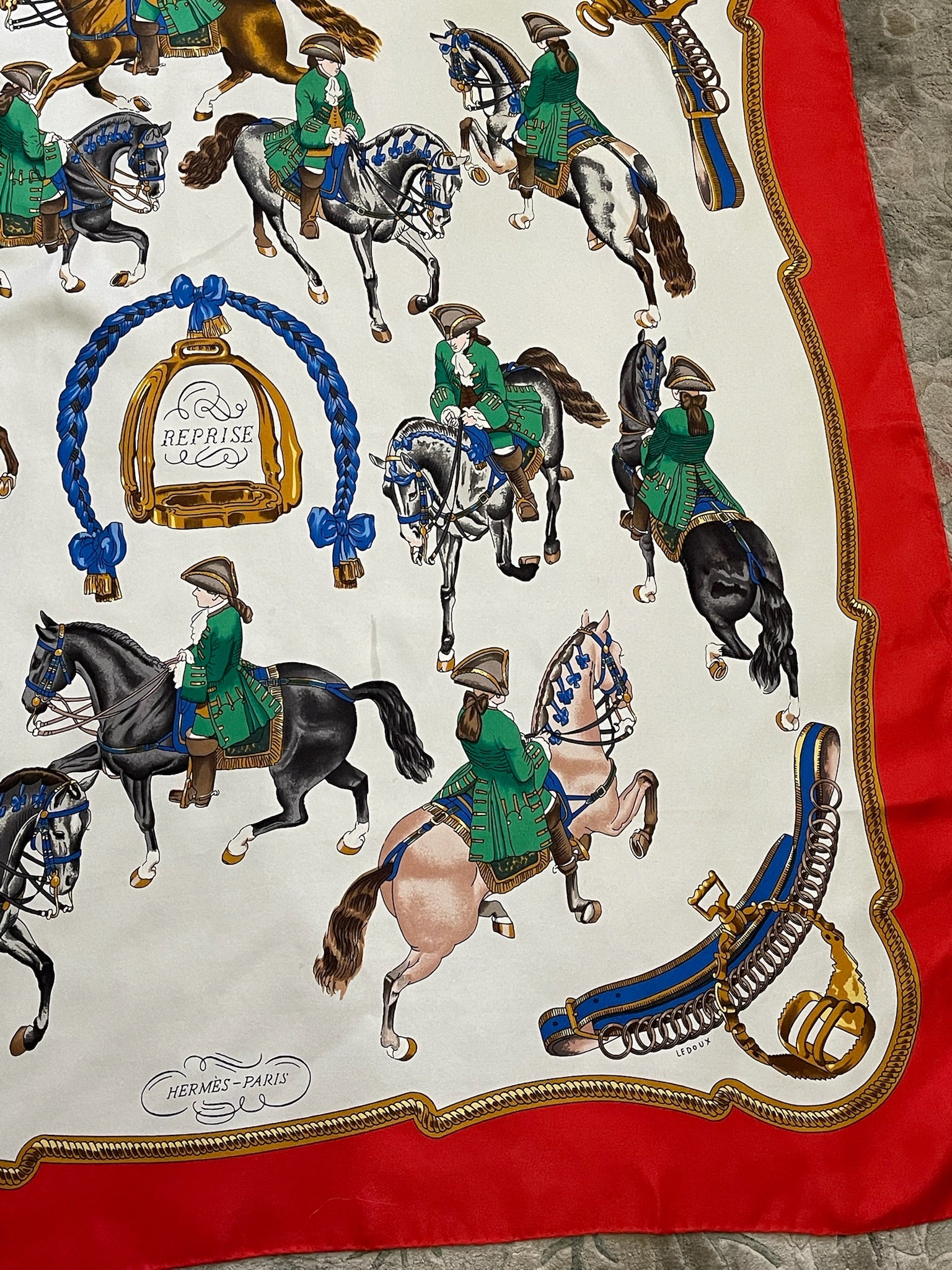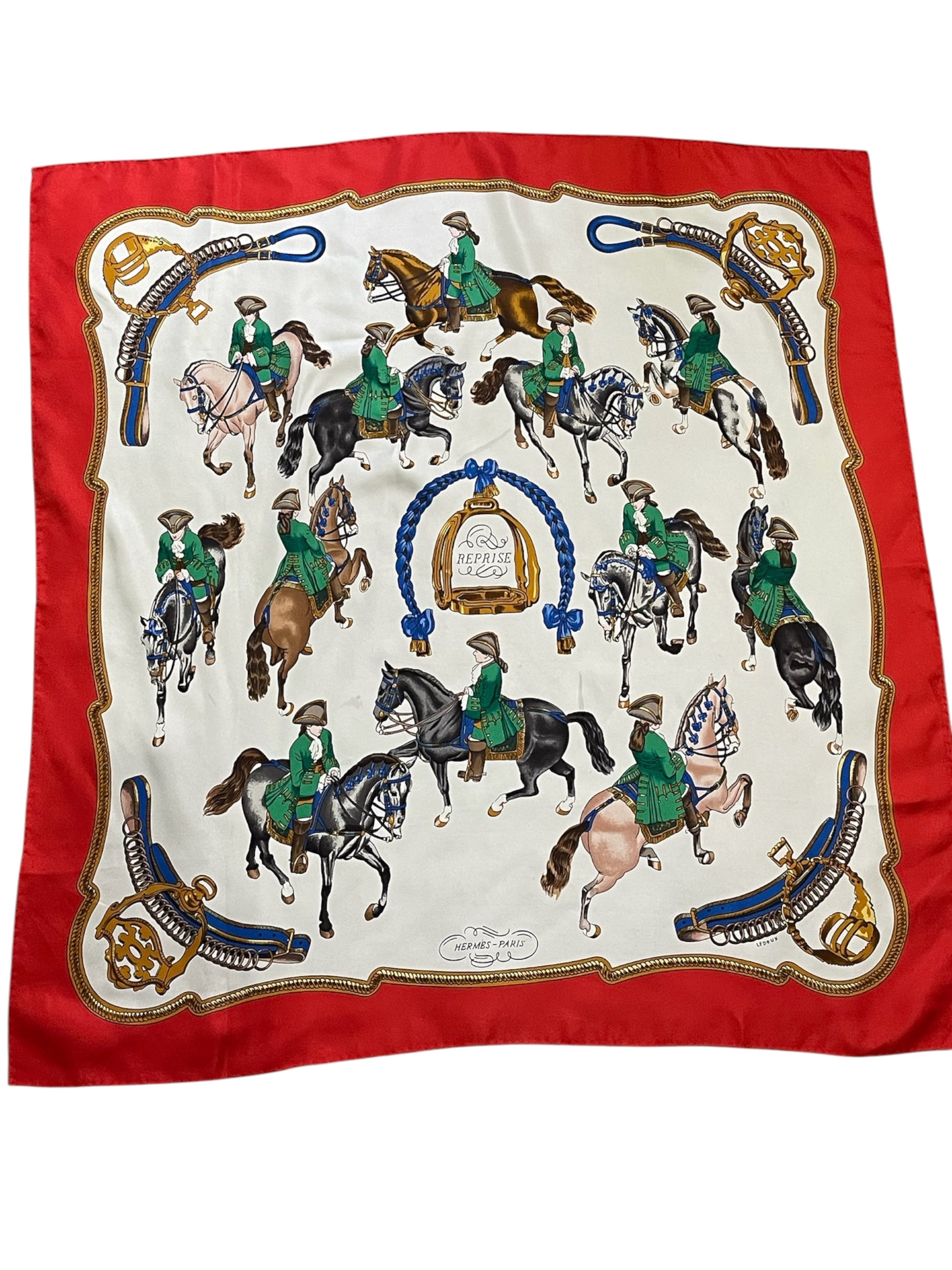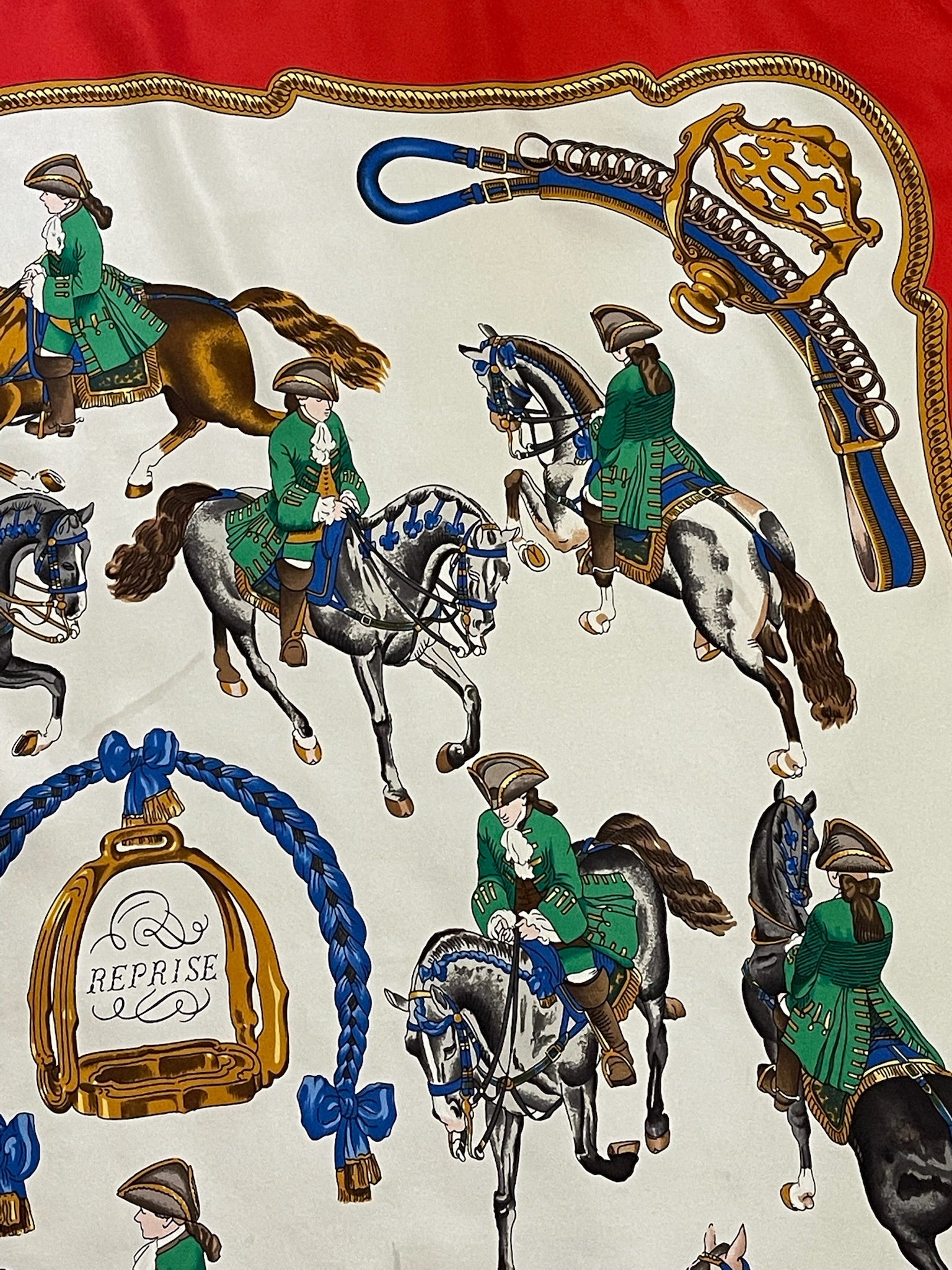 Carré 100 % soie, imprimé mise en scène à cheval sur fond blanc avec contour rouge.