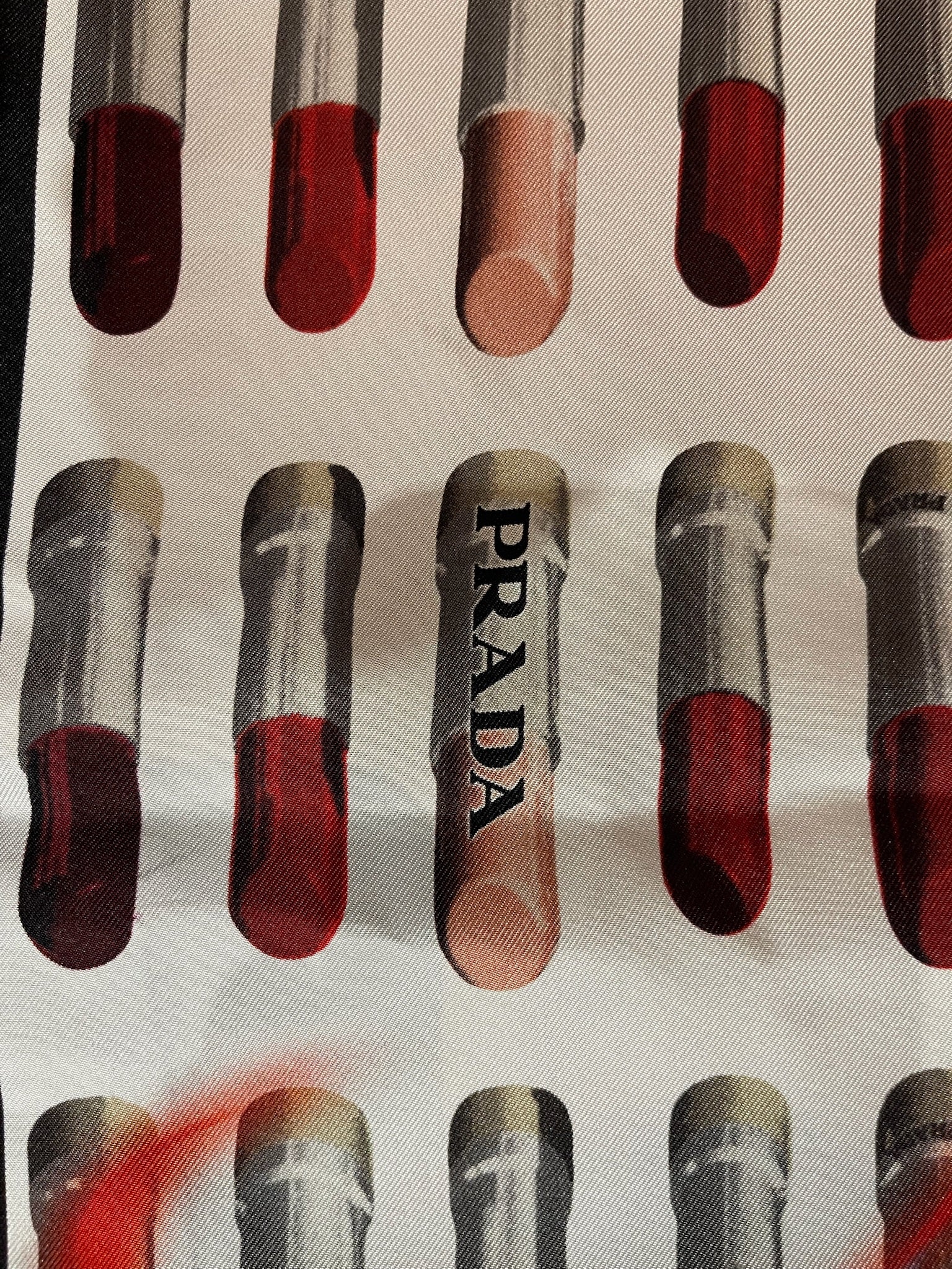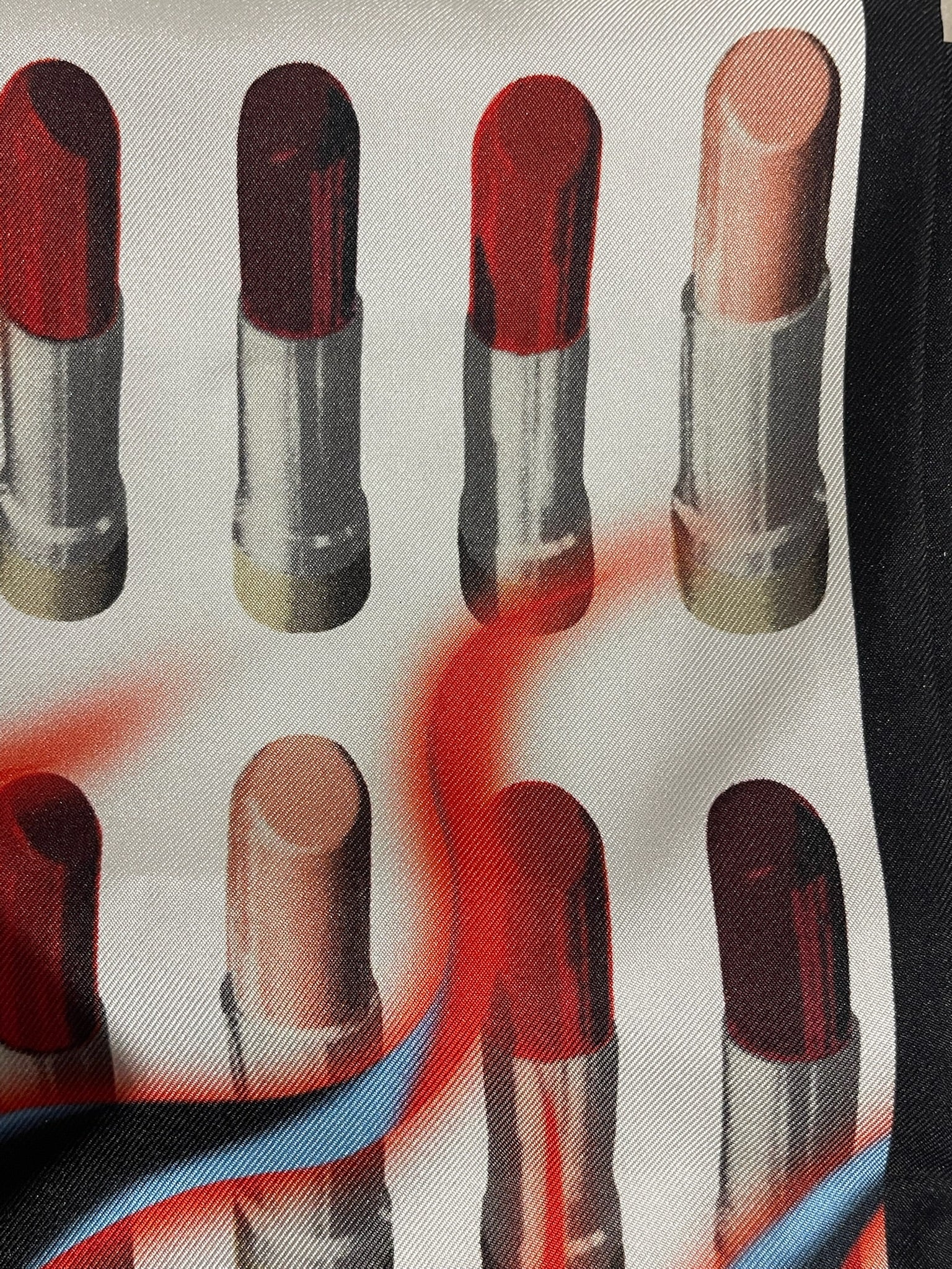 Foulard en soie noire avec motif rouges à lèvres sur fond blanc et détail de flamme sur le bas.