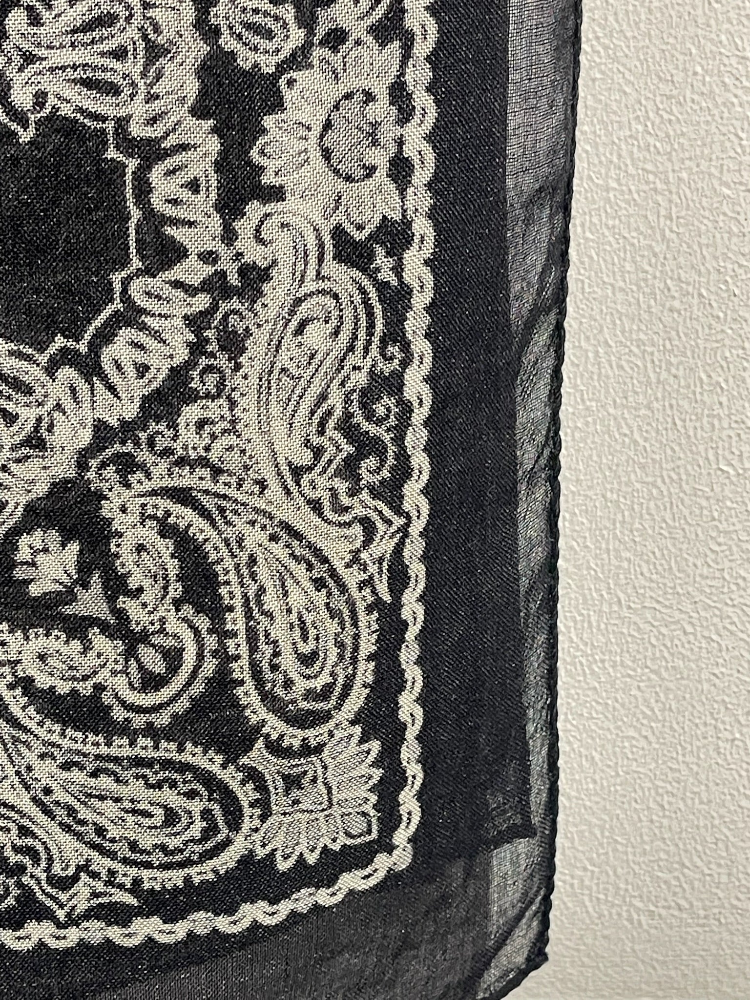 Grand foulard en cachemire et soie noir orné d'un motif bandana blanc.