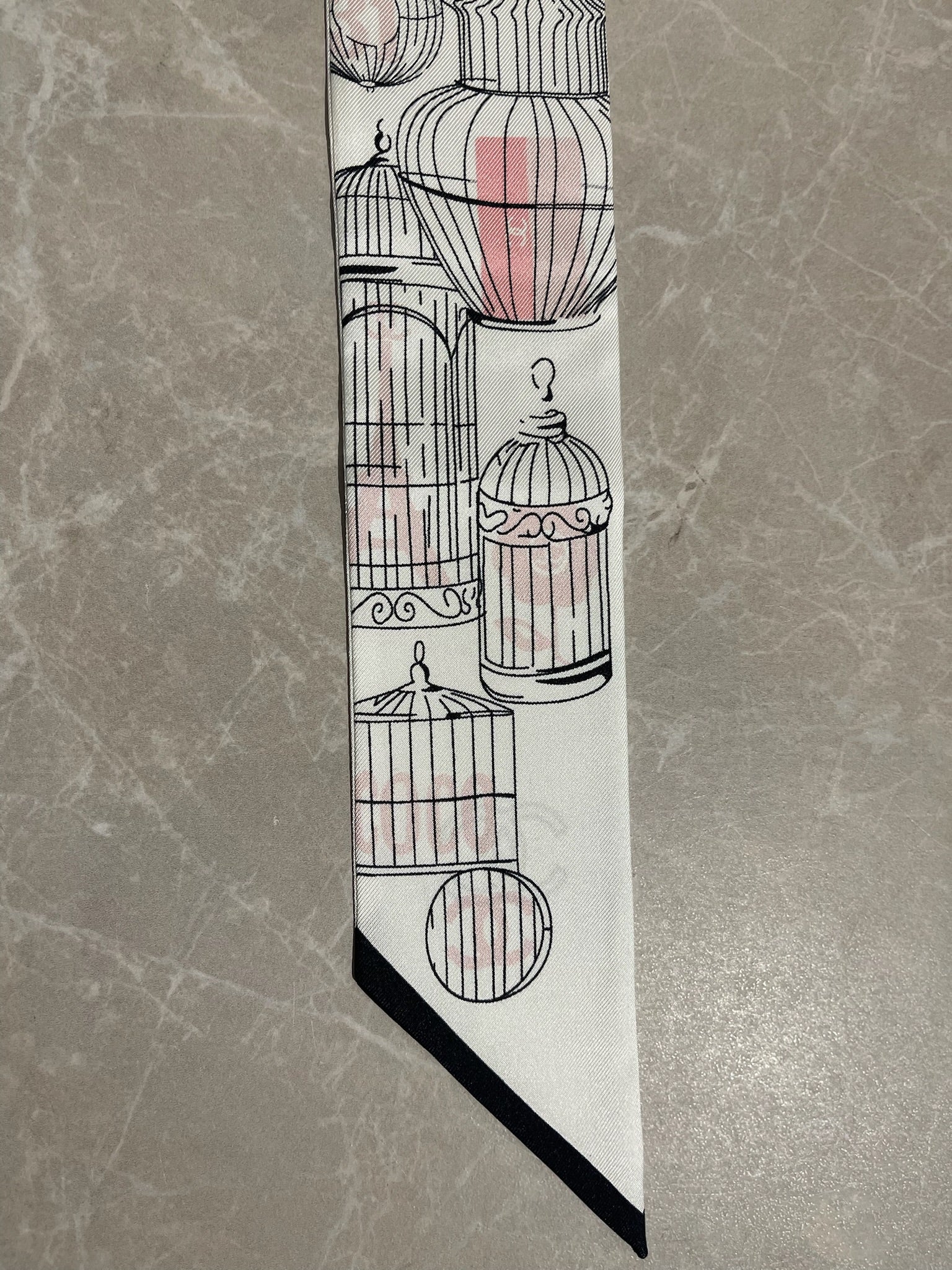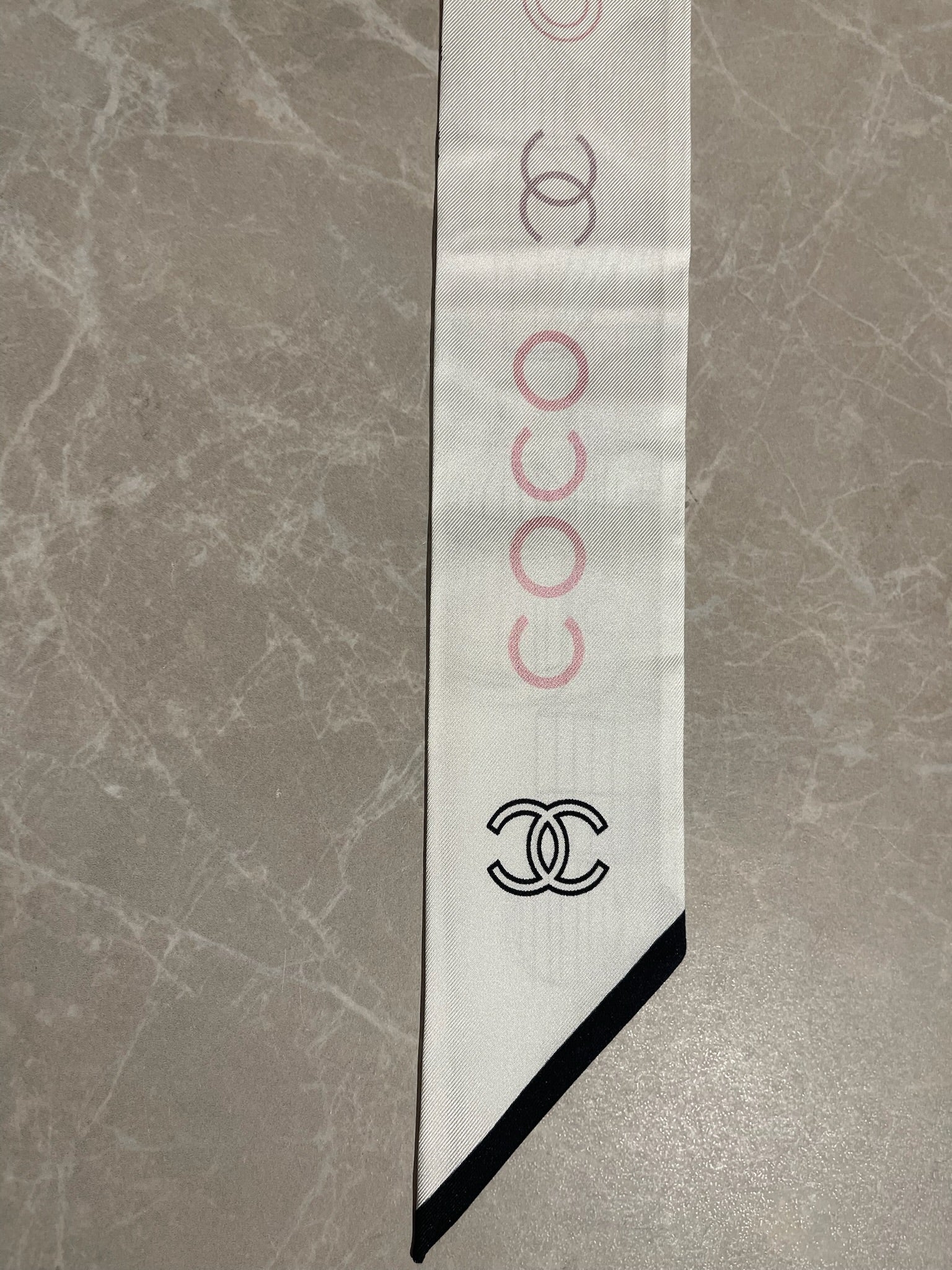 Slim bandeau en soie blanc avec à motifs cages d'oiseaux d'un coté, logo CC et inscription COCO Chanel rose de l'autre.