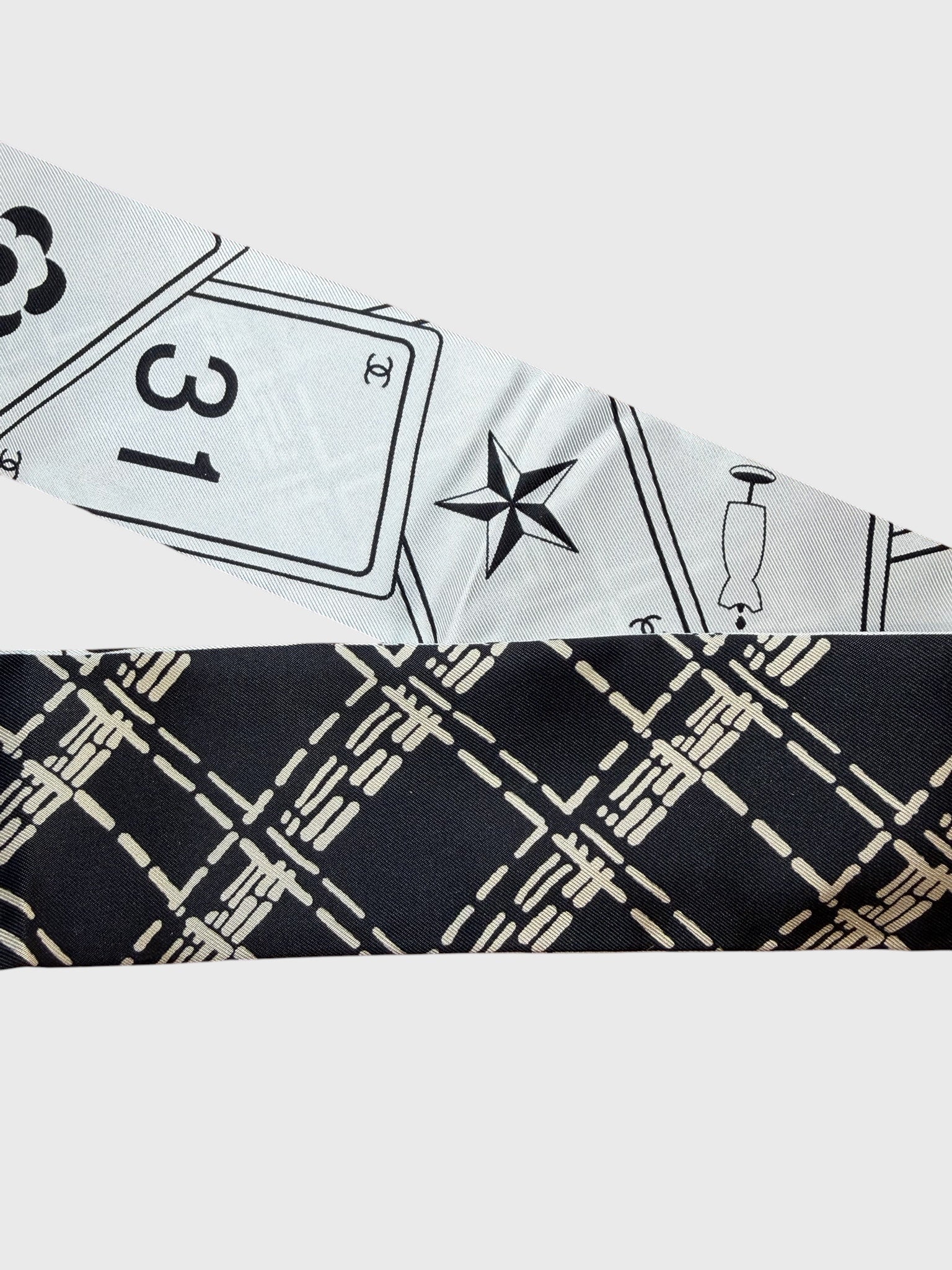 Slim bandeau en 100% soie noir orné d'un imprimé linaire beige d'un coté style tweed et de jeux de carte Chanel de l'autre sur un fond blanc.