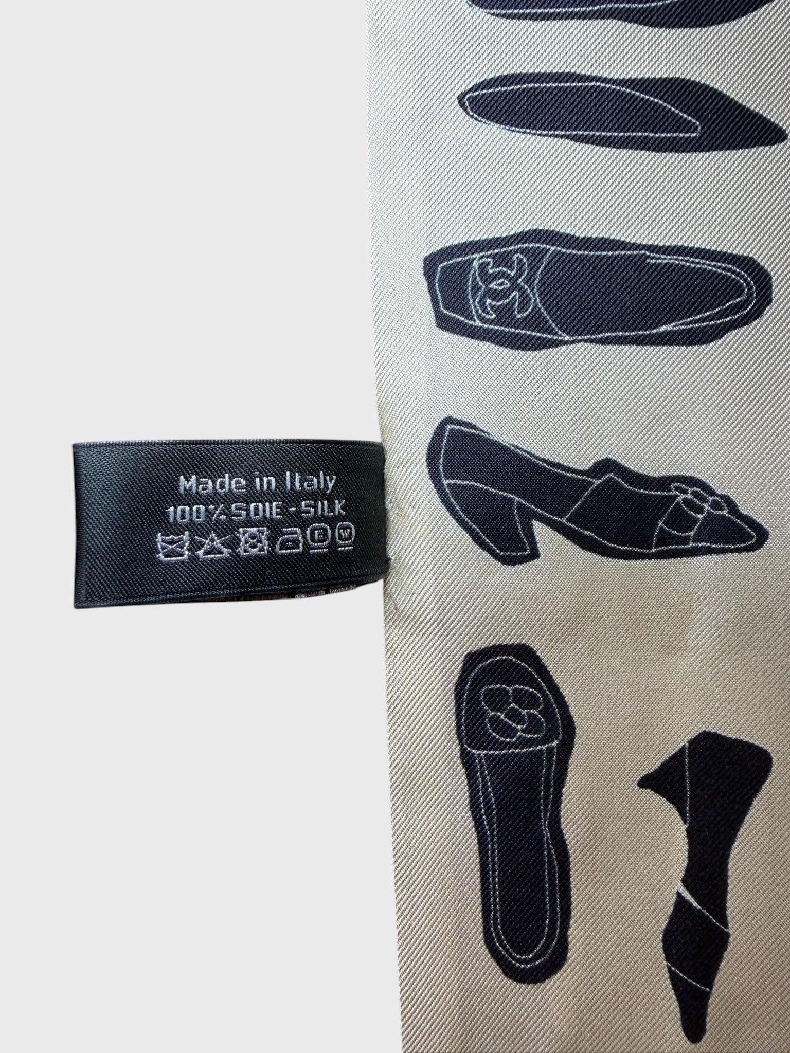 Slim bandeau en 100% soie orné d'un imprimé d'accessoires Chanel, blanc cassé d'un coté et noir de l'autre.