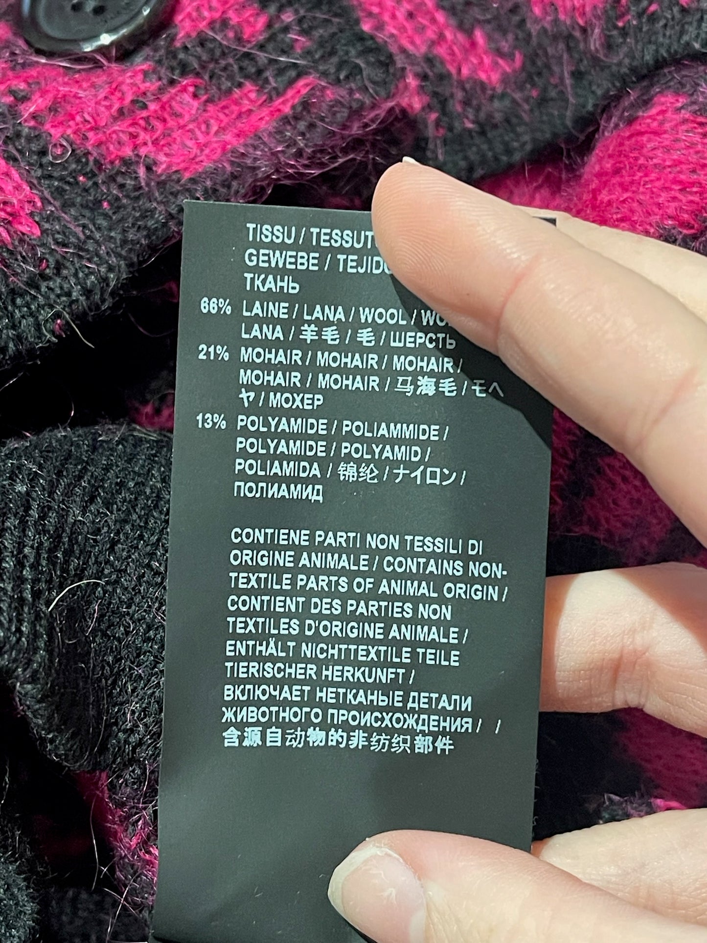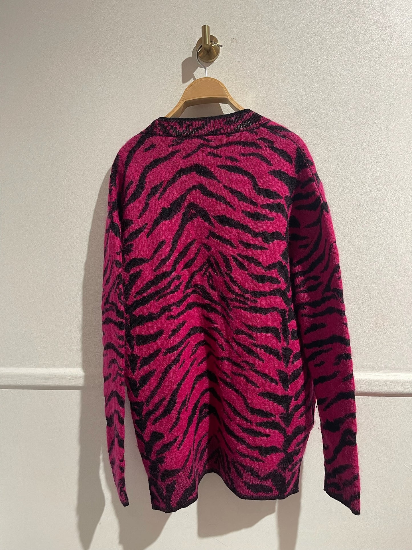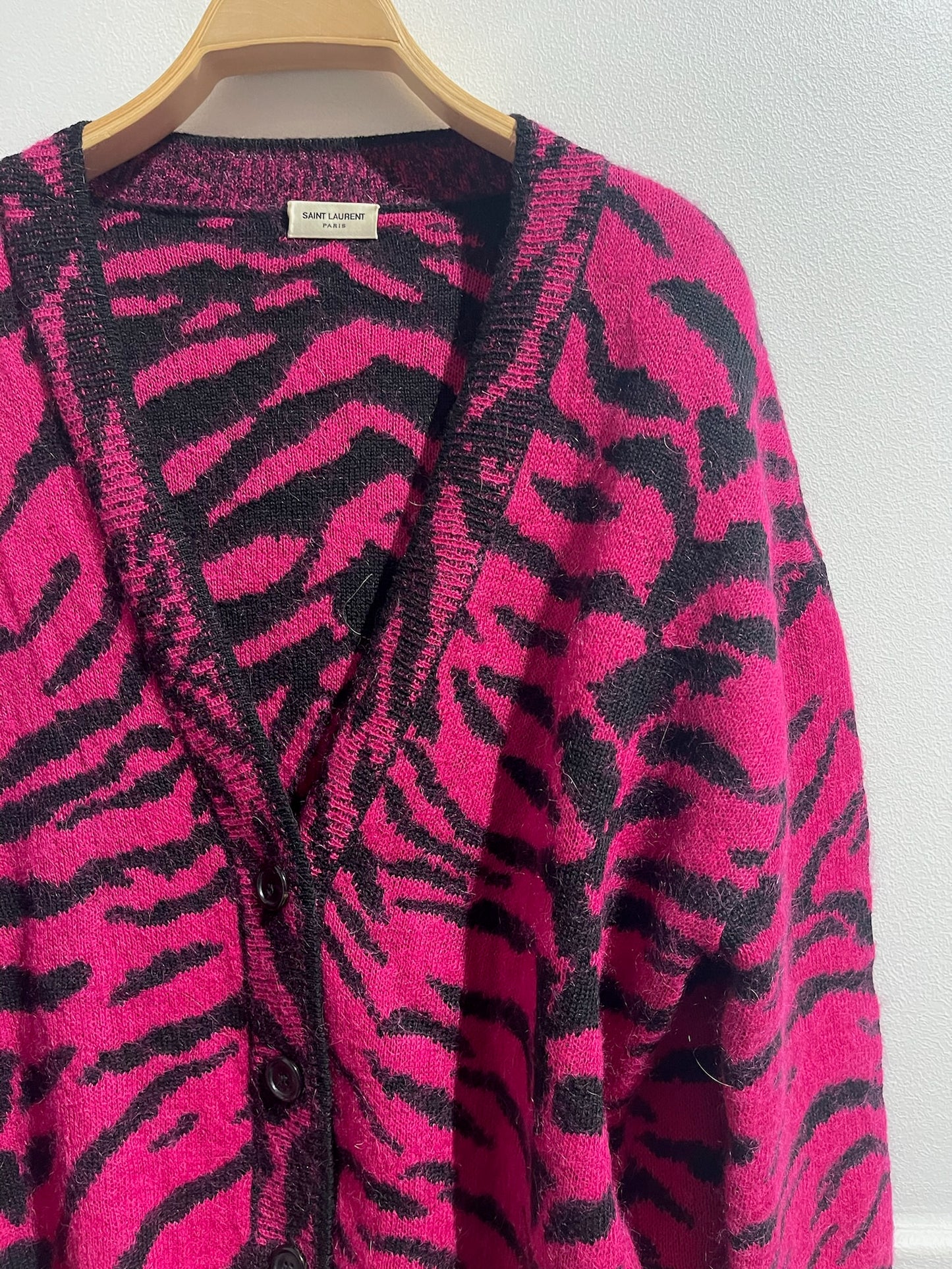 Gilet en laine à motif zèbre rose et noir. Col V avec fermeture boutonnée.