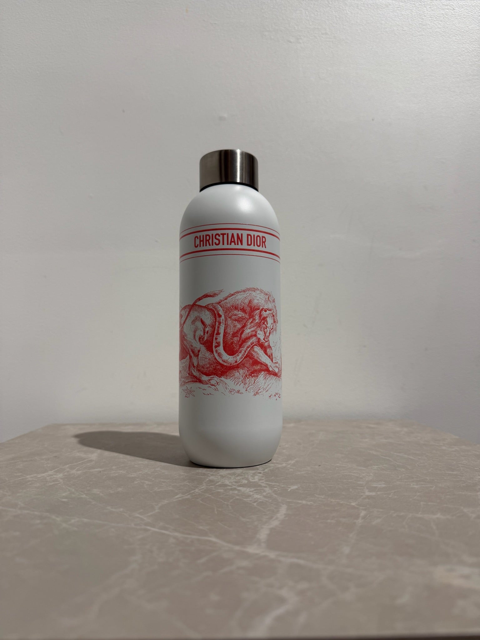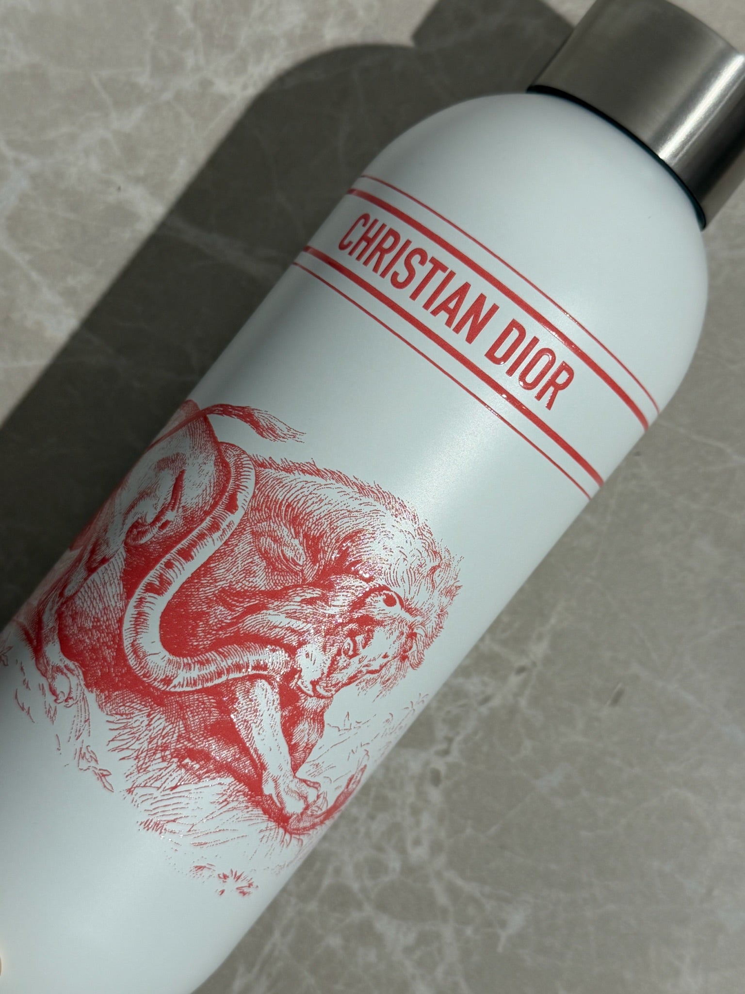 Gourde en acier inoxydable blanc, imprimé animalier rose avec écriture Christian Dior. Bouchon à vis argenté signé CD.