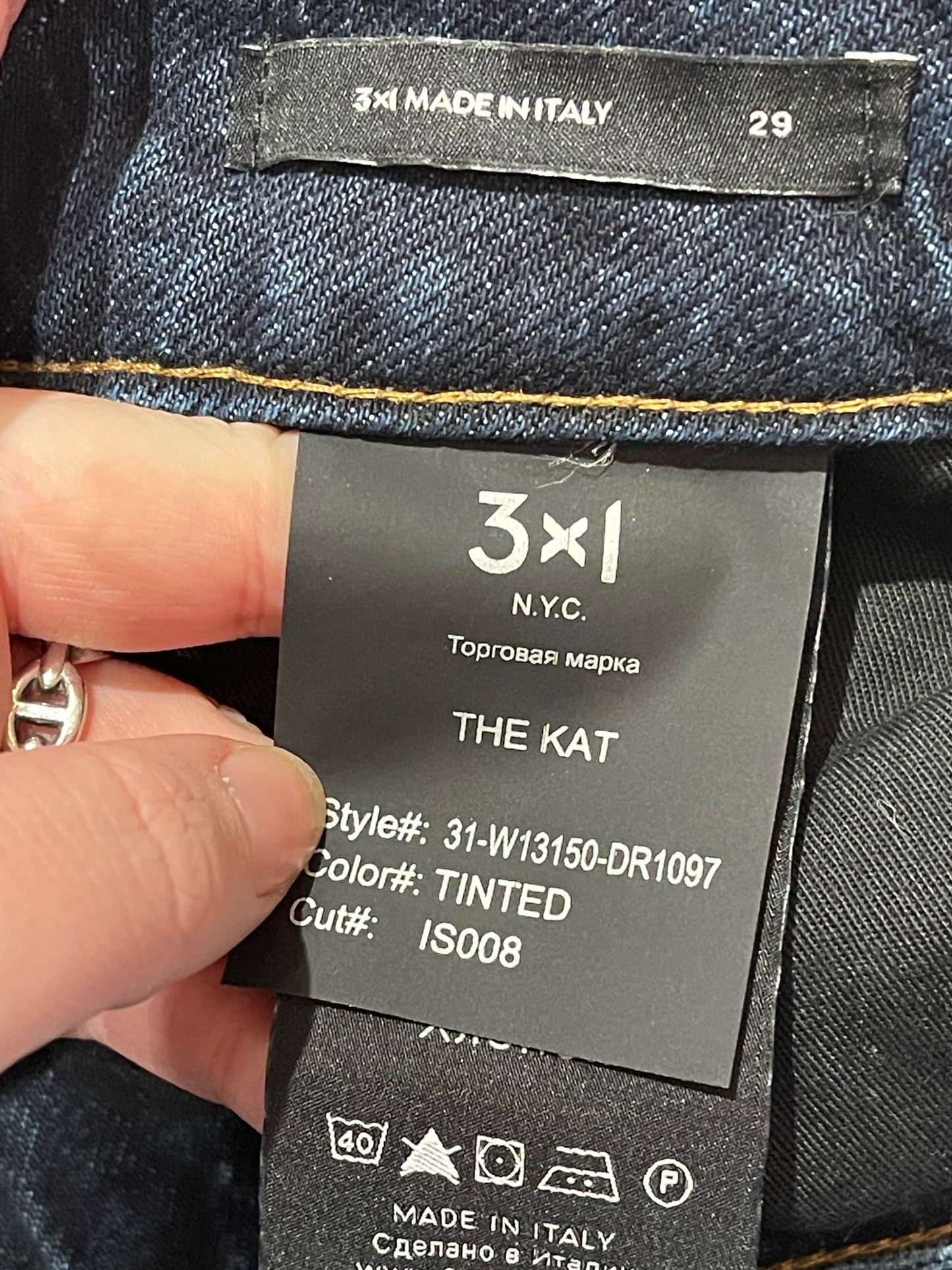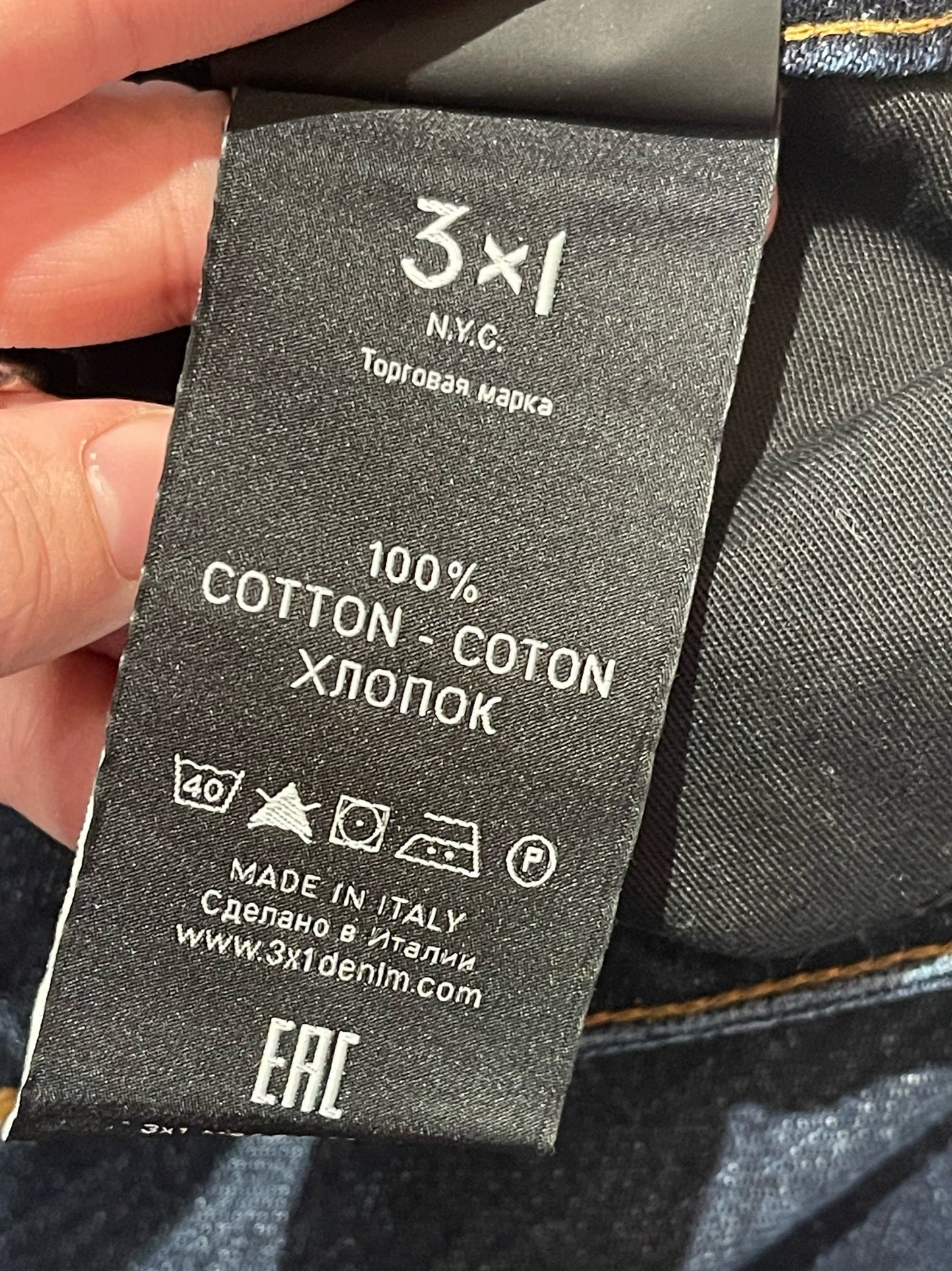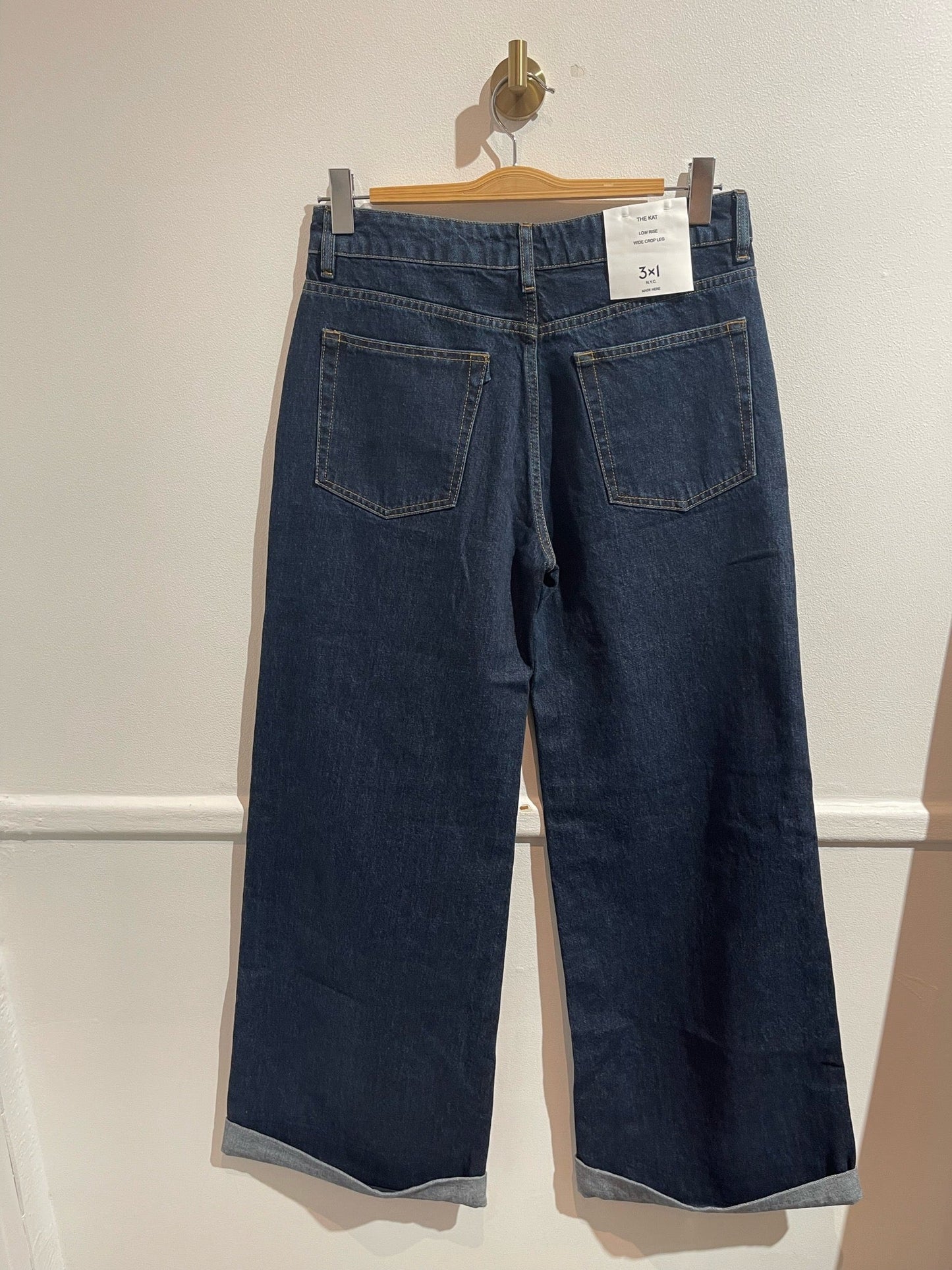 Jeans en coton stretch bleu brut. Taille basse. Ourlets à revers. Coupe large et crop (écourtée).