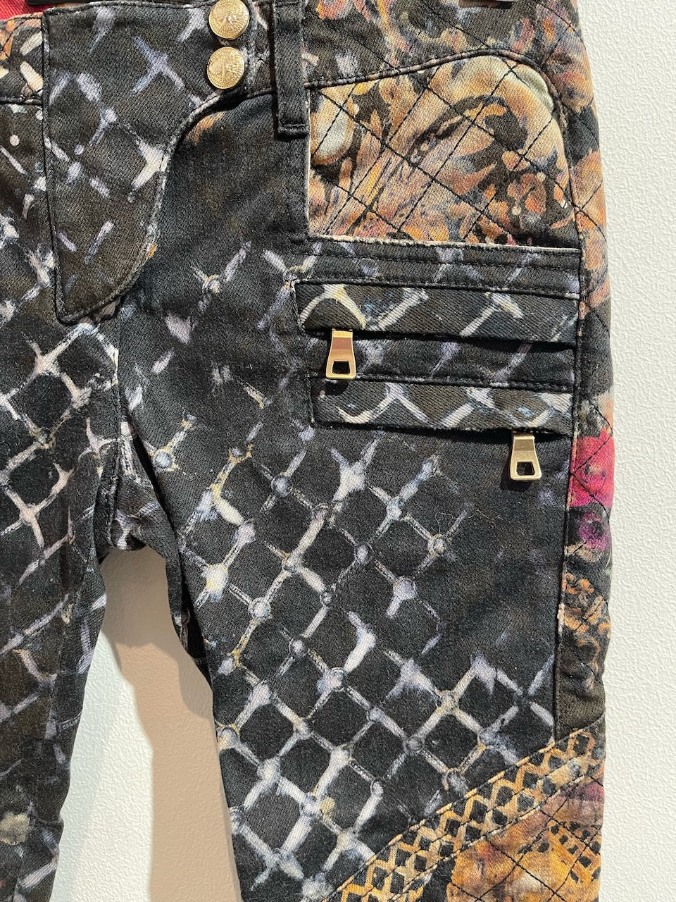Jean Biker en coton noir avec imprimé coloré, détails de surpiqûres, fermeture par jolies boutons dorés, poches latérales et poches arrière zip. Ourlets avec zip. Coupe slim.