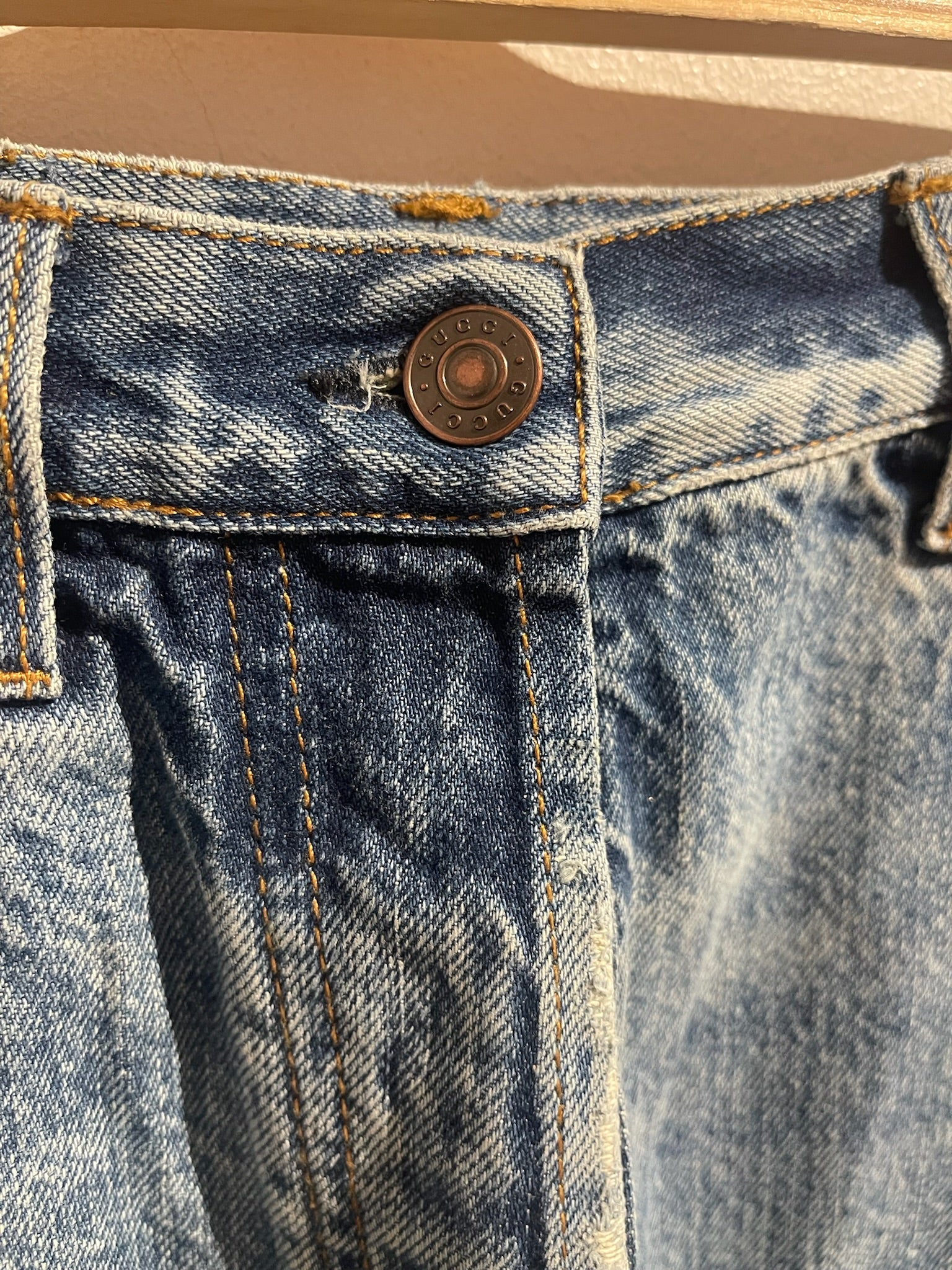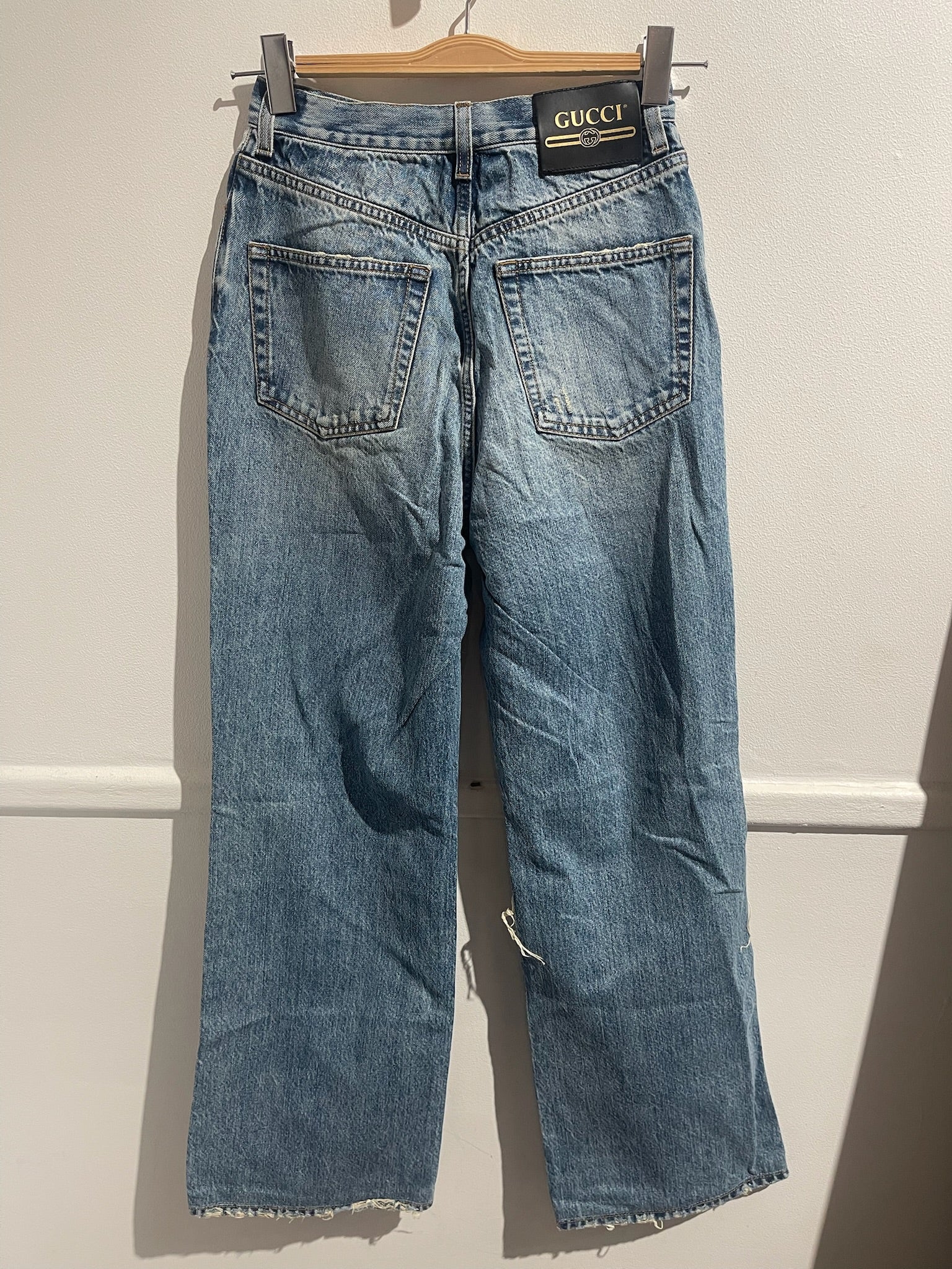 Jeans en coton bleu effet délavé avec trous et effet d'usure d'origine. Fermeture zippée et bouton à la taille. 5 poches. Logo Prada sur patch en cuir à l'arrière. Coupe droite et large.