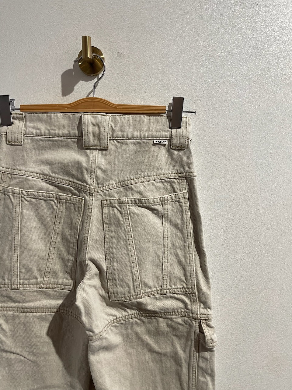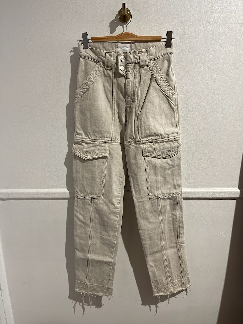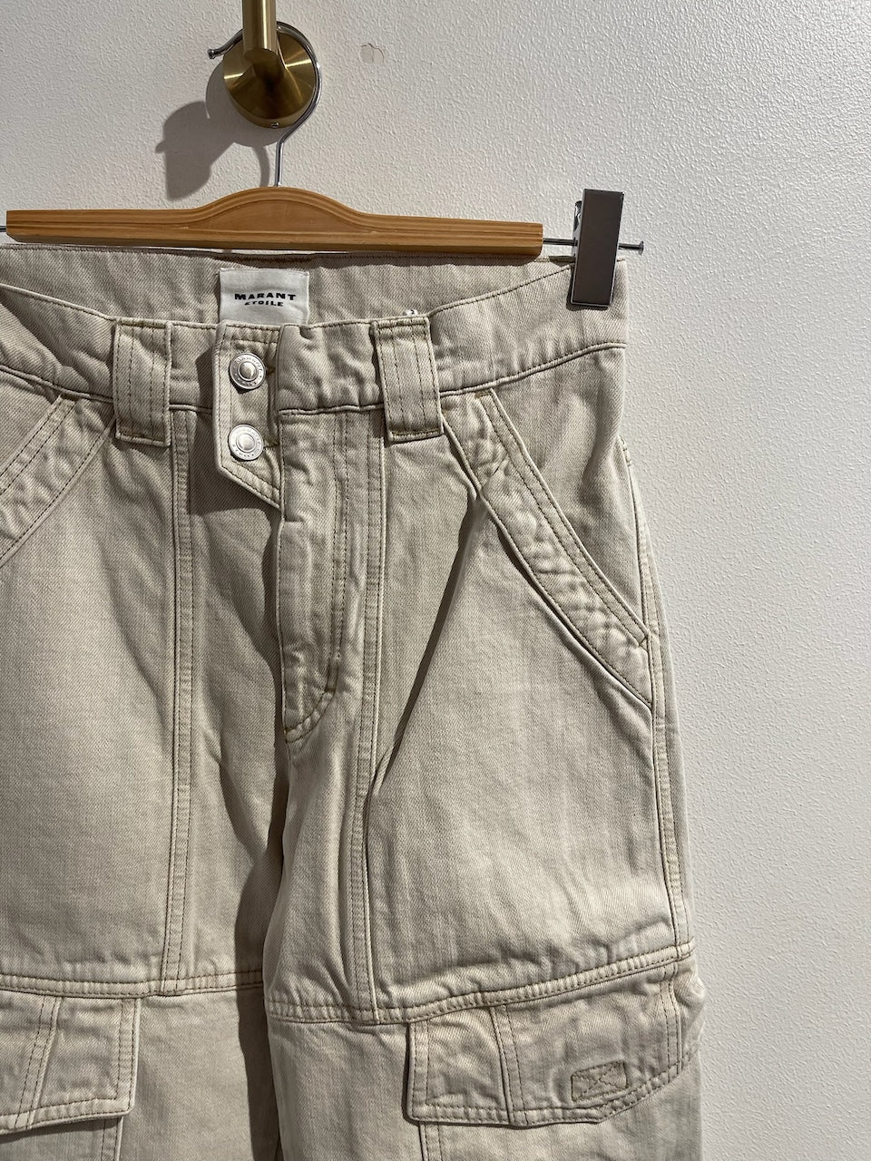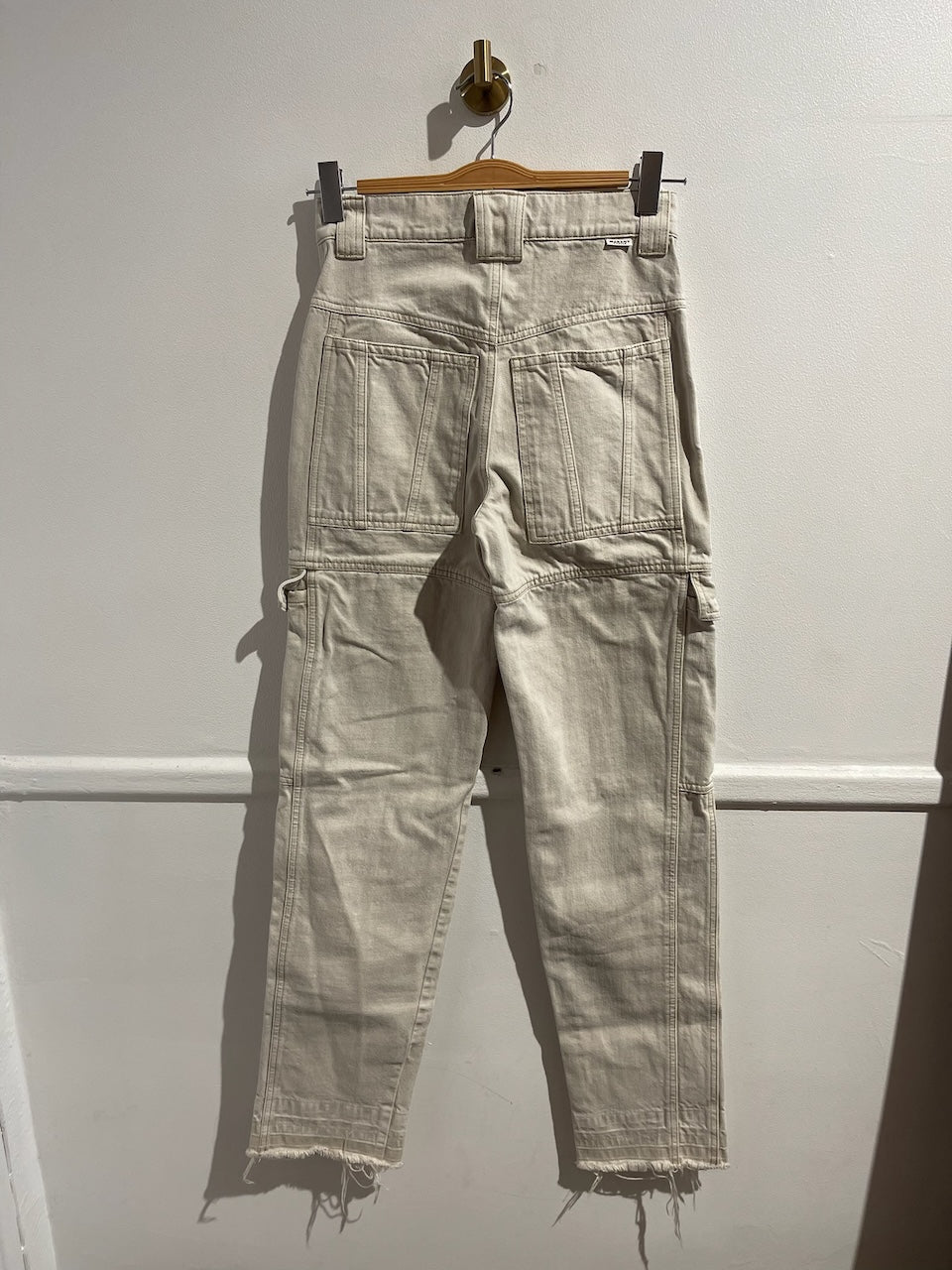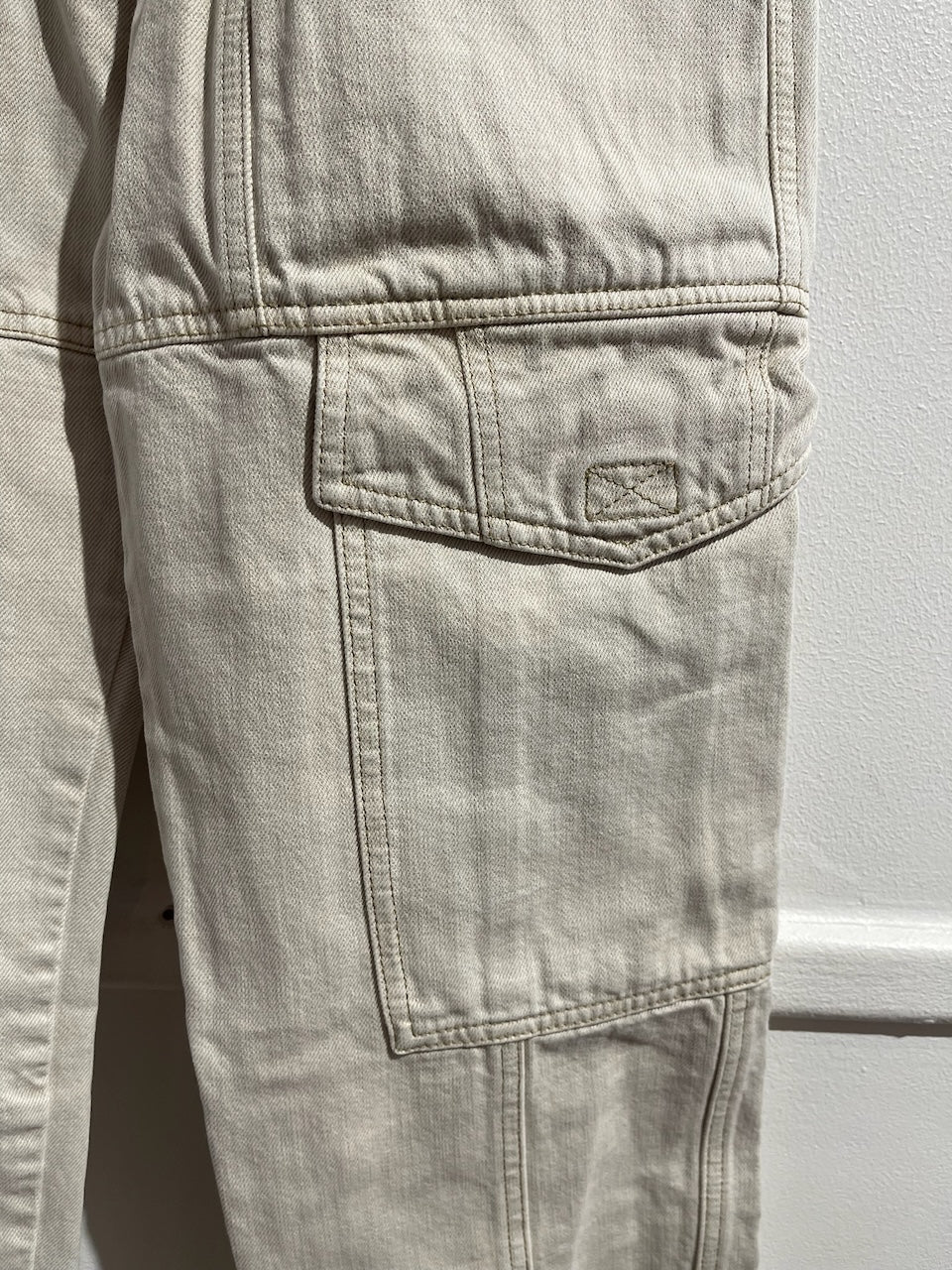 Jeans en coton beige clair avec surpiqures contrastantes, fermeture zippée et boutons à la taille. Poches avant et poches latérales effet cargo. Ourlets francs. Coupe droite.