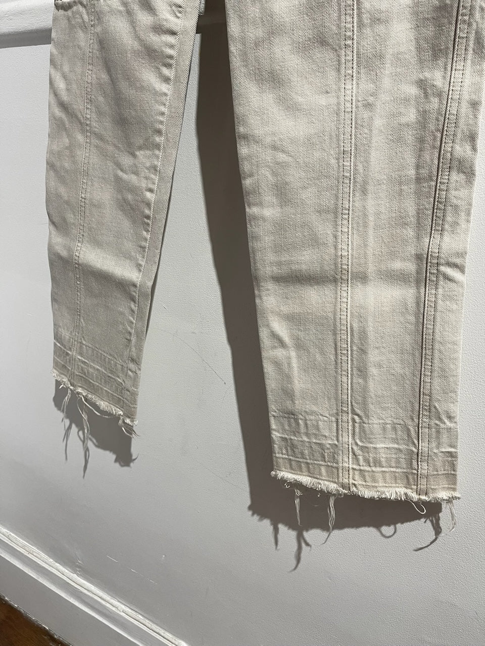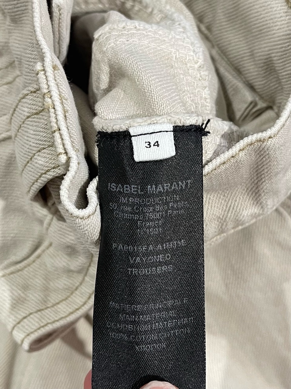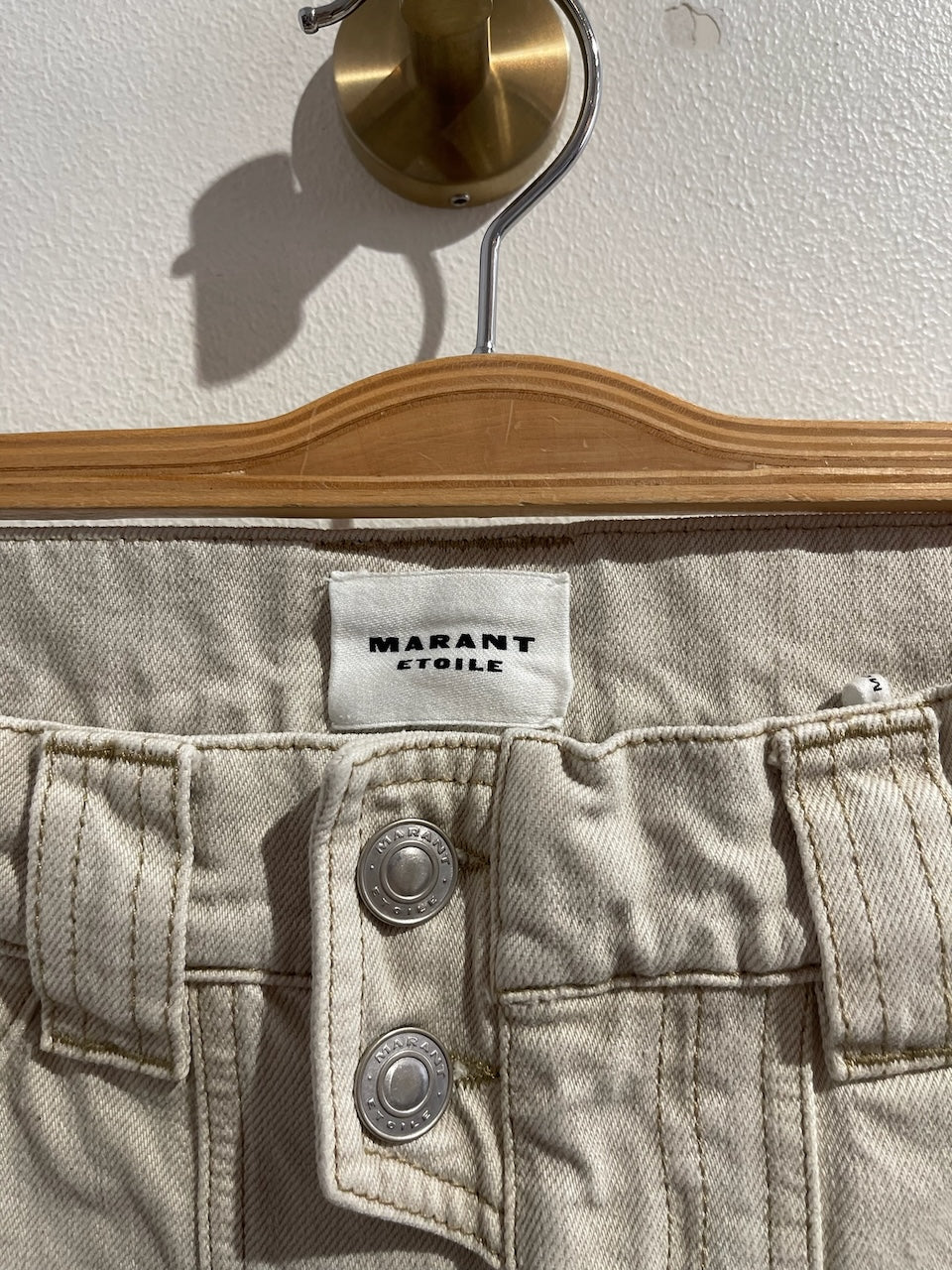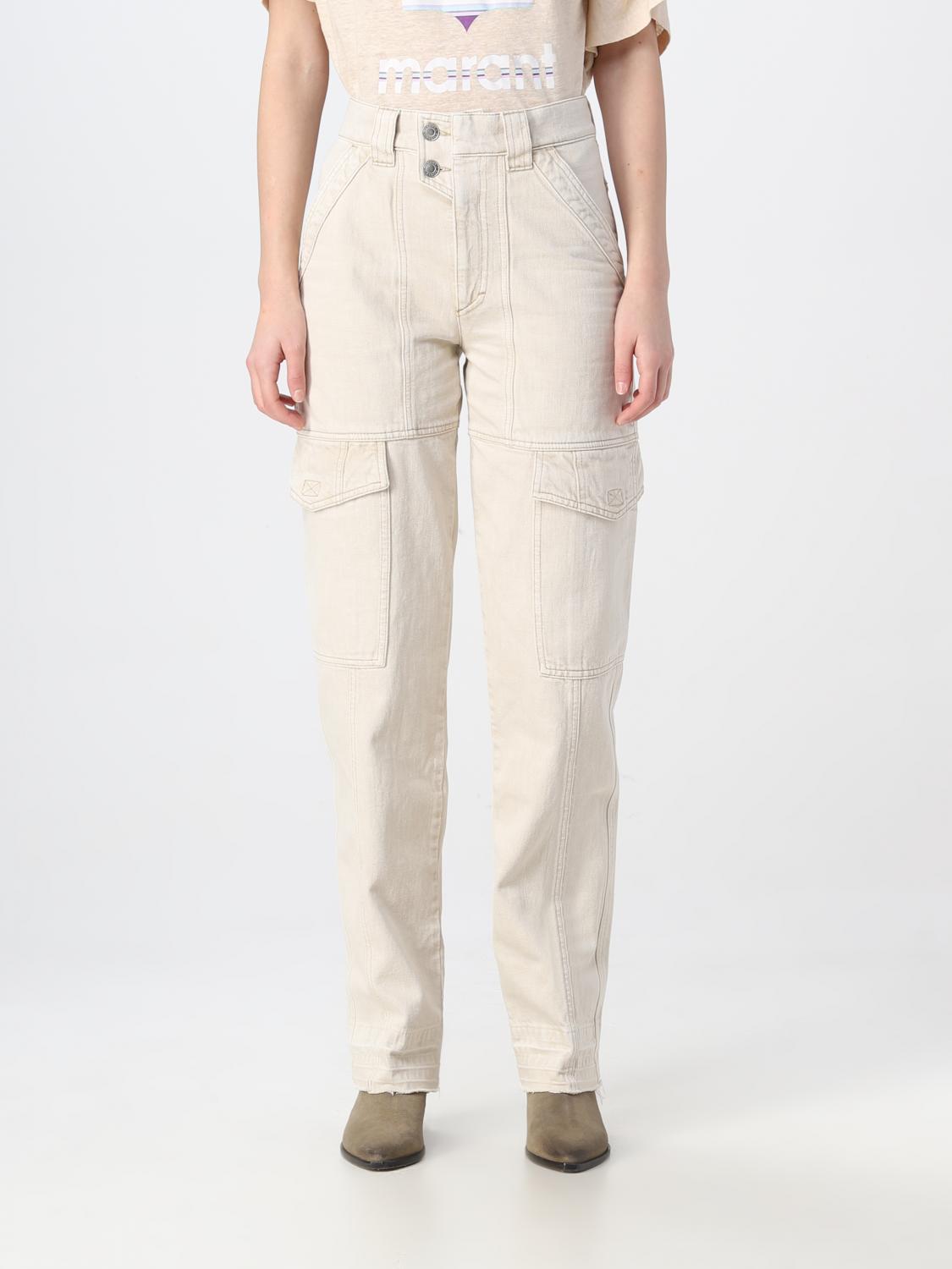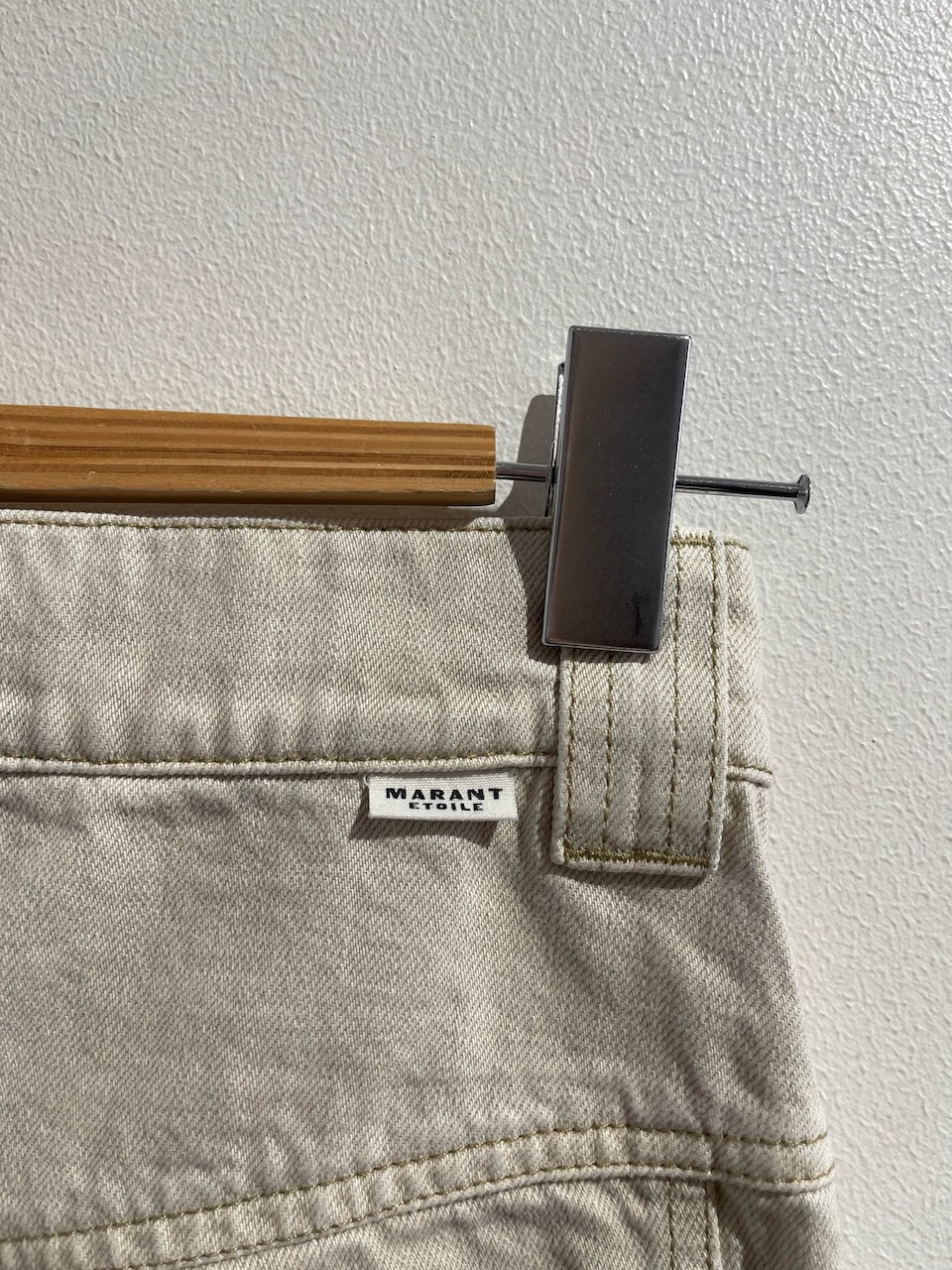 Jeans en coton beige clair avec surpiqures contrastantes, fermeture zippée et boutons à la taille. Poches avant et poches latérales effet cargo. Ourlets francs. Coupe droite.