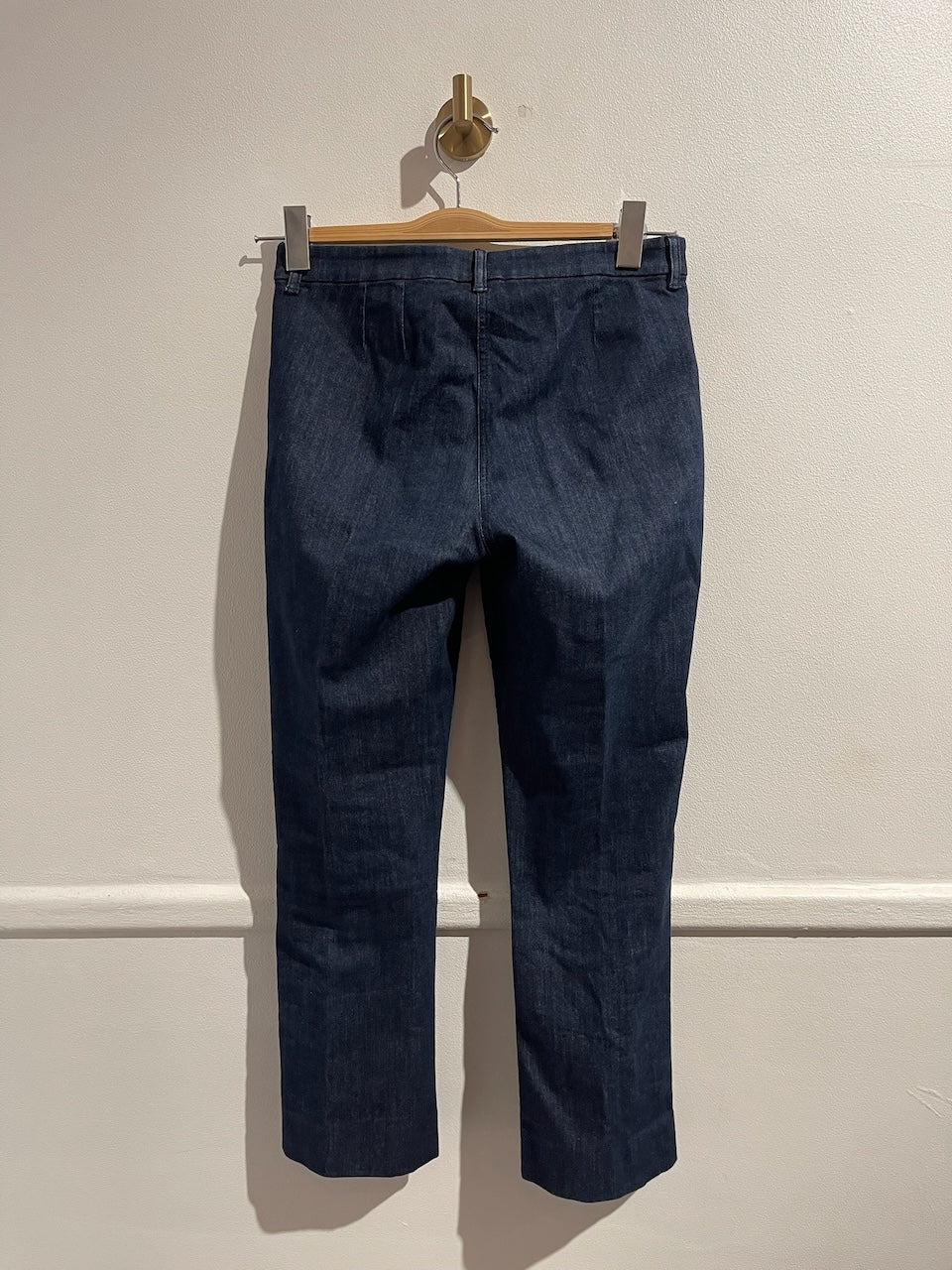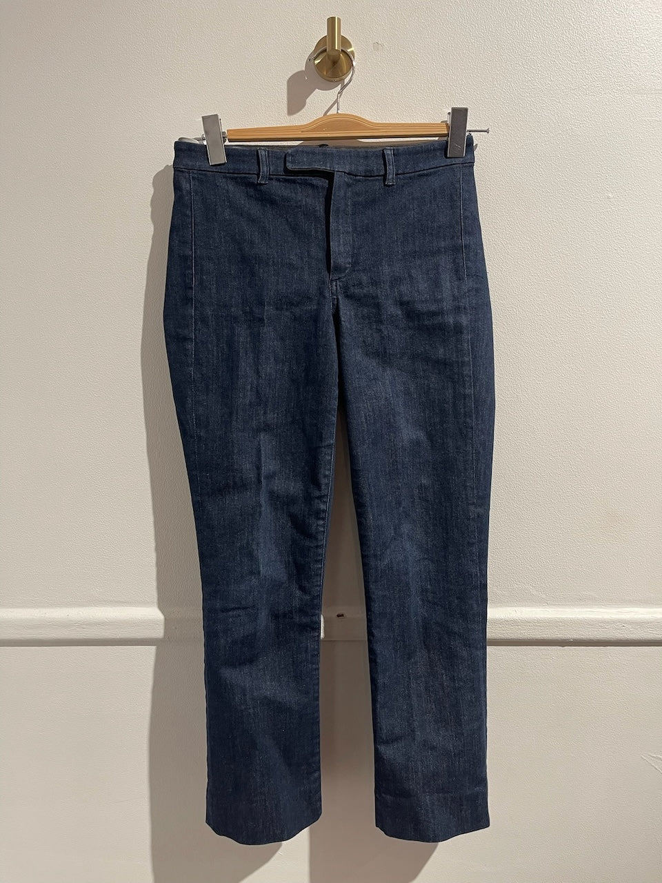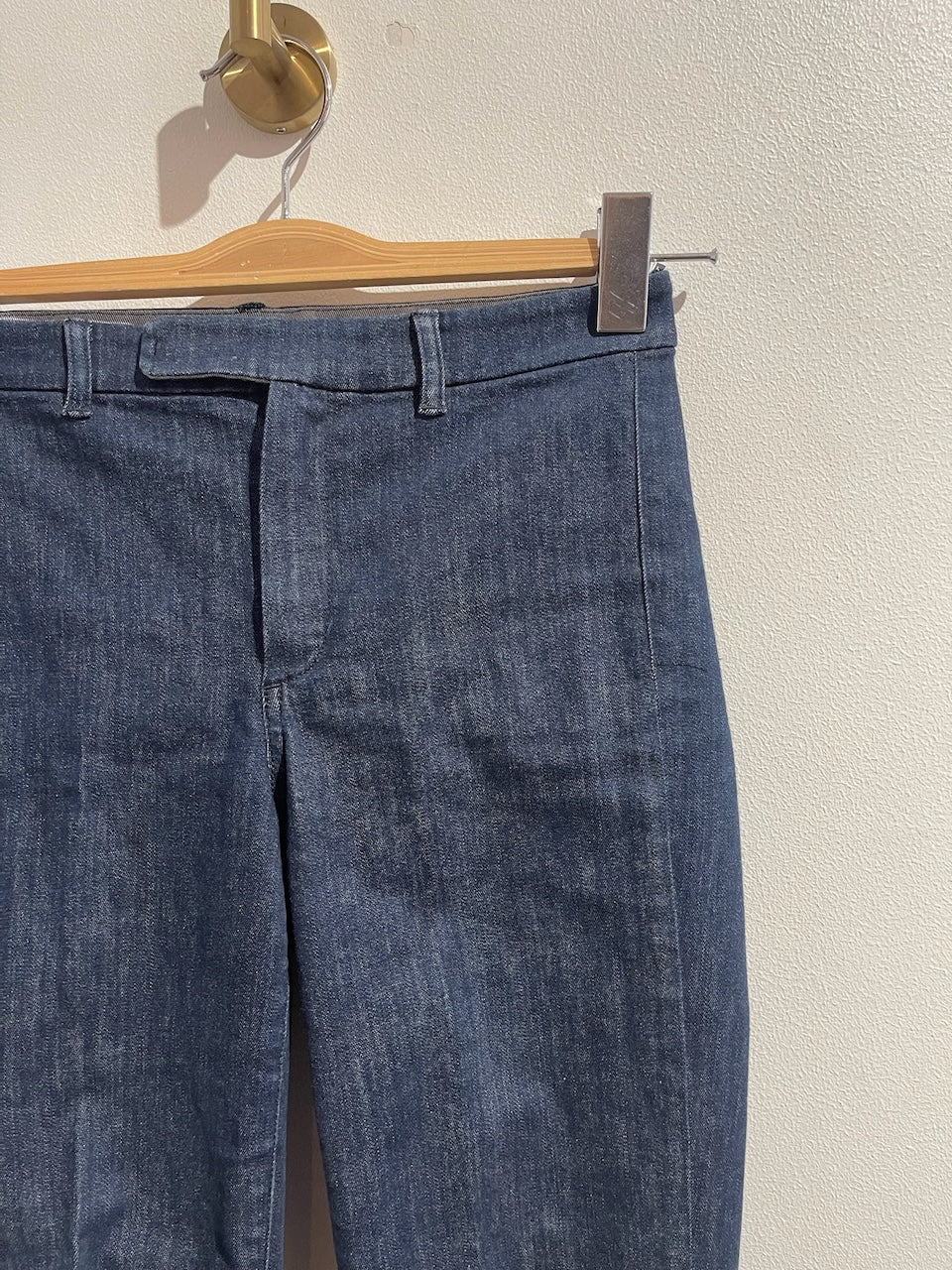 Jeans en coton bleu avec fermeture zippée et crochet à la taille. Coupe légèrement évasée.