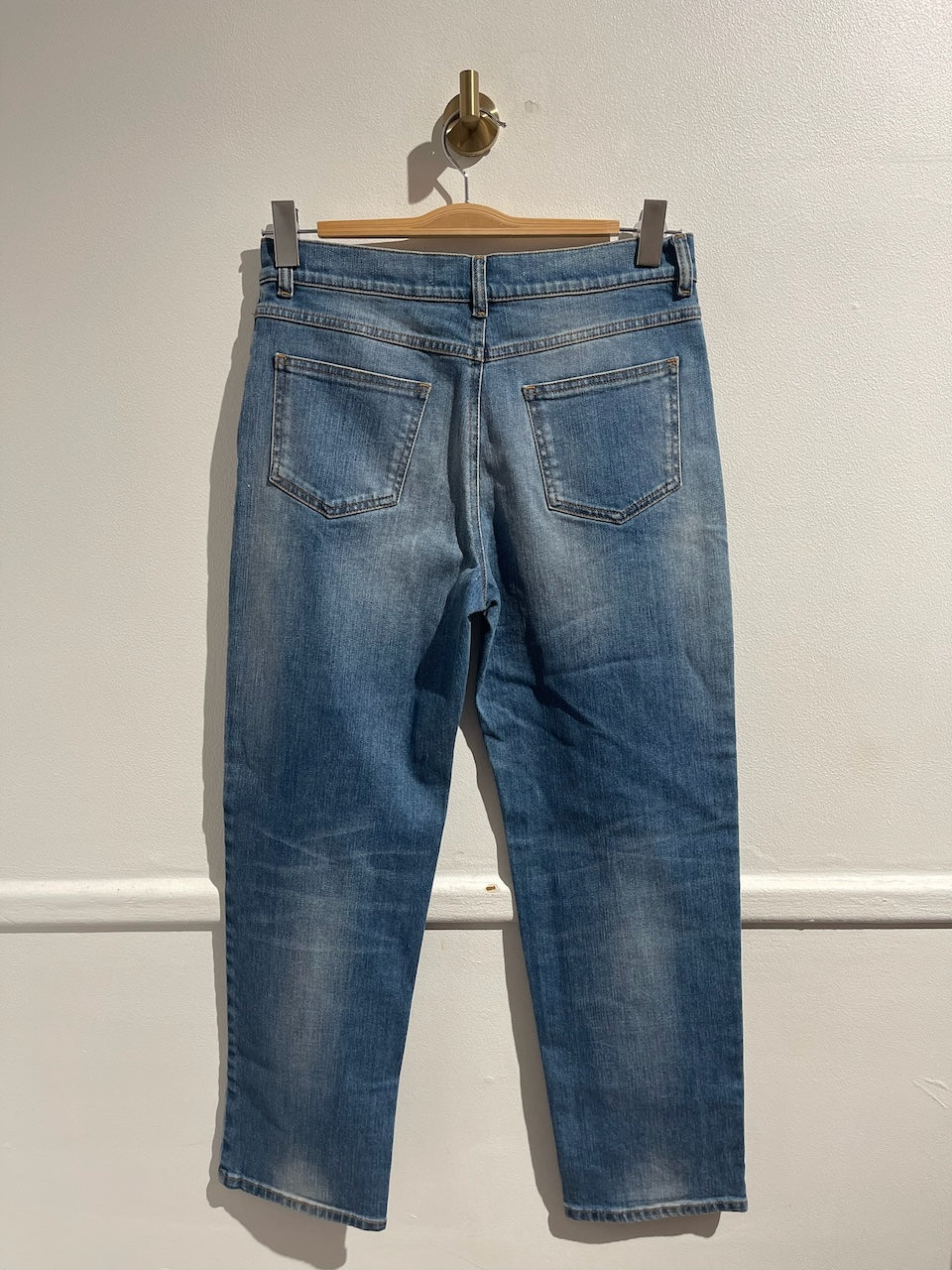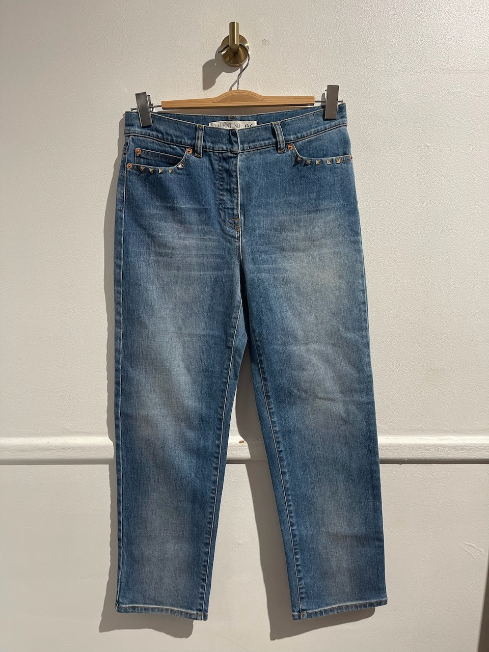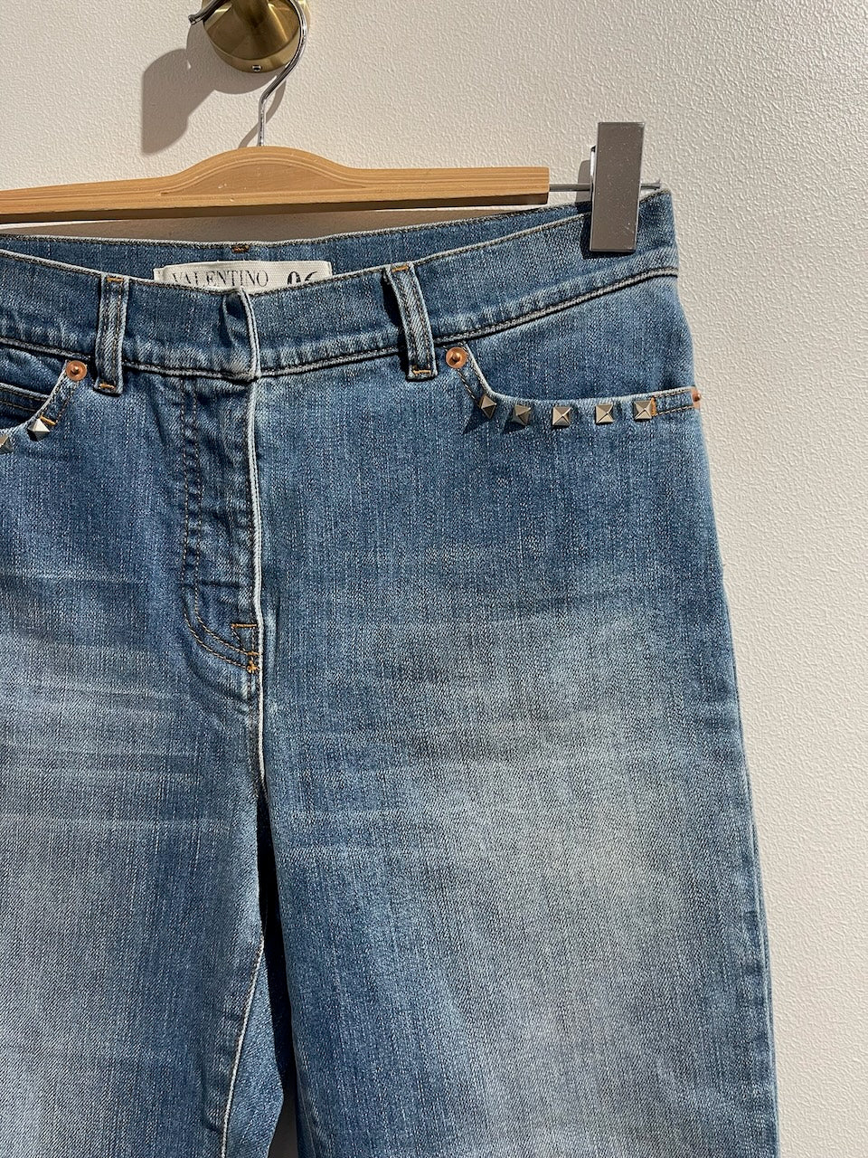 Jeans en coton stretch bleu avec léger délavé et détails de clous aux poches. Coupe droite.
