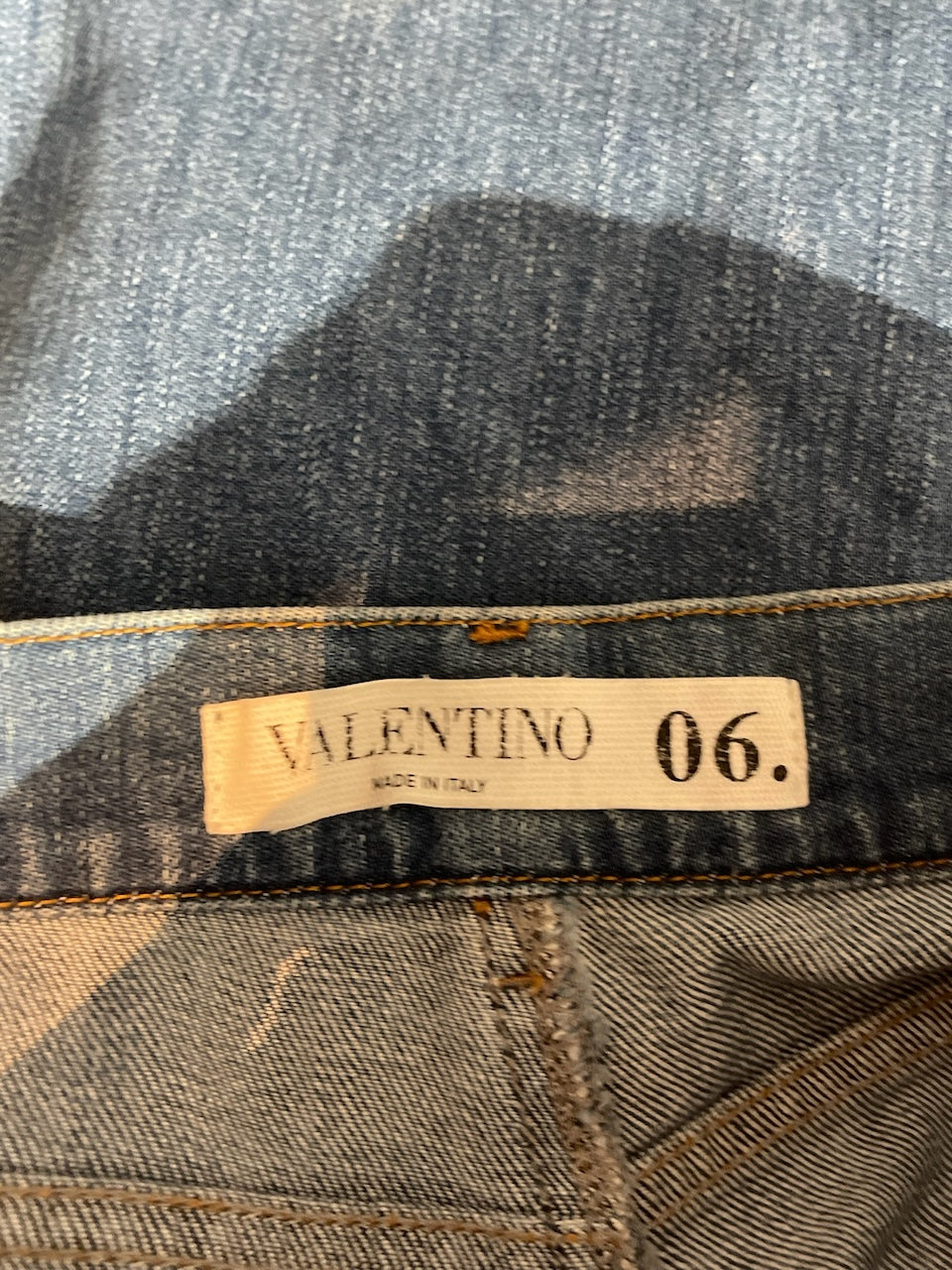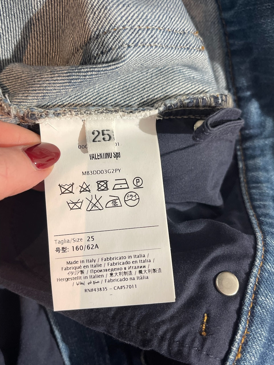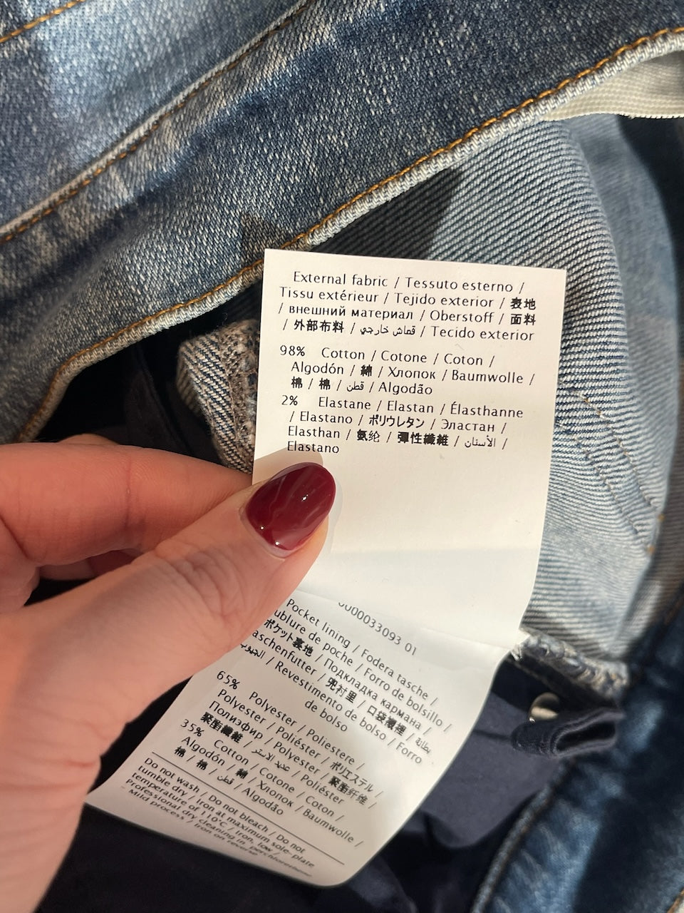 Jeans en coton stretch bleu avec léger délavé et détails de clous aux poches. Coupe droite.
