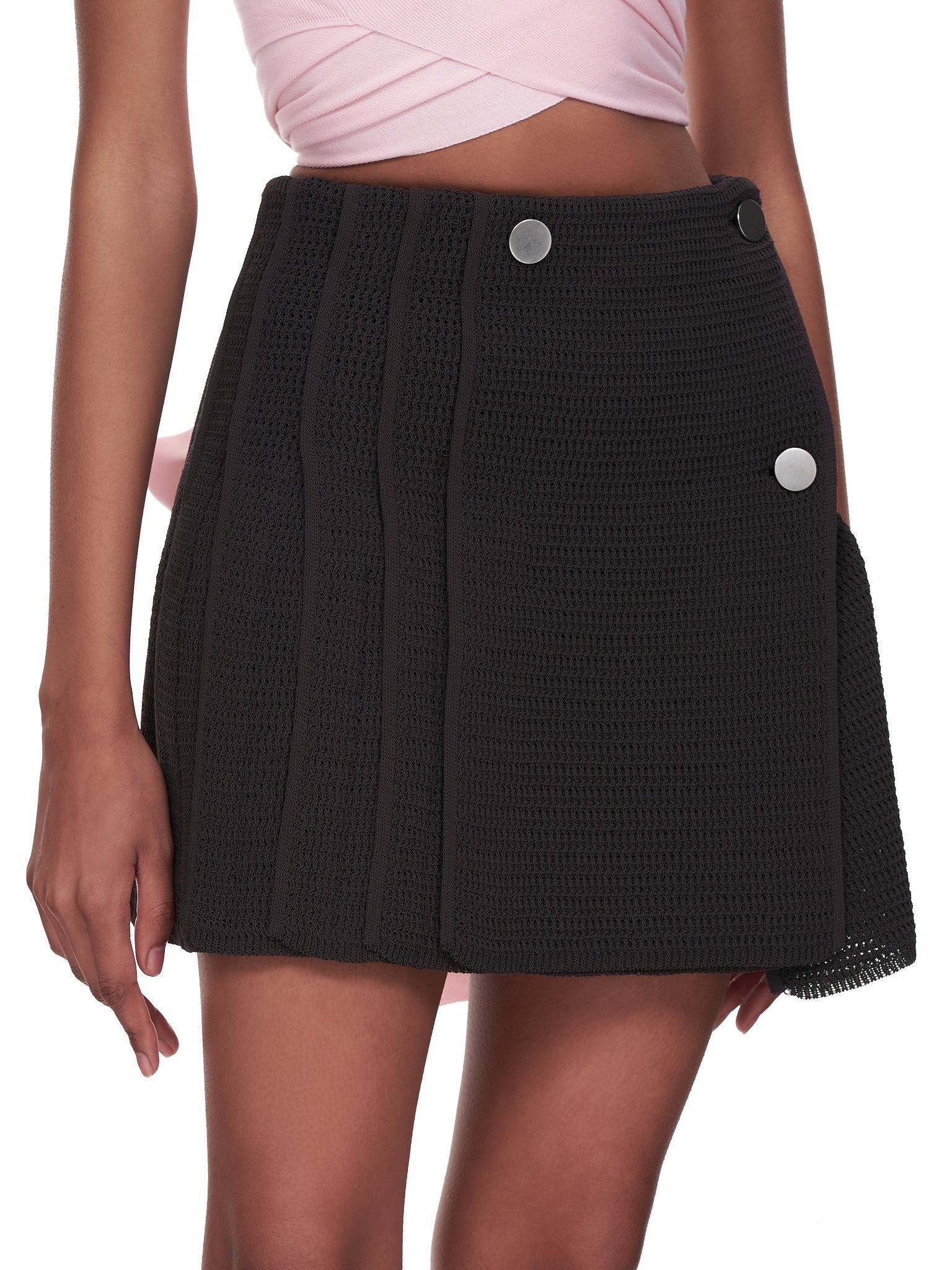 Jupe en maille de coton marron foncé avec détails plissés aux côtés, taille haute et fermeture à bouton asymétrique.