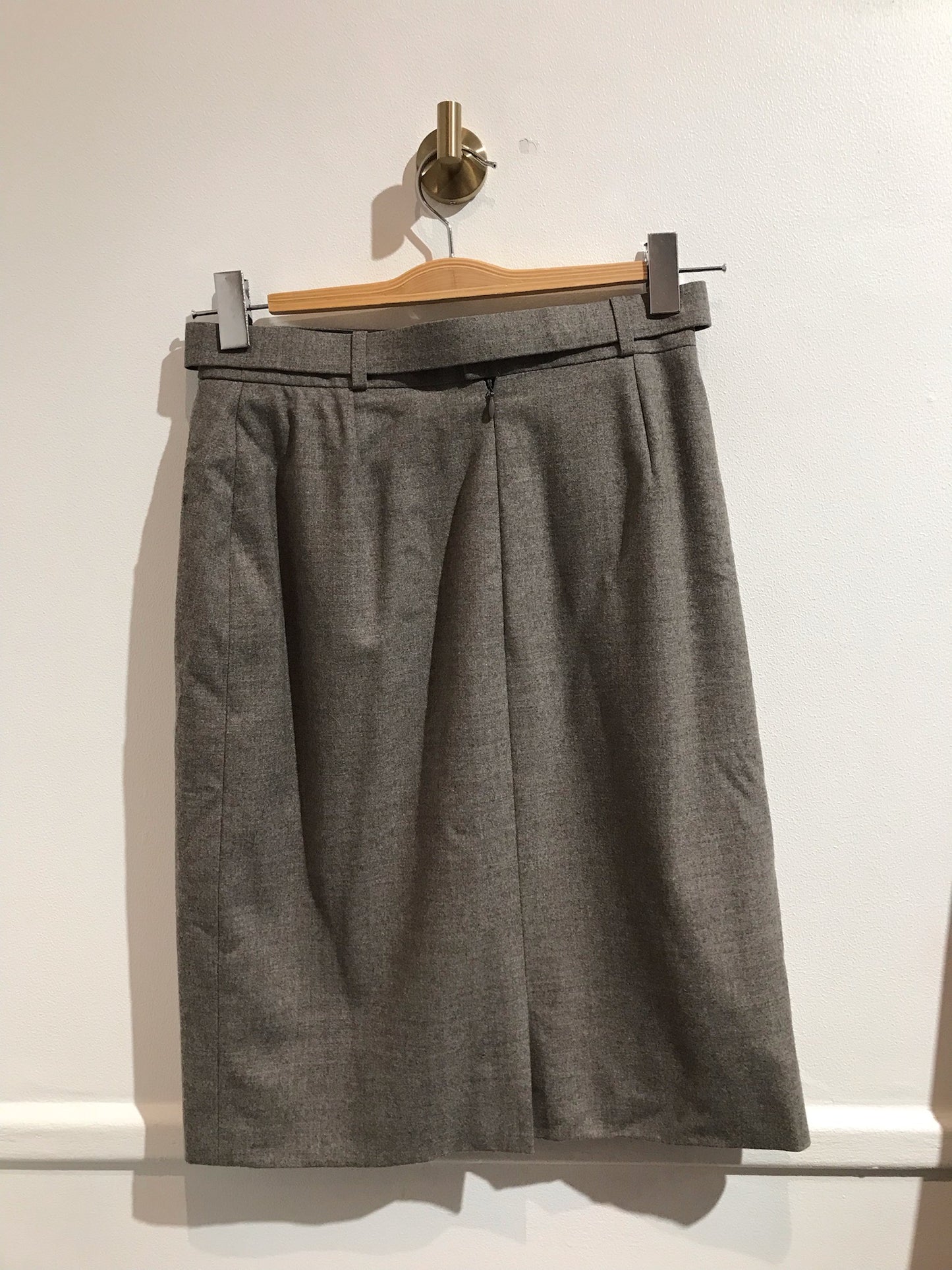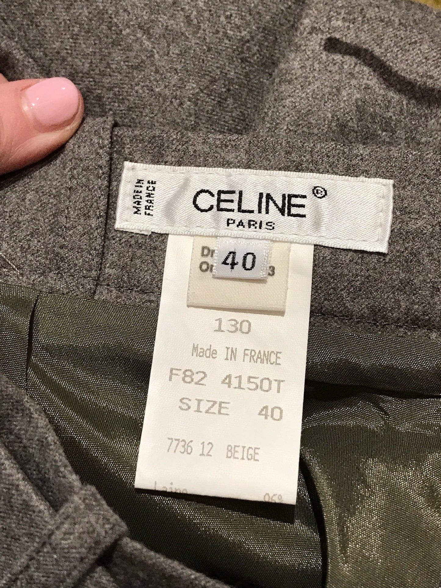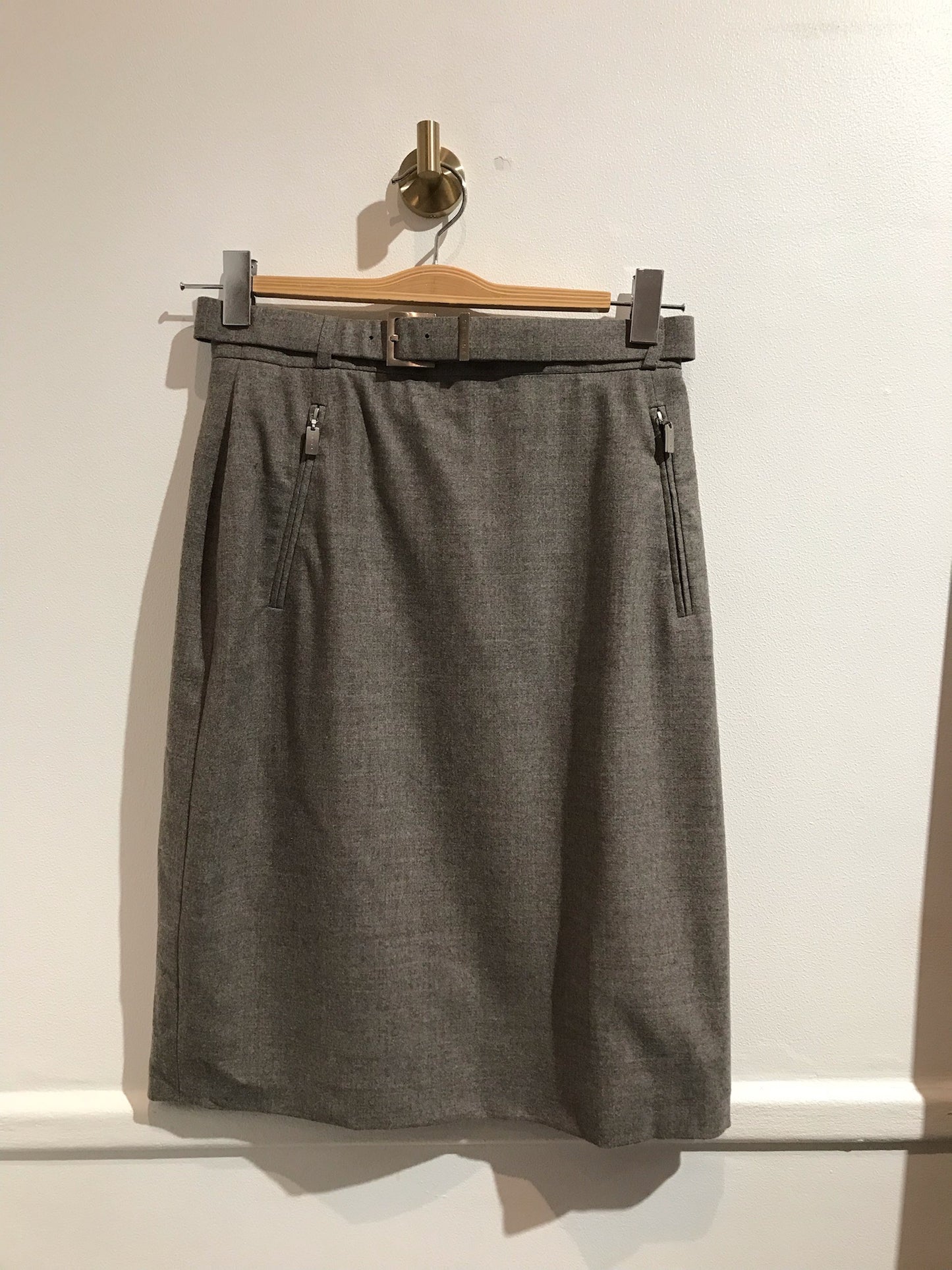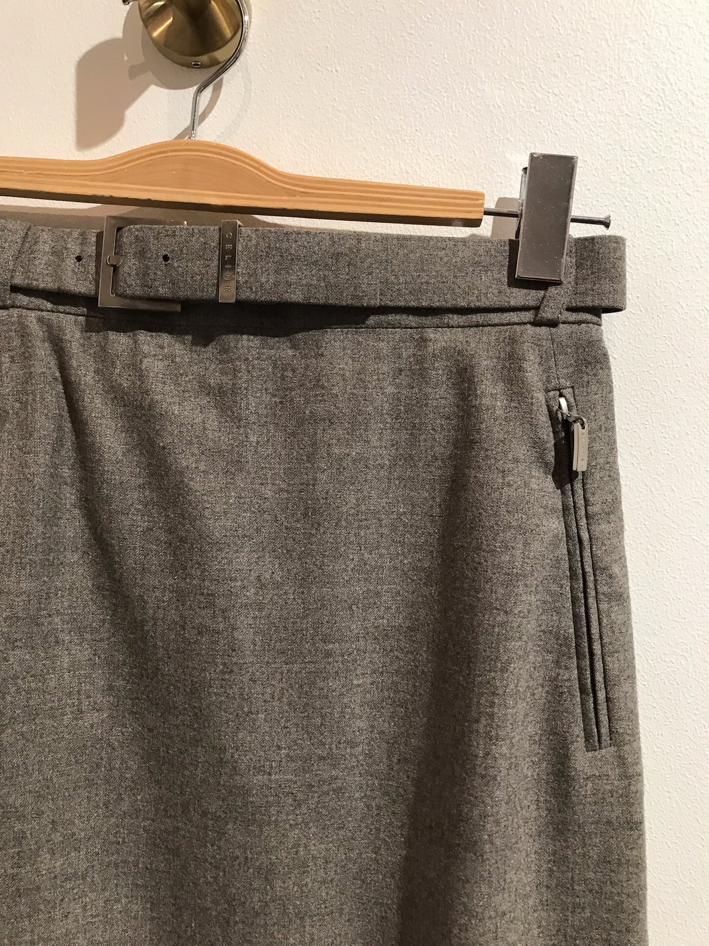 Jupe mi longue en laine grise avec une ceinture ton sur ton signé Céline. Poches latérales à zip sur le devant. Fermeture à zip au dos.Coupe droite.