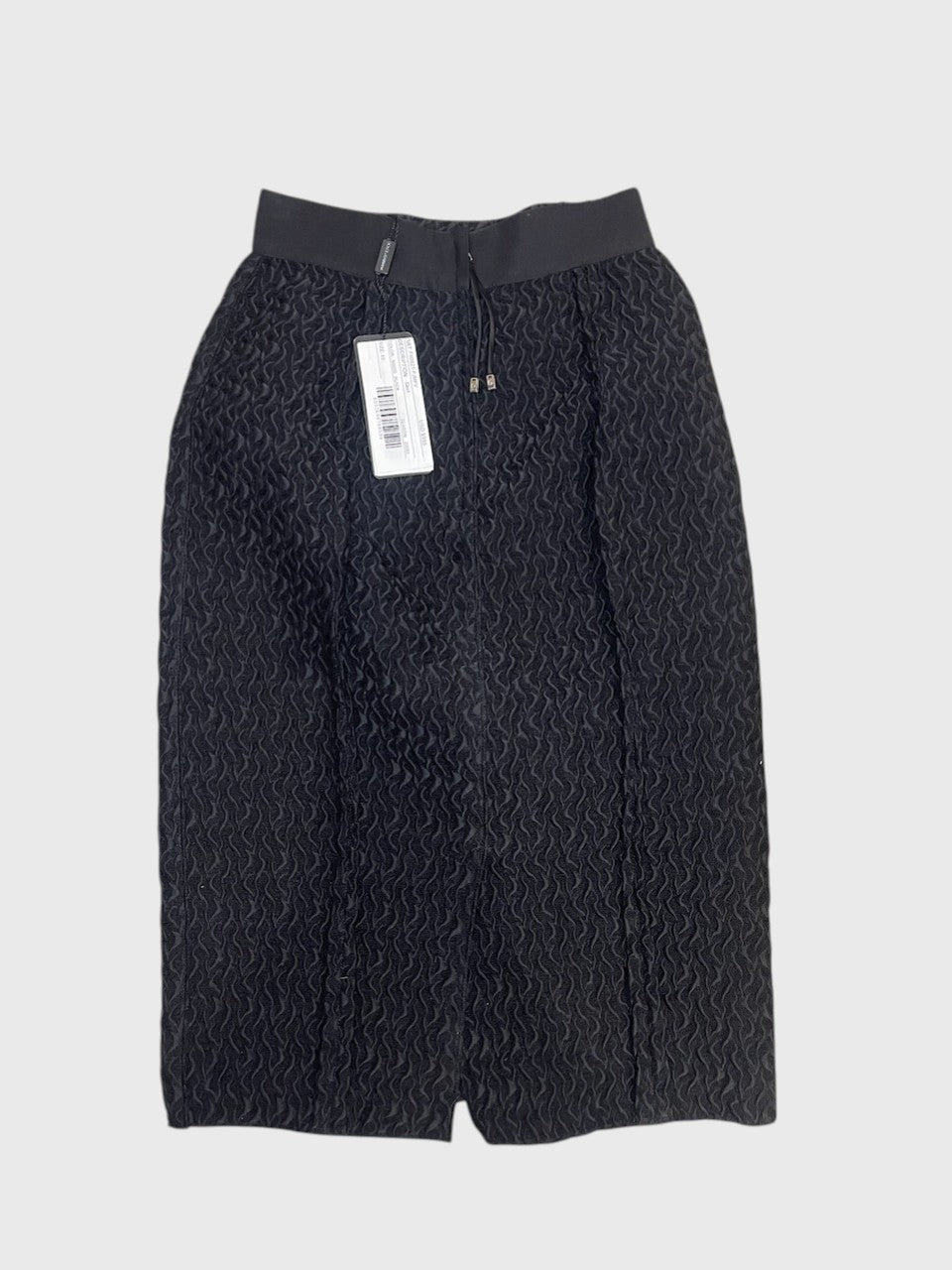 Jupe près du corps en tissu noir texturé. Longueur genou.