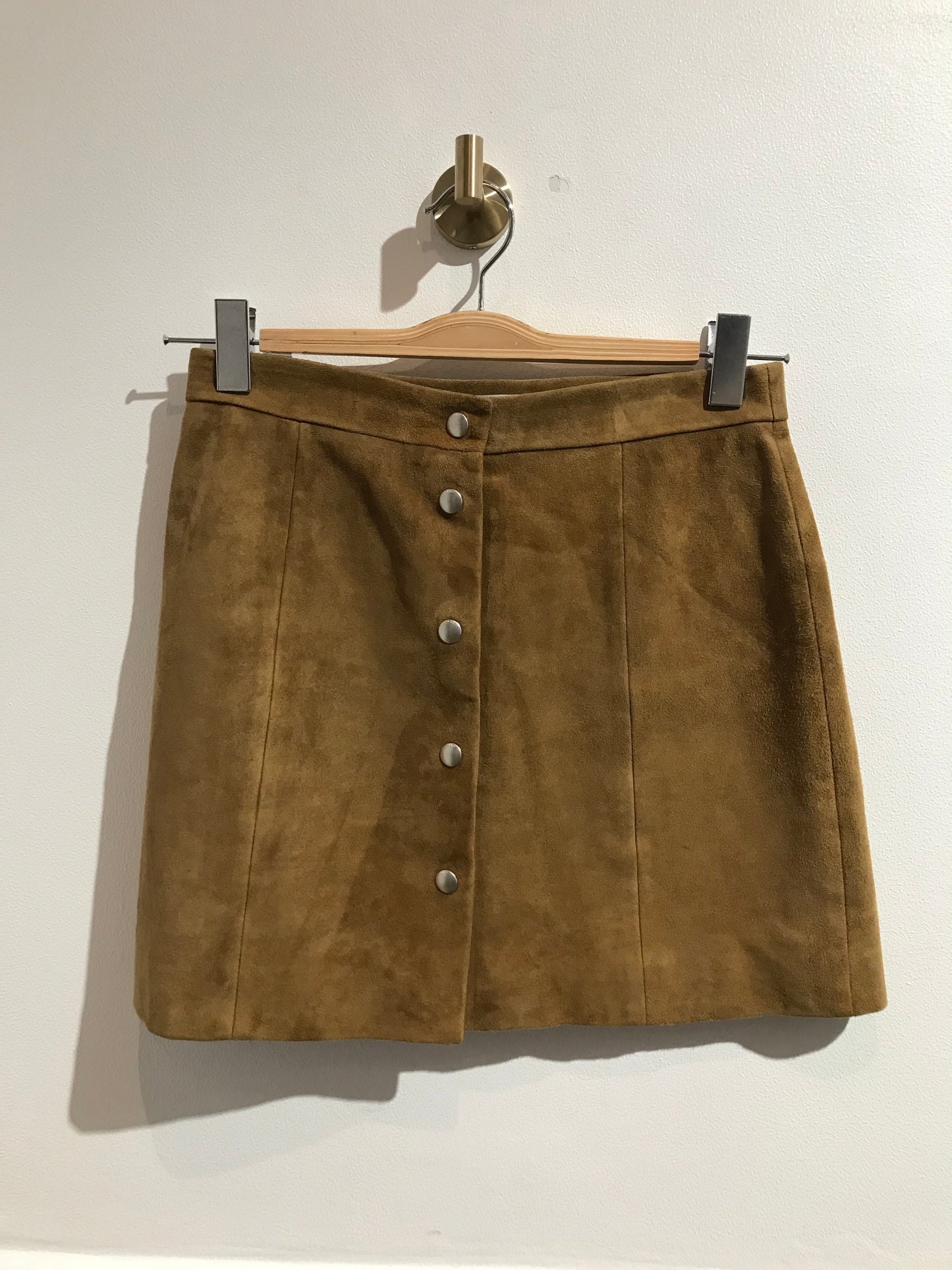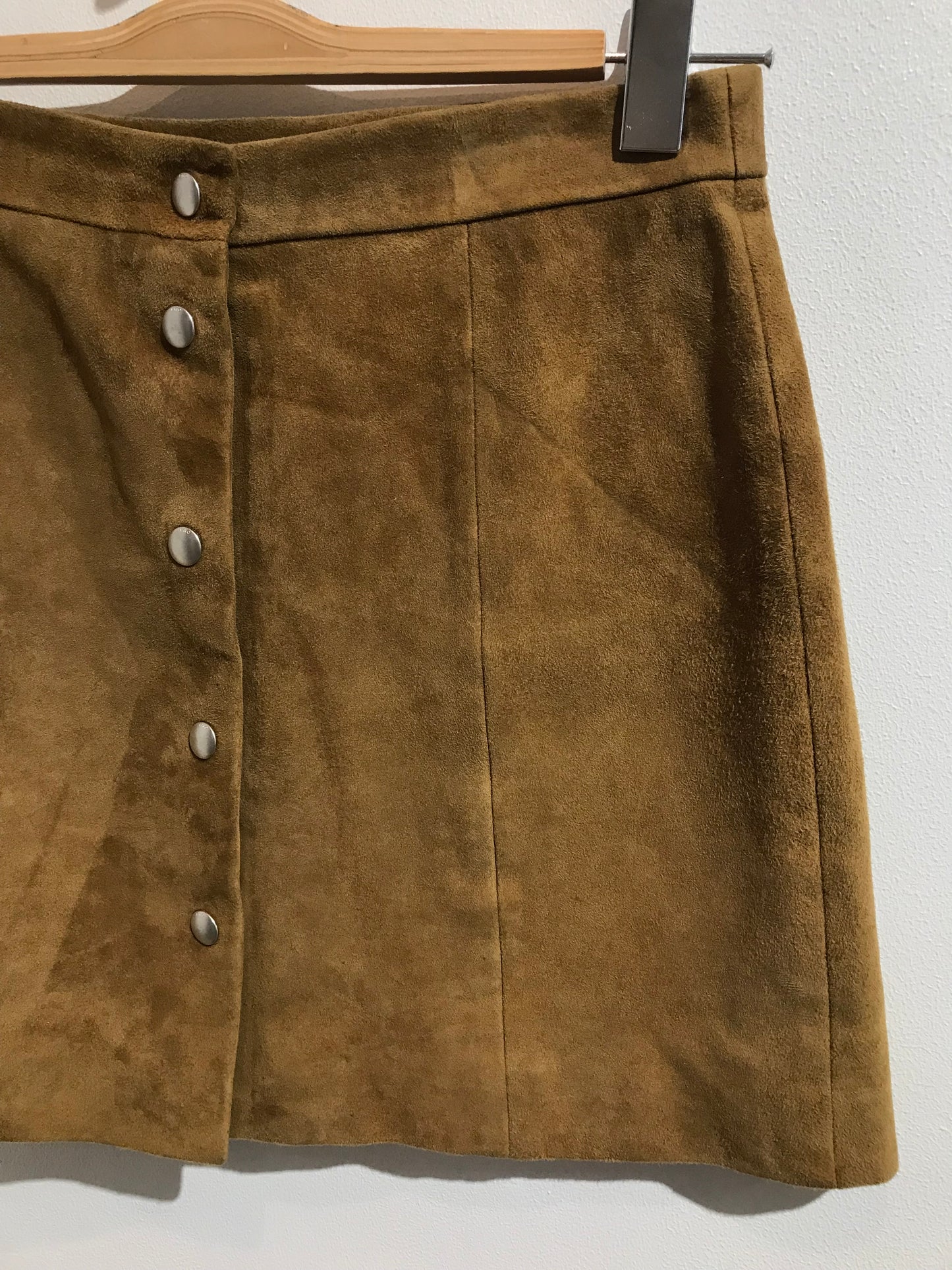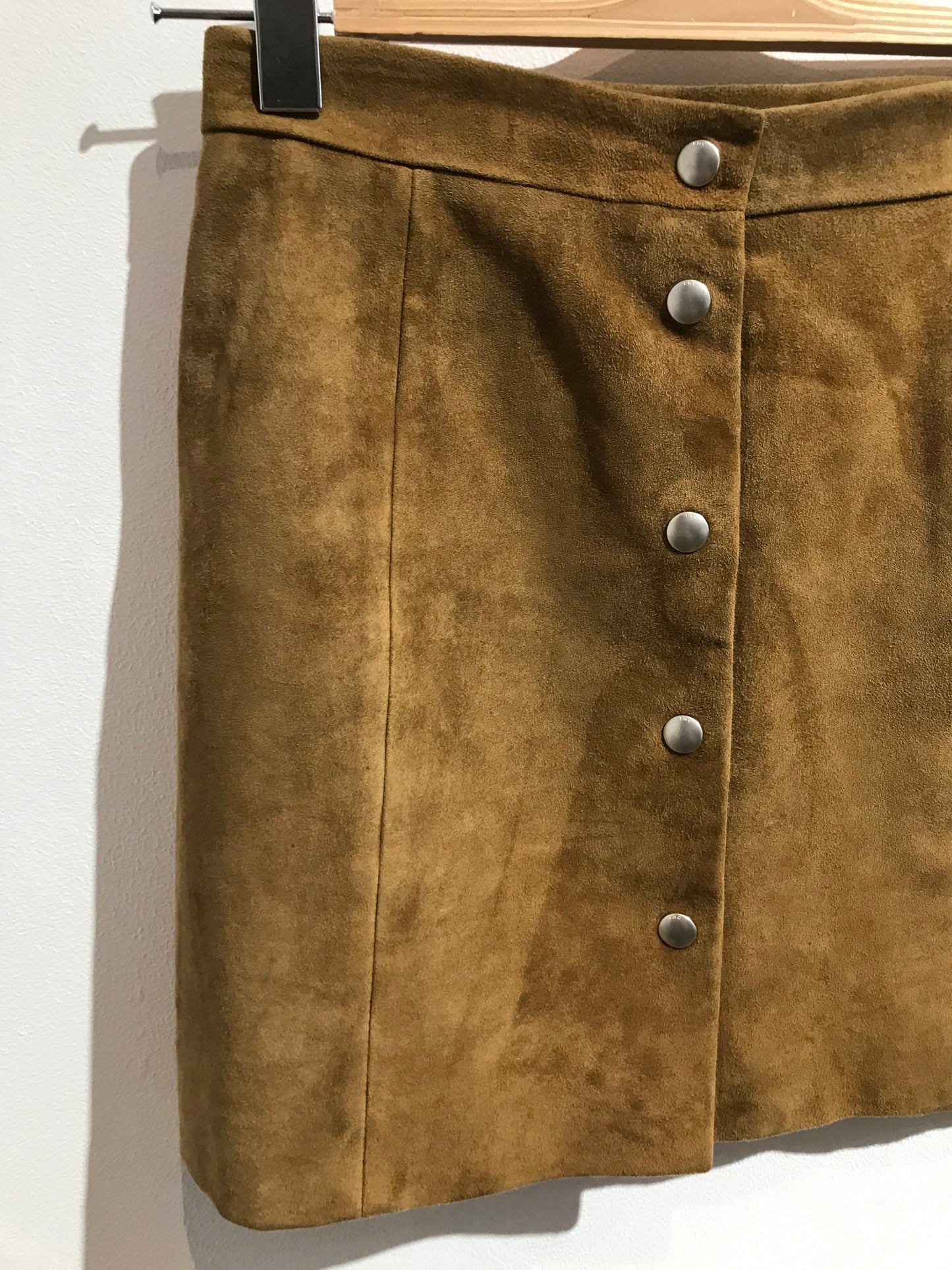 Jupe courte en daim camel avec fermeture par boutons pressions sur l'avant.