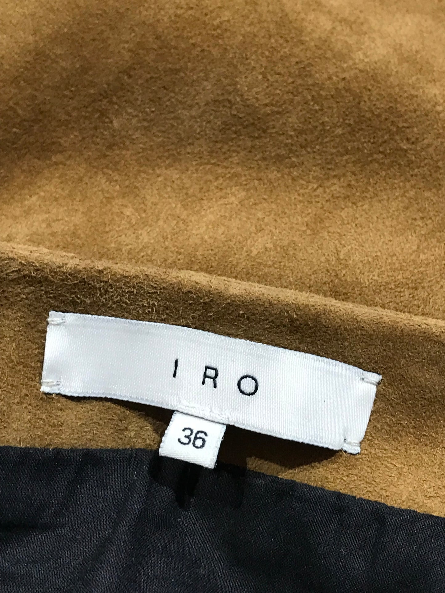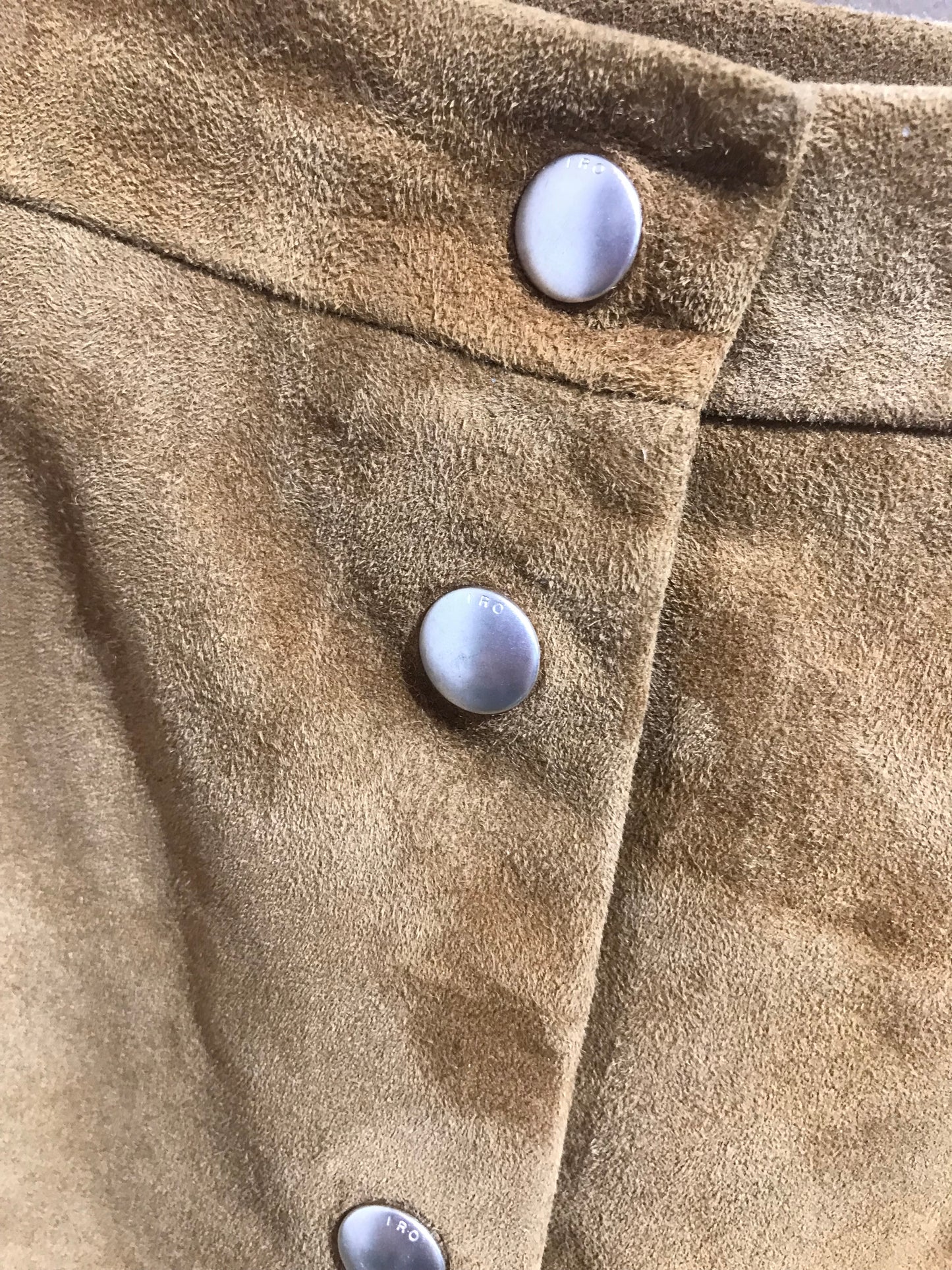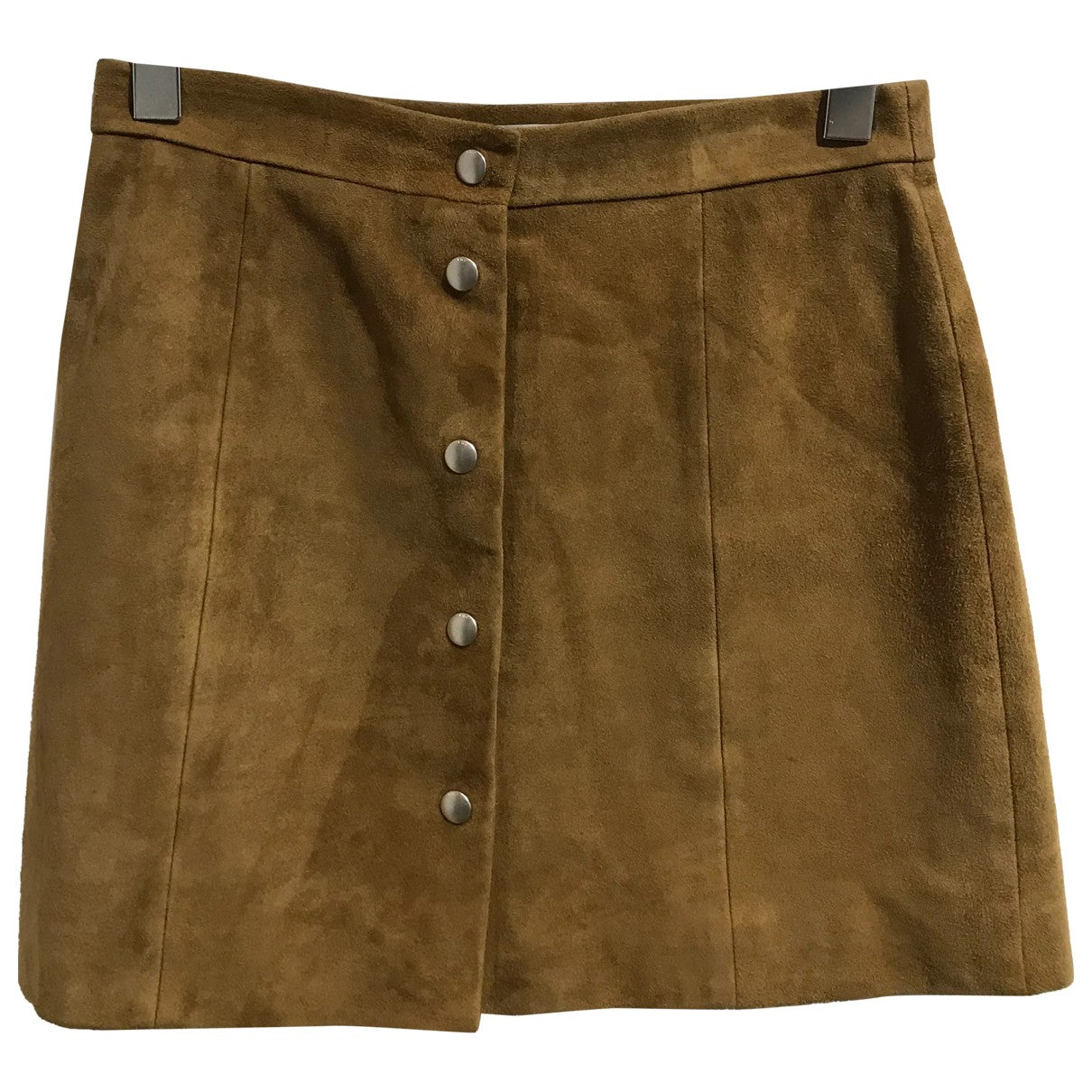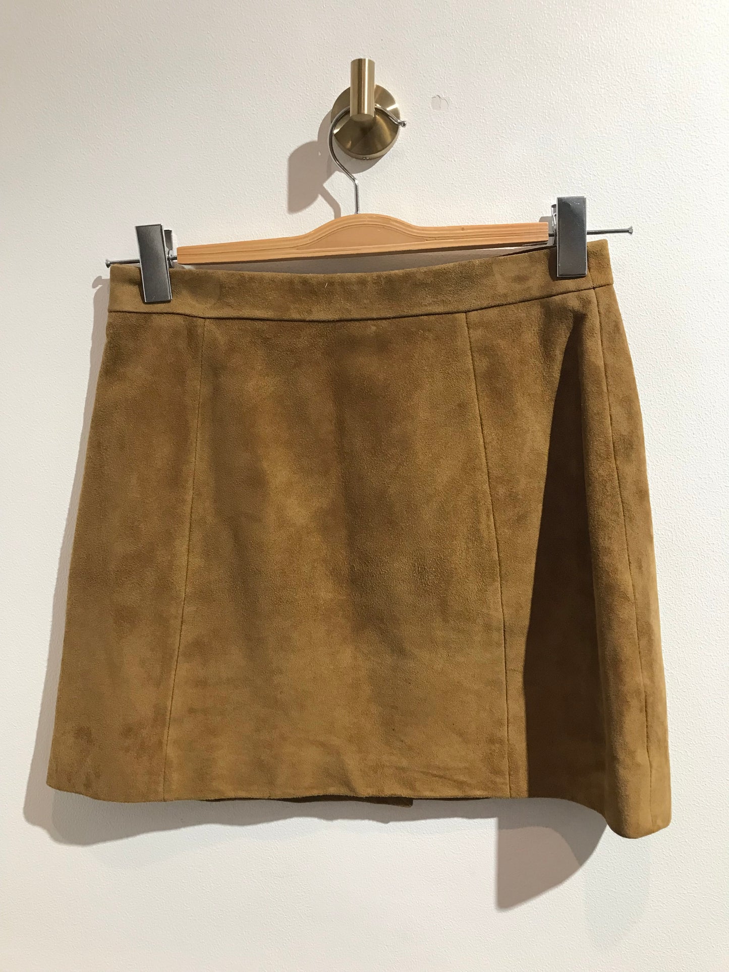 Jupe courte en daim camel avec fermeture par boutons pressions sur l'avant.