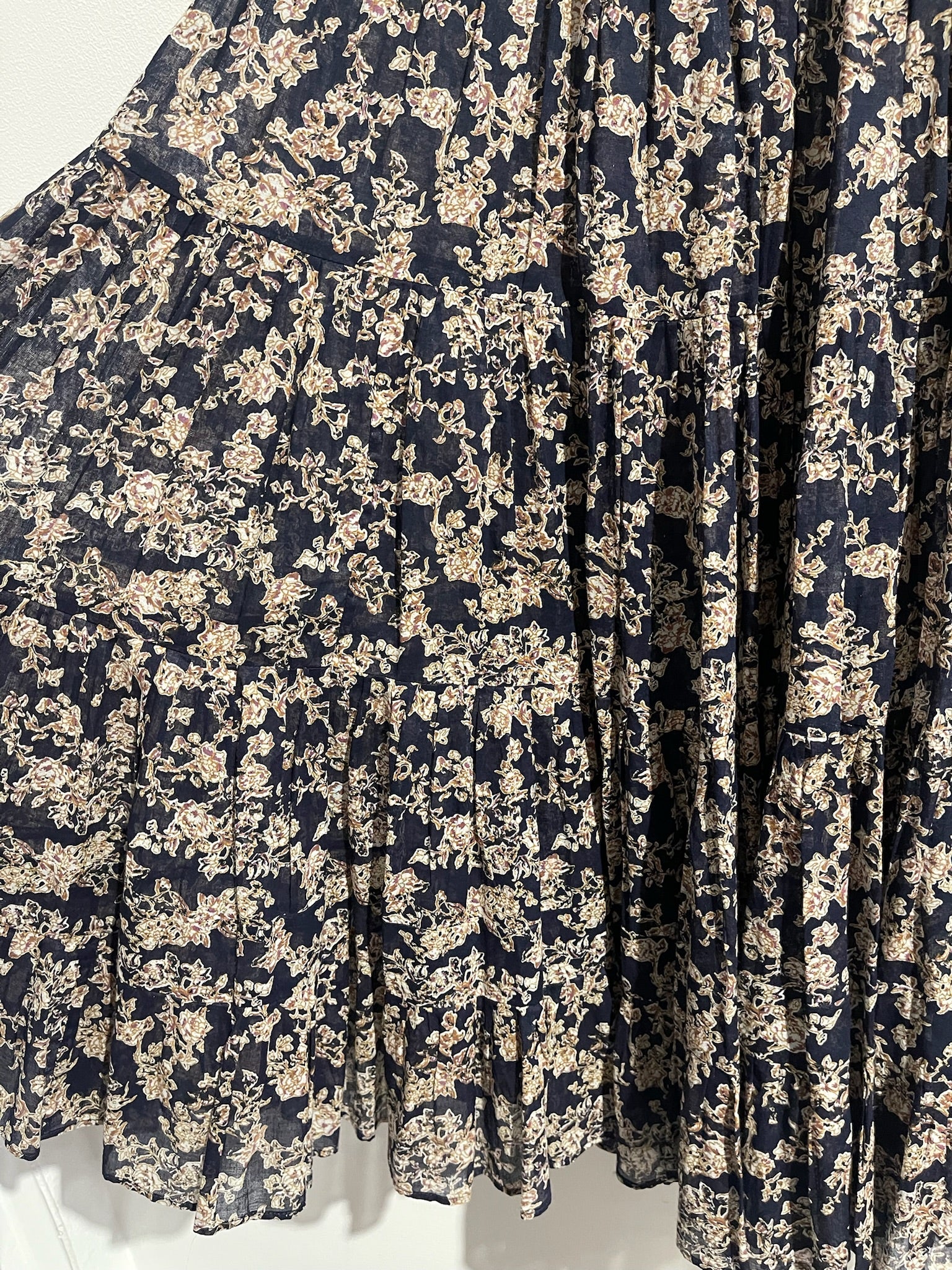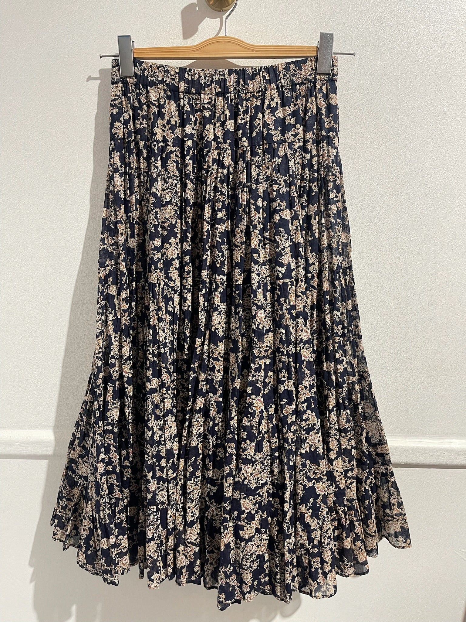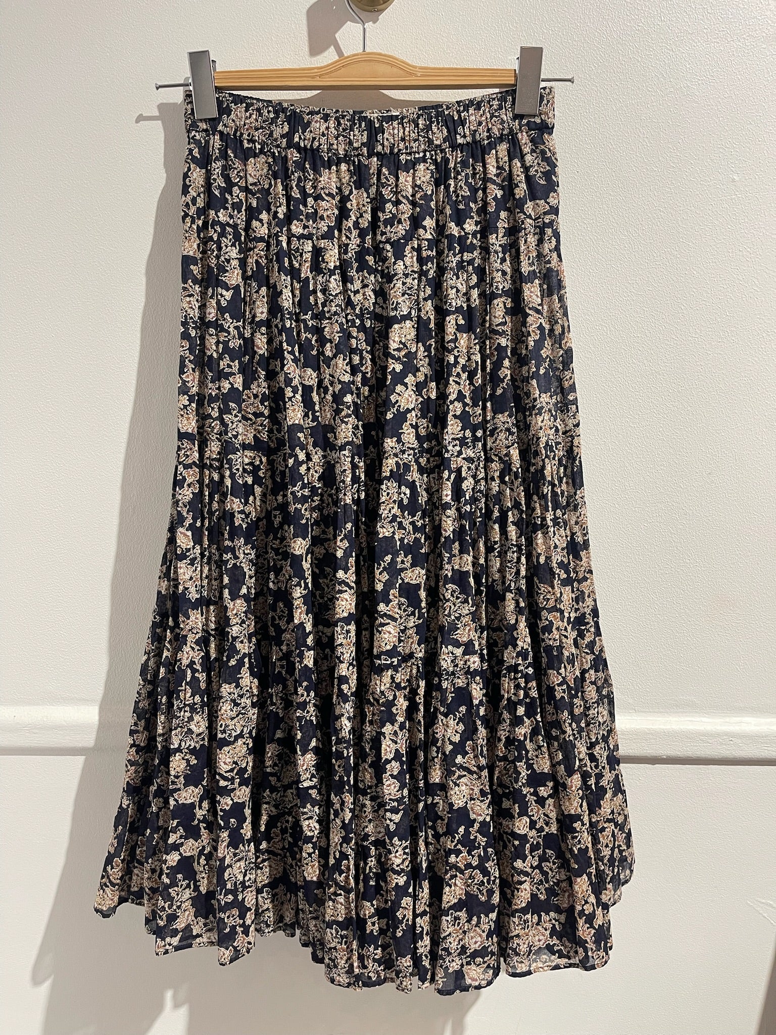Jupe longue plissée en 100% coton imprimée bleu marine et beige. Elastique à la taille.