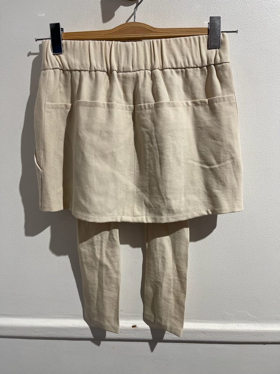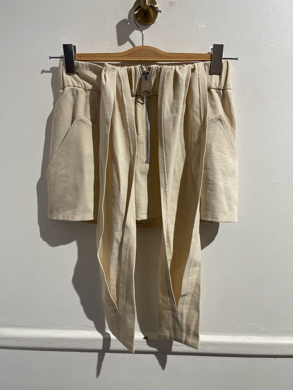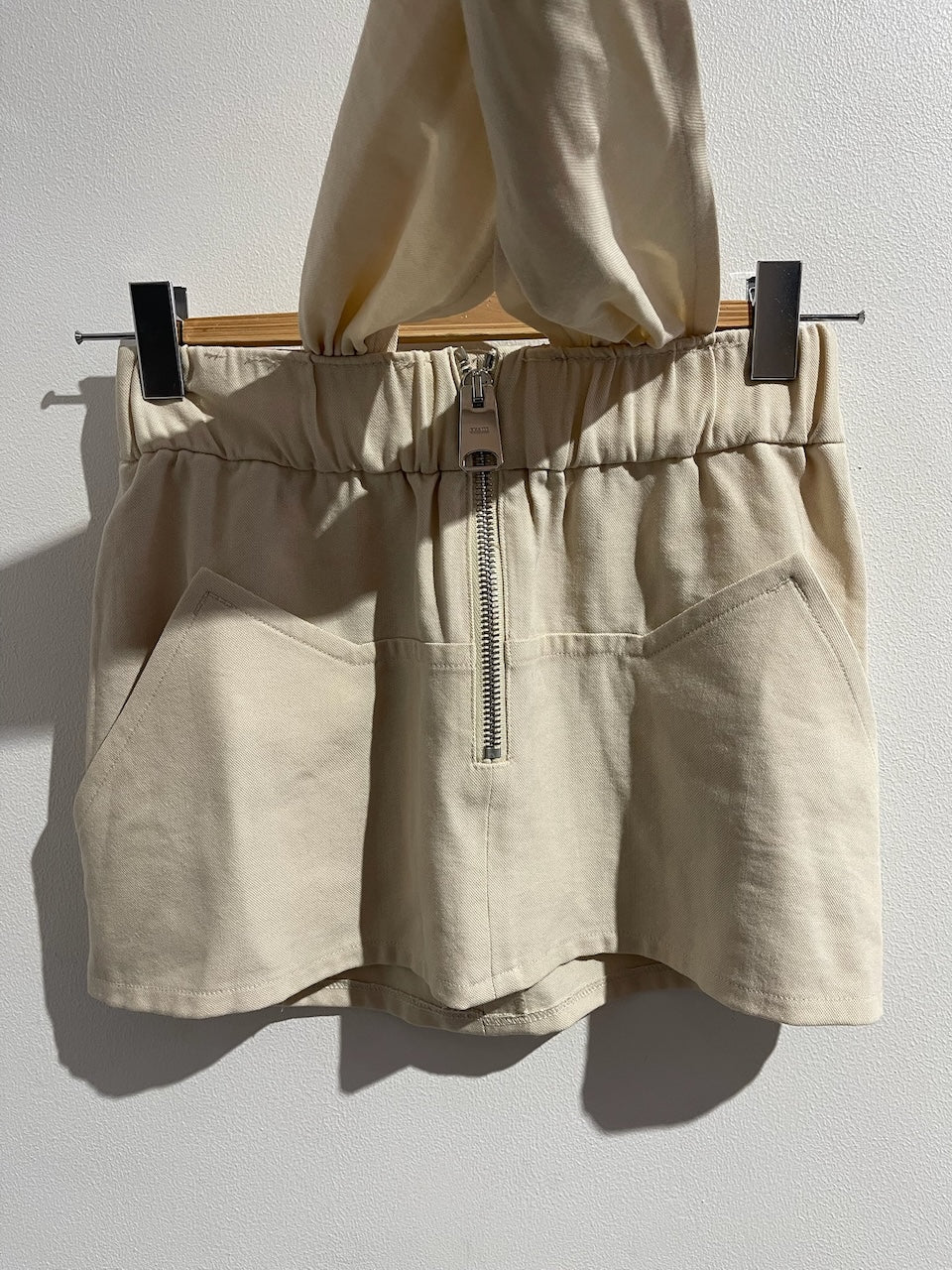 Jupe courte en tissu beige avec taille élastique, fermeture zippée apparante signée Khaite et deux pans à l'avant. Poches latérales.