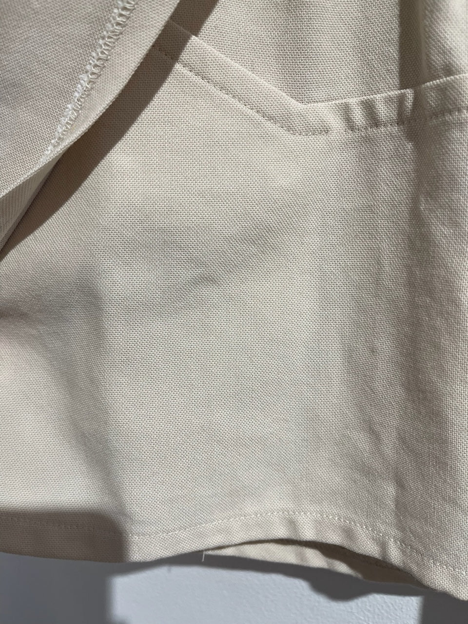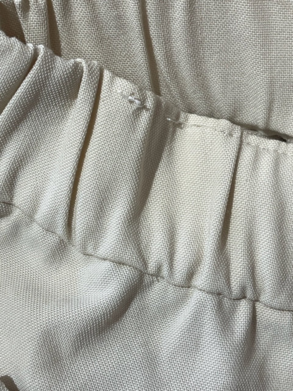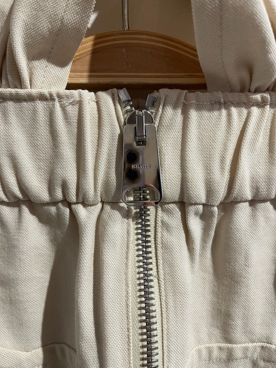 Jupe courte en tissu beige avec taille élastique, fermeture zippée apparante signée Khaite et deux pans à l'avant. Poches latérales.