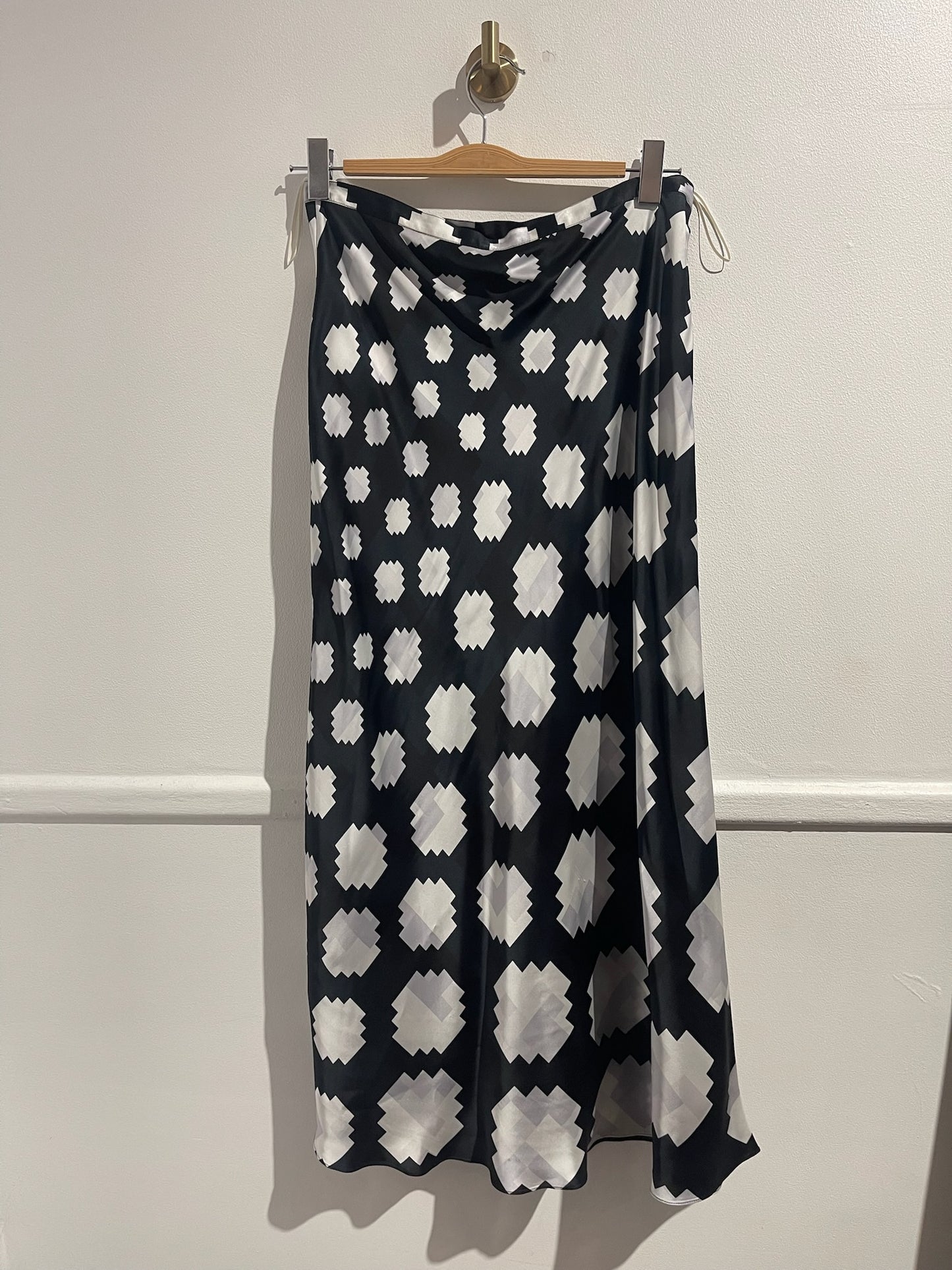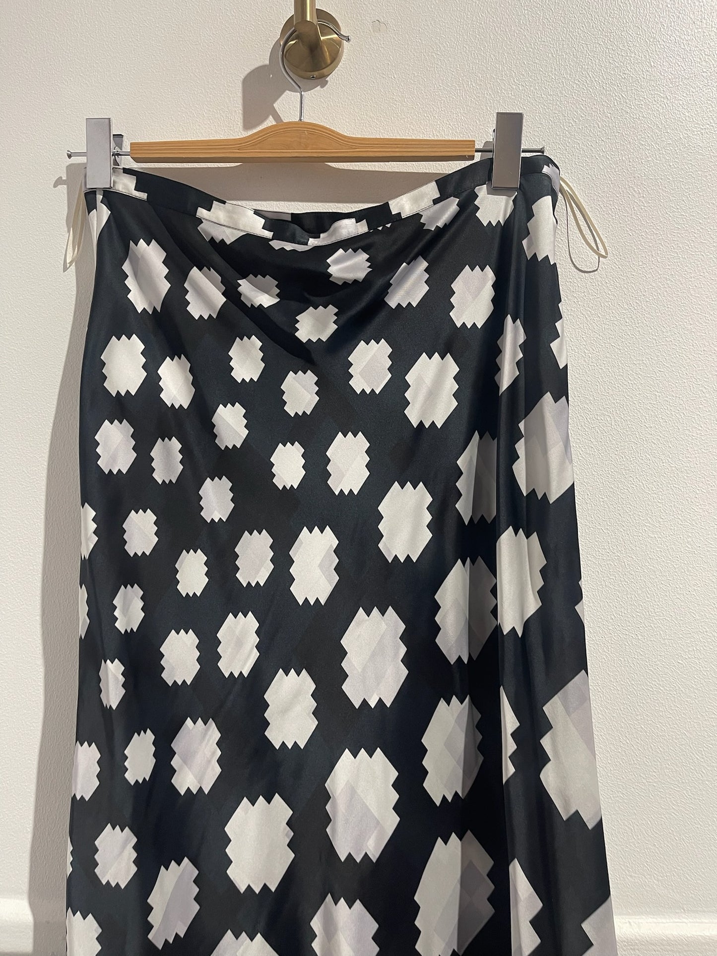 Jupe longue en viscose à motif géométrique bleu nuit, bleu et blanc. Jupe fluide. Fermeture zippée sur le côté.