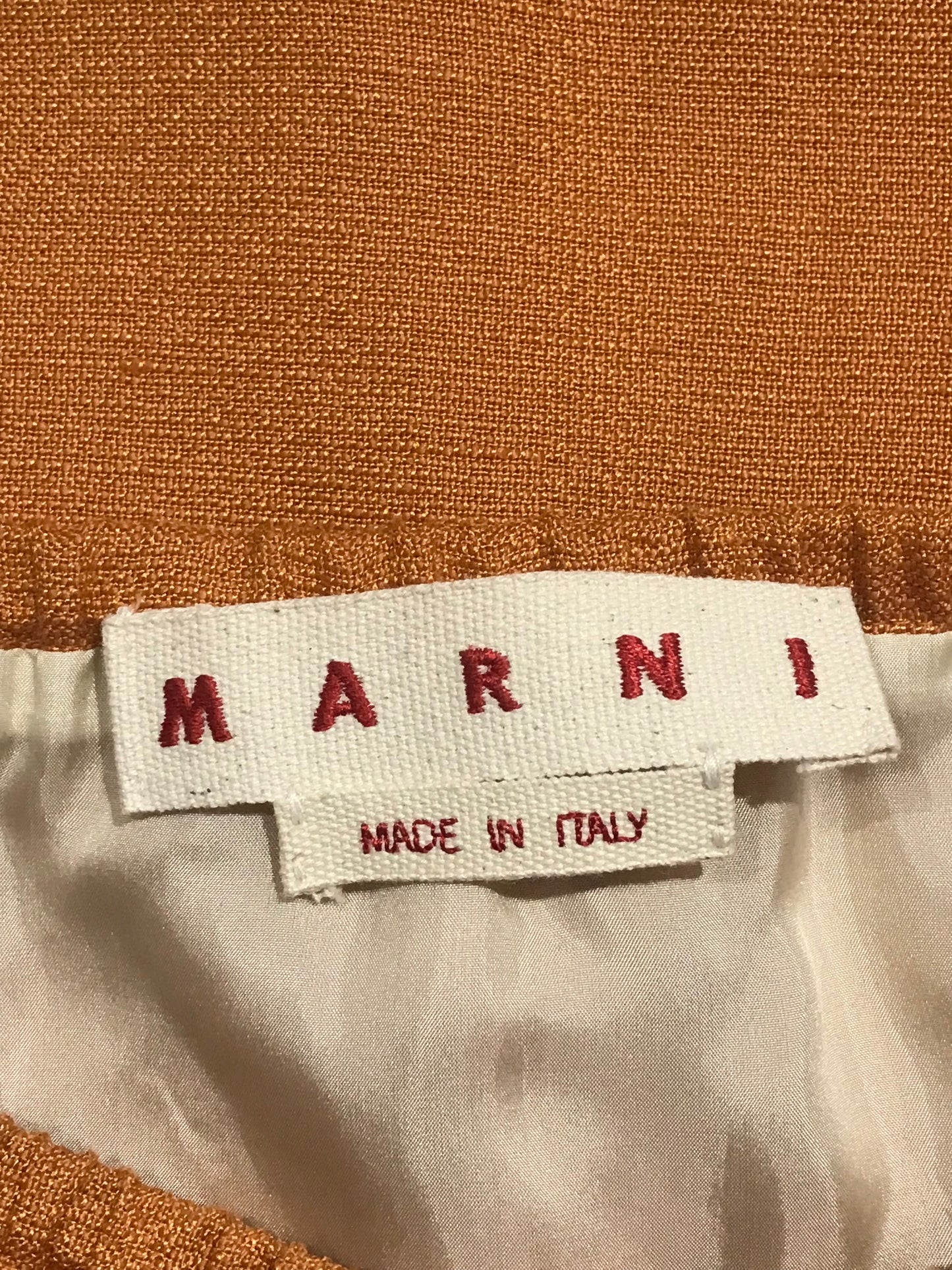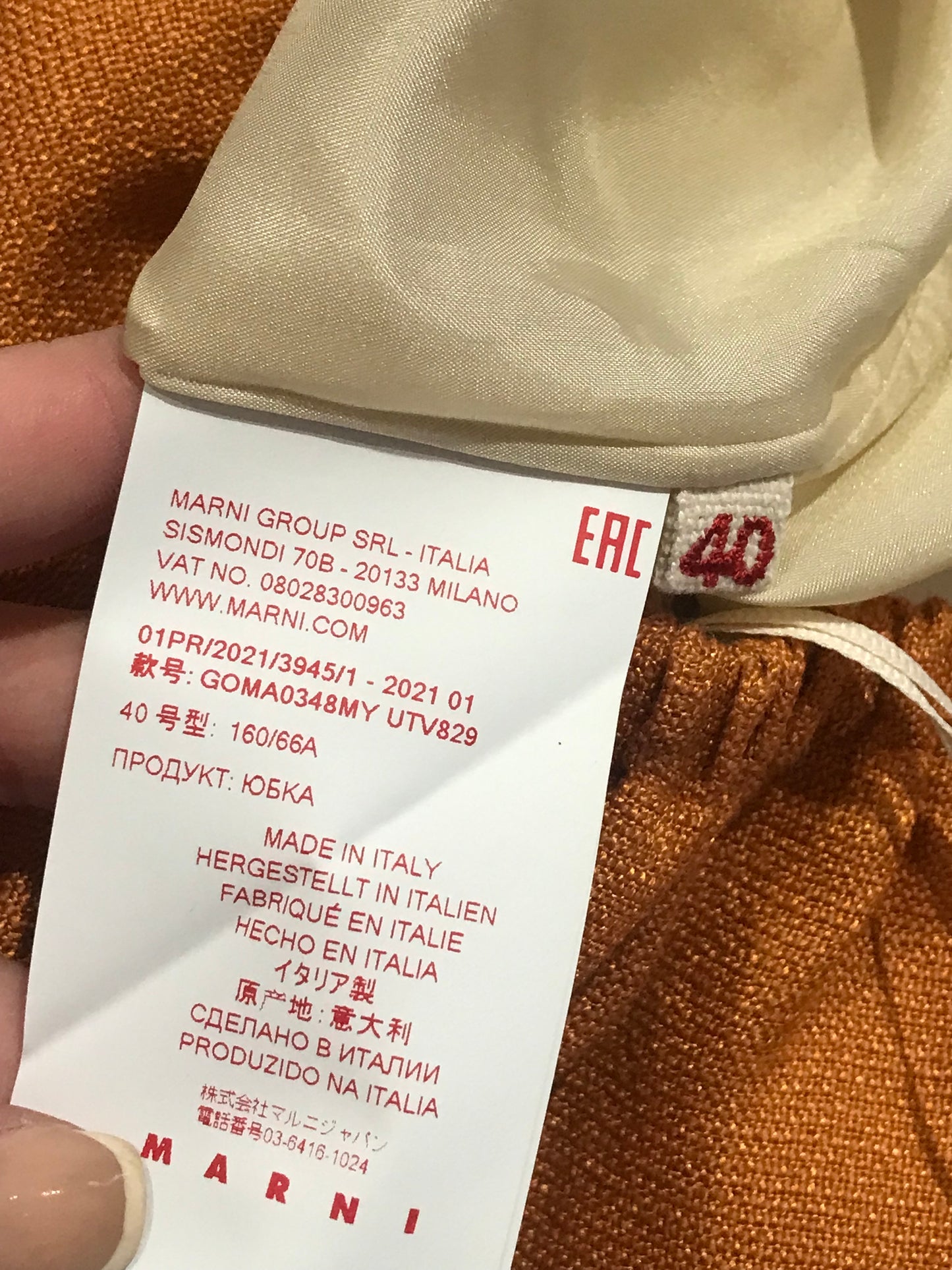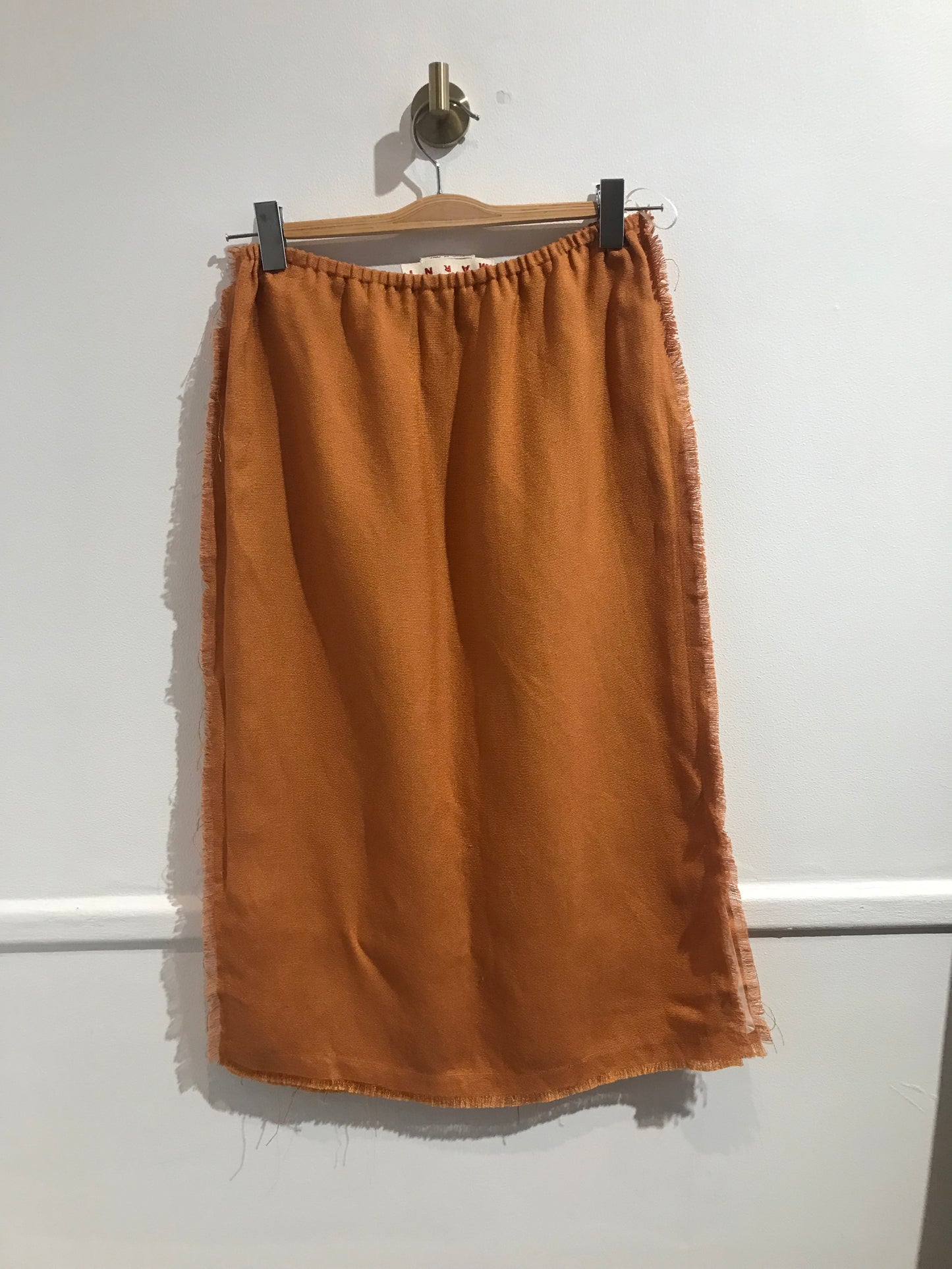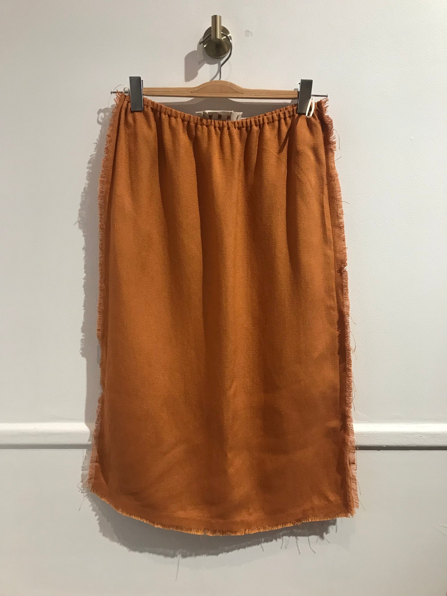 Jupe mi-longue en viscose ocre avec taille élastique et détails frangés. Ourlets frangés.