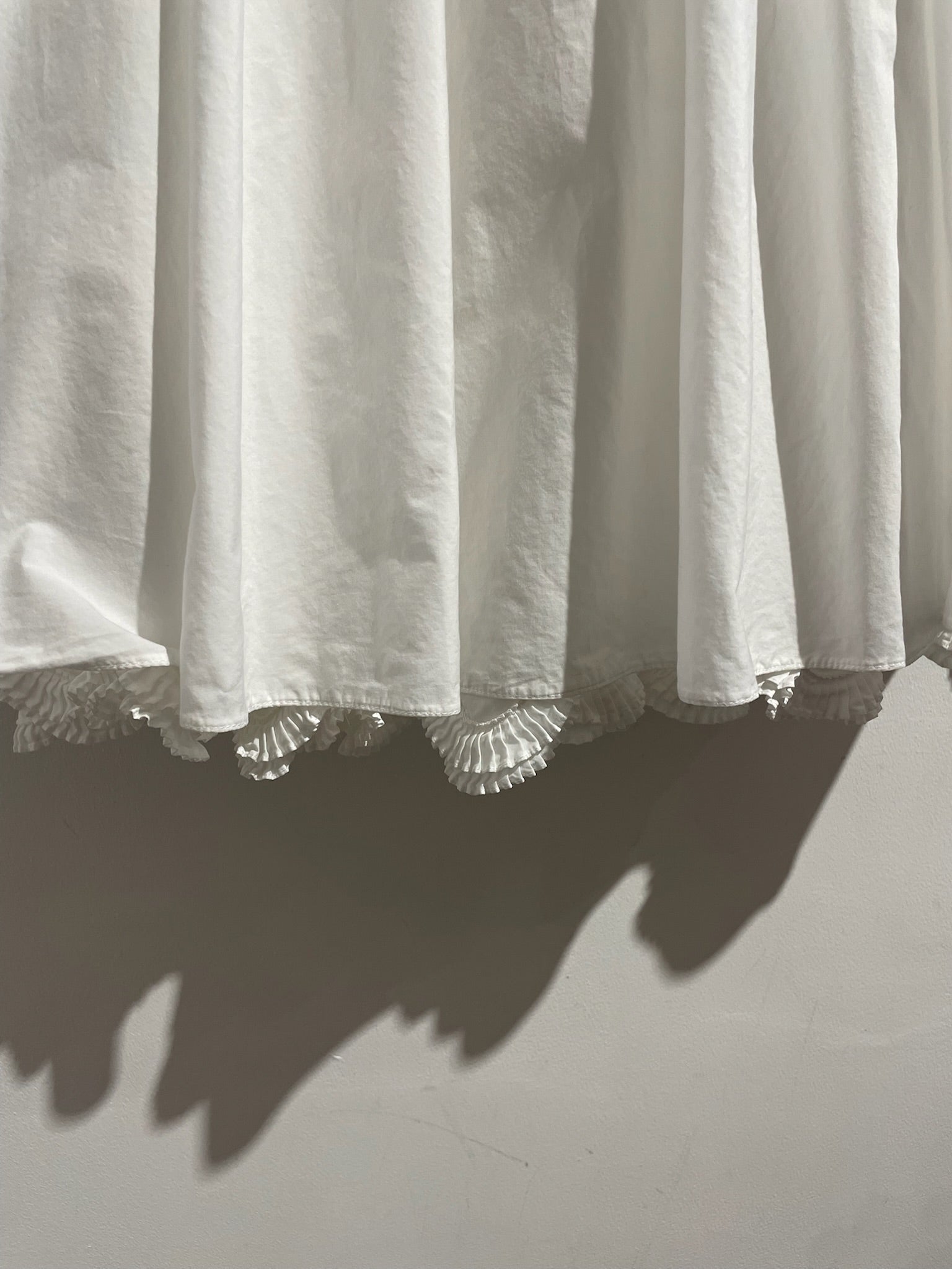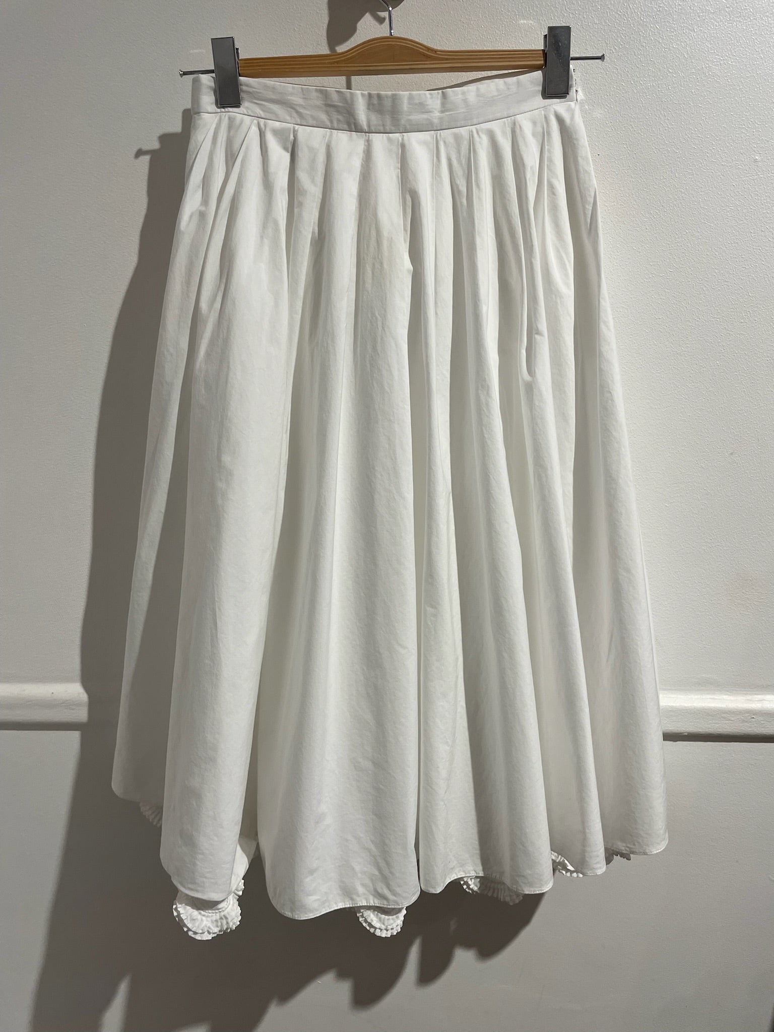 Jupe mi-longue drapée blanche 100% coton. Détail dentelle sur le bas de la doublure. Fermeture zip sur le coté.