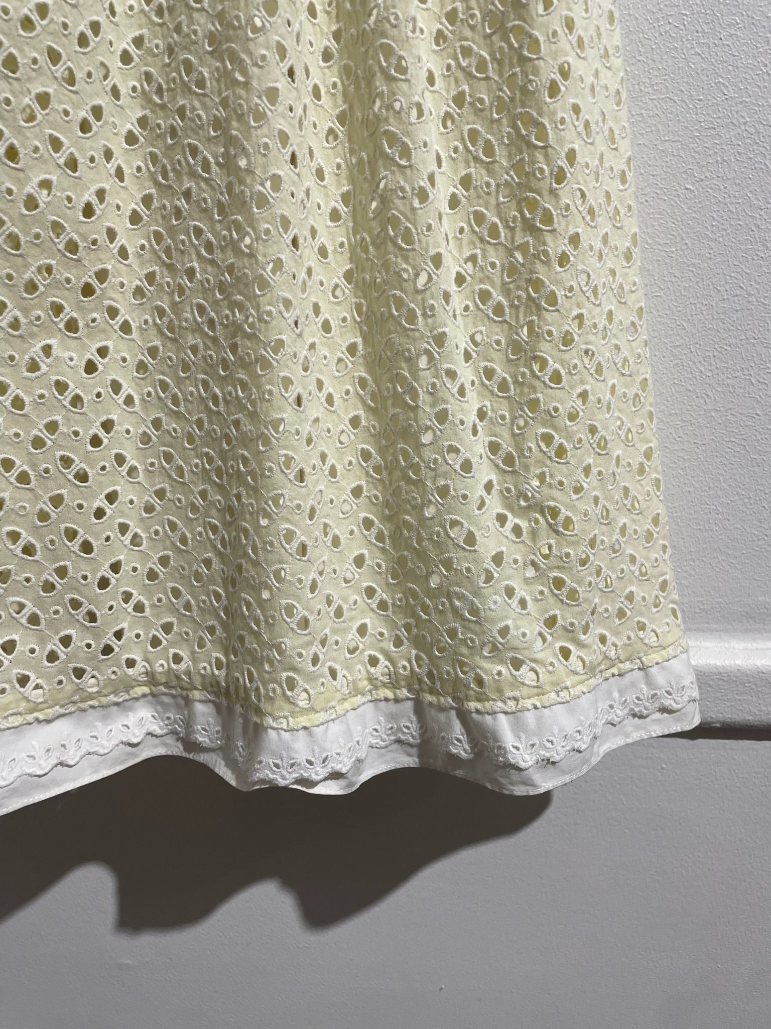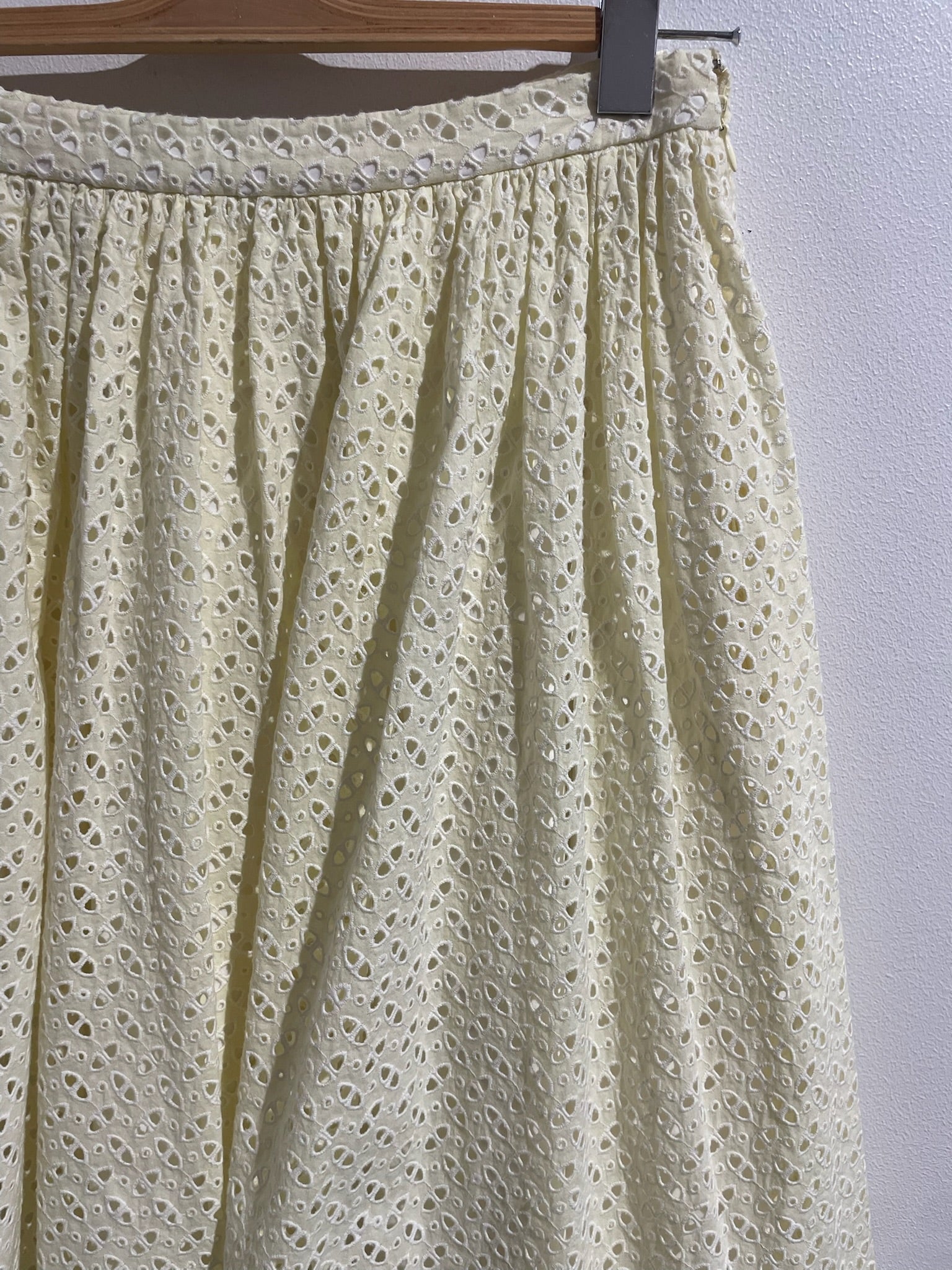 Jupe mi-longue drapée en coton broderie anglaise jaune.. Doublure blanche. Fermeture zip sur le coté.