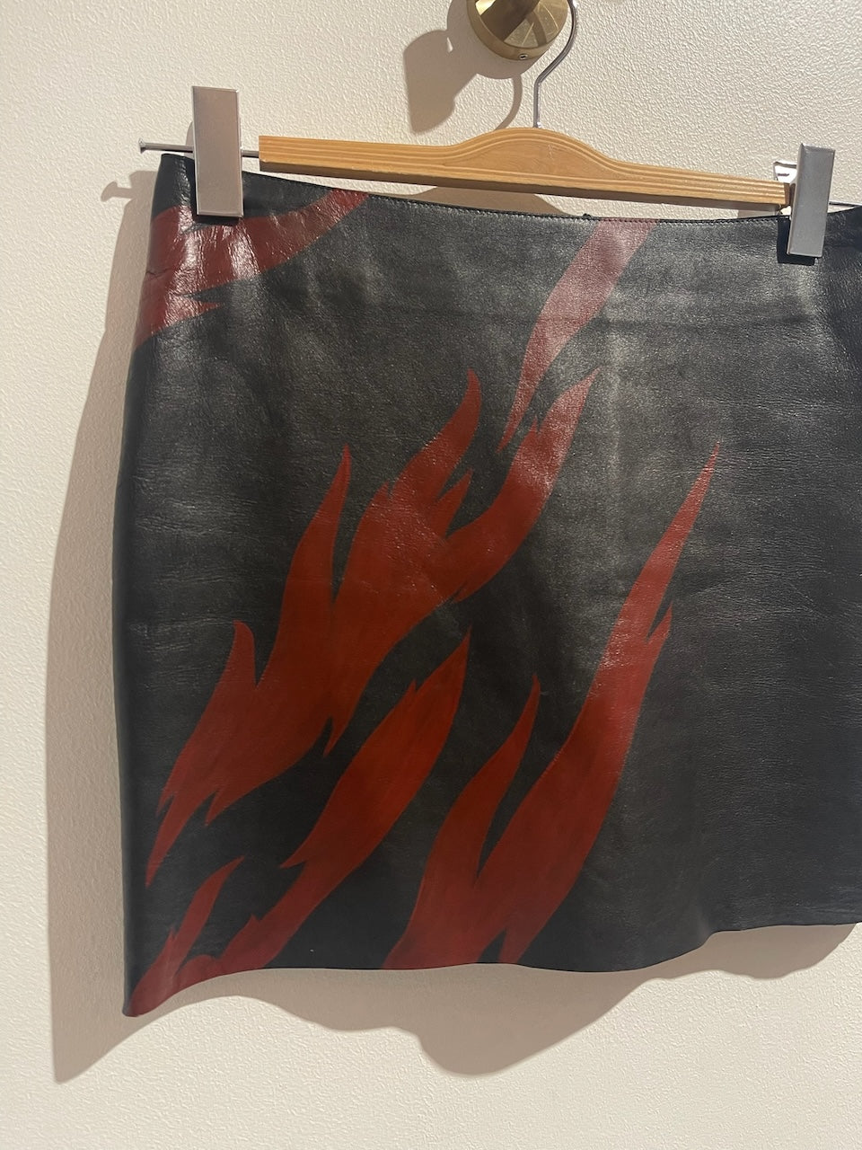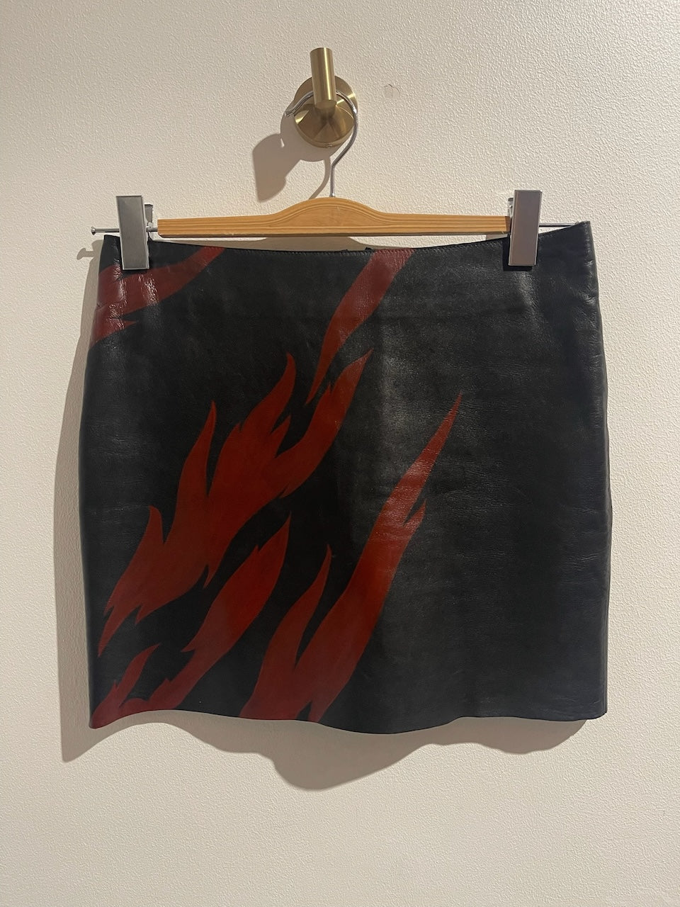 Jupe courte en cuir noir avec motif éclair rouge. Fermeture zippée à l'arrière.