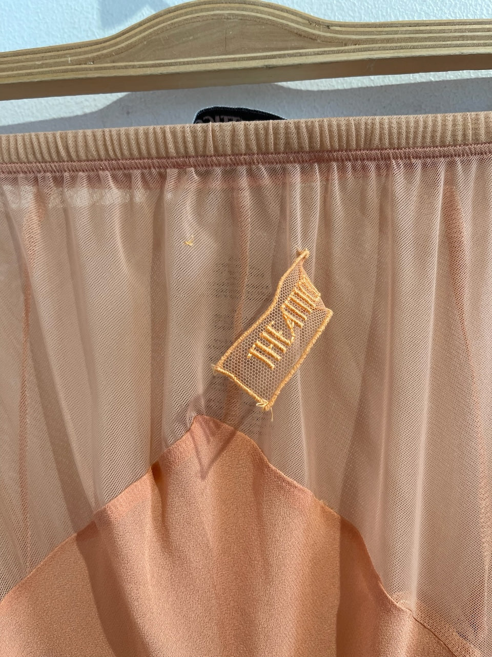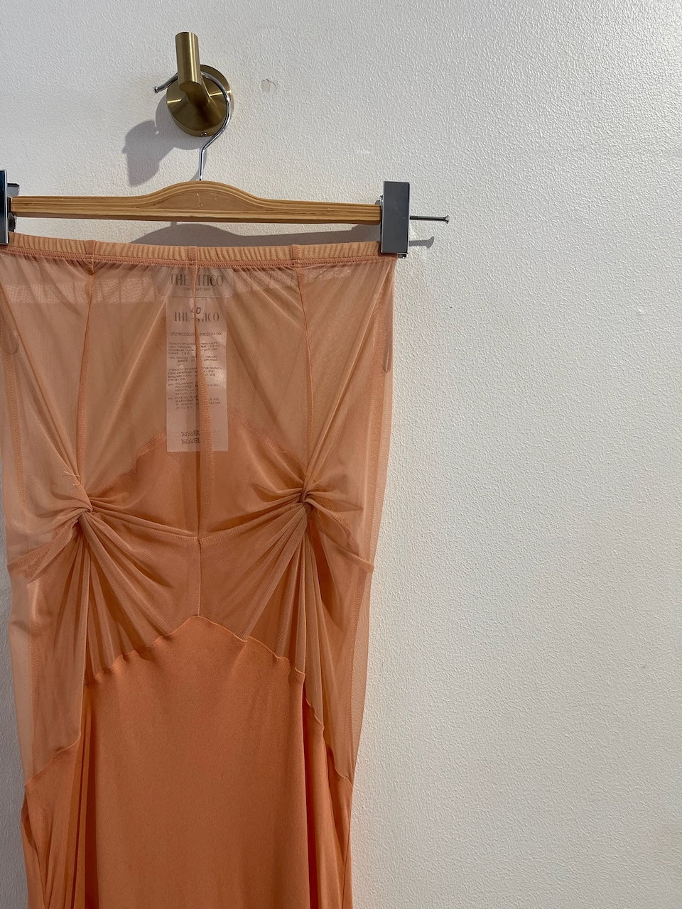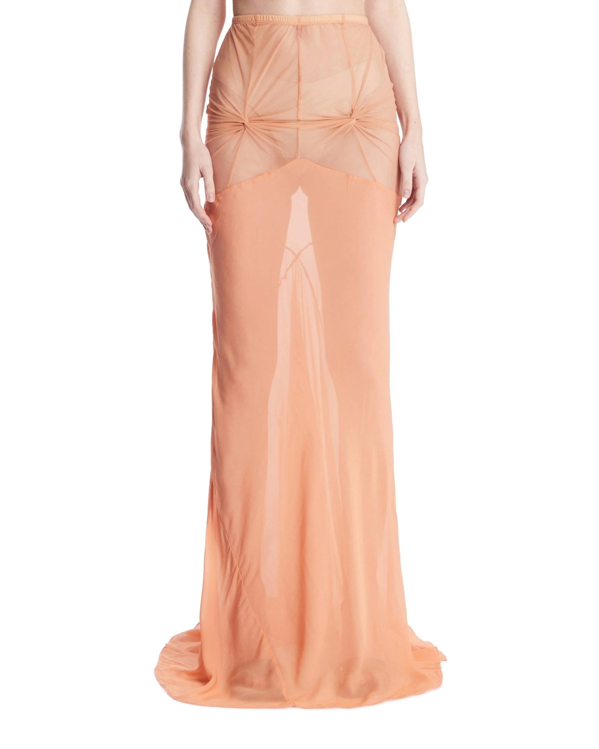 Jupe longue en polyamide orange pâle avec détails de transparence et effet noué à l'avant. Taille élastique.